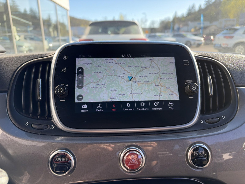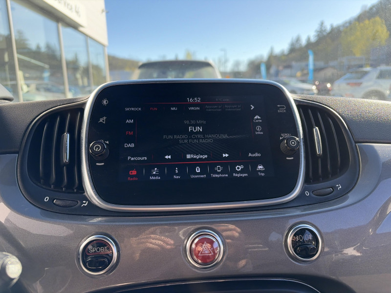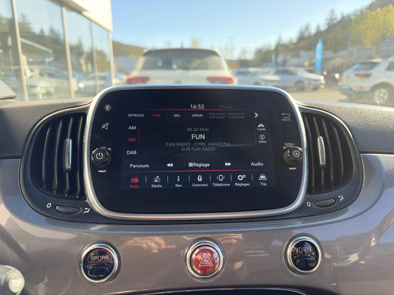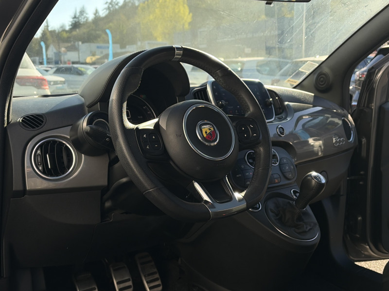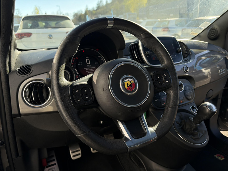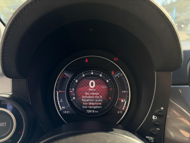 Volant cuir avec point milieu et branche inférieur couleur aluminium / ABS, EBD, MSR, AFU, ASR, ESP et "Hill Holder" / Airbags conducteur & passager, Airbag genoux conducteur, Airbags rideaux & Latéraux AV / Amortisseurs Cofap AV avec valve FSD / Banquette AR rabattable 50/50 avec 2 appui-tête réglables en hauteur / Disques de freins 284mm x 22mm auto-ventilés à l'AV et 240mm x 11mm à l'AR / Double sortie d'échappement chromée / Ecran couleur TFT 7" multifonctions / Kit 595 monté en usine - Pédalier métal, kits de tapis avec logo Abarth, seuils de porte Abarth / Kit de réparation de pneu Fix & Go avec bombe anti-crevaison / Manomètre de mesure de pression du turbo / Mode Sport : fonction qui agit sur les performances moteur, sur le système de freinage, ainsi que sur la direction / Option négative Kit + MO Distributeur / Poignées de portes, de coffre et baguette entourant le logo AV chrome satiné et coques de rétroviseurs extérieurs couleur carrosserie / TTC (Torque Transfer Control) : contrôle électronique du transfert de couple / Uconnect 7'' HD LIVE (écran tactile 7'' HD, bluetooth, audio streaming, commande vocale, port USB et et AUX, commandes au volant, services LIVE)