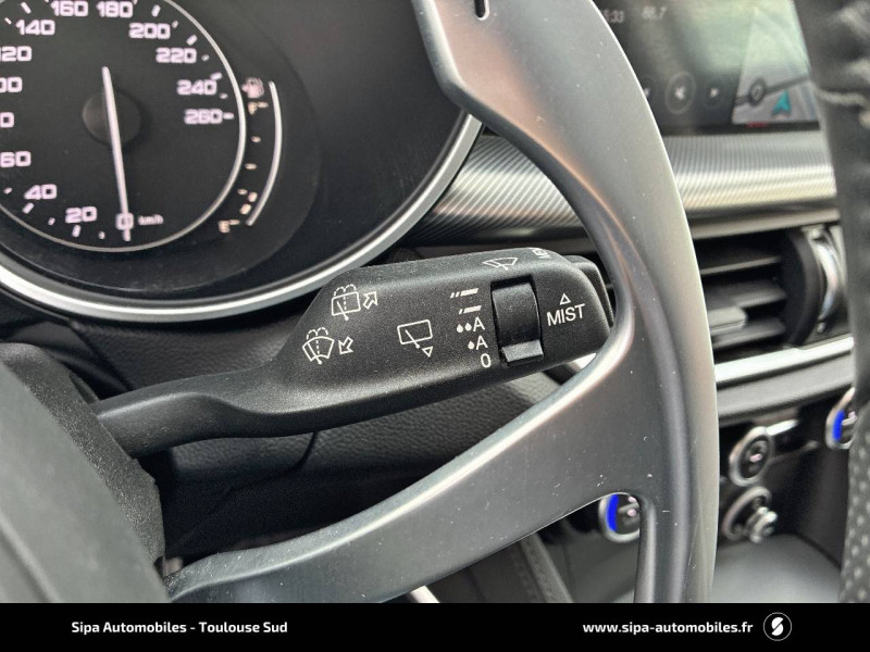 Alfa Connected Services / Buses de lave-glaces chauffantes / Calandre "V" noir / Caméra de recul avec lignes indicatrices / Ciel de toit sombre / Diffuseur Sprint Noir / Double sortie d'échappement noir / Eclairage diurne (signature lumineuse) à LED / Fixation siège enfant de type Isofix / Inserts en aluminium planche de bord, portières et contre-portes / Instrumentation de bord 7" TFT couleur / Jantes alliage 19" Competizione Avec pneumatiques ete / Kit de réparation pneumatiques Fix & Go / Ouverture des portes mains libres avec éclairage des poignées de porte / Palettes au volant en aluminium / Pédalier en aluminium / Pommeau de vitesse sport / Prises USB frontales + prises USB AR / Projecteurs Bi-Xénon 35W auto-directionnels avec lave-phares / Rétroviseur intérieur photochromatique / Rotary Pad / Sélecteur de mode de conduite Alfa DNA / Sellerie Alfatec/Tissu / Seuils de portes en aluminium / Système Alfa Connect (Radio, MP3, Aux-in, Bluetooth) avec écran panoramique 8,8" tactile, Navigation 3D et cartographie Europe / Systeme d'aide à la descente Hill Descent Holder / Système d'alertes anticollisions (FCW) avec détection piétons / Système d'amélioration de la qualité de l'air / Système de détection des angles morts avec détection d'obstacles transversaux actif / Système de freinage intégré (IBS) / Tapis de sol noirs / Volant en cuir avec bouton de démarrage intégré