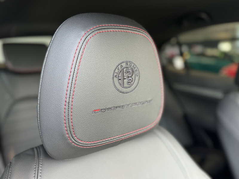 Aérateur de climatisation places AR / Alfa Connected Services / Badge Competizione / Buses de lave-glaces chauffantes / Caméra de recul avec lignes indicatrices / Ciel de toit sombre / Cockpit digital 12.3'' / Contour de vitres noir / Coques de rétroviseurs noires / Diffuseur spécifique Veloce / Double sortie d'échappement noir / Eclairage adaptatif (feux de croisement/feux de route) / Eclairage diurne (signature lumineuse) à LED / Etriers de frein noir / Fixation siège enfant de type Isofix / Hayon à ouverture main-libres / Inserts en aluminium planche de bord, tunnel central et portières / Jantes alliage 21" Speciale Scuro Avec pneumatiques été / Kit de réparation pneumatiques Fix & Go / Ouverture des portes mains libres avec éclairage poignées de porte / Pack Ambiance Veloce / Palettes au volant en aluminium / Peinture Pastel Rouge Alfa / Planche de bord en cuir avec surpiqûres rouges et gris / Pommeau de vitesse sport / Prise de coffre auxiliaire 230V / Prises USB frontales + prises USB AR / Projecteurs Matrix Full-Led adaptatifs avec fonction anti-brouillard / Réglage électrique des sièges AV 6 positions / Rétroviseur intérieur photochromatique / Rotary Pad / Sélecteur de mode de conduite Alfa DNA / Sellerie cuir Sport noir avec surpiqûres rouges et gris / Seuils de portes en aluminium / Sièges sport en cuir avec soutien latéral réglable électriquement / Suspension Active Alfa / Système Alfa Connect avec écran 8,8" tactile , navigation 3D Europe / Système audio 900W by Harman Kardon 14 HP (avec subwoofer) / Système audio Harman Kardon / Systeme d'aide à la descente Hill Descent Holder / Système d'alertes anticollisions (FCW) avec détection piétons / Système d'amélioration de la qualité de l'air / Système de détection des angles mort avec détection d'obstacles / Système de freinage intégré (IBS) / Tapis de sol noirs / V de calandre noir