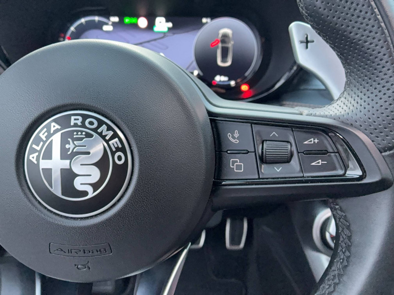 6 airbags (conducteur et passagers AV, latéraux, rideaux, genoux conducteur) / Accoudoir AV intégré dans le tunnel central / Alerte de collision AV / Alerte de rappel de présence sur les sièges AR / Alfa Connect Services / Assistant de vitesse intelligent (ISA) / Banquette AR 60/40 avec trappe à ski / Câble de recharge Type 2 Mode 3 / Caméra de recul avec lignes dynamiques / Capteur de pression des pneumatiques TPMS / Ciel de toit sombre / Combiné d'instruments digital 12,3" Cannochiale / Coques de rétroviseurs Noir brillant / Détection de fatigue du conducteur / Diffuseur noir / Double sortie d'échappement chromée / Enjoliveurs de moyeux Alfa Romeo en blanc et noirs / Etriers de frein rouges Brembo / Freinage d'urgence autonome urbain / Jantes alliage 19" Veloce avec pneumatiques été A+, Dimensions: 235/45 R19 / Jupes latérales noires / Kit anti-crevaison / Lame AV noir / Navigation Europe / Pack Hiver Buses de lave glace chauffantes, Sièges AV chauffants, Volant chauffant / Pack Ti Sellerie sport noir (cuir [dossier et assise] et matériaux synthétiques), Sièges AV chauffants et ventilés, Éclairage d'ambiance 5 couleurs, Contours de vitres Glossy Black, Réglage lombaire électrique à 4 positions pour conducteur et passager, Sièges électriques AV 8 positions conducteur et passager / Palettes au volant en aluminium / Pédalier en aluminium / Peinture Pastel Rouge Alfa / Prise USB AR type A + C (Charge) / Prise USB AV type A + C (Charge et données) / Projecteurs adaptatifs Full-Led Matrix avec fonction anti-brouillard / Régulateur de vitesse adaptatif intelligent avec lecture des panneaux couplé avec navigation / Régulateur et limiteur de vitesse intelligent avec lecture des panneaux / Rétroviseur intérieur électrochrome / Scudetto noir / Sélecteur de mode de conduite DNA (3 modes + ESC OFF) / Seuils de portes en aluminium / Suspension à double valve Alfa DSV / Système d'info-divertissement 10,2" tactile / Tapis de sol AV/AR / Vitres AR privatives / Vitres AV/AR électriques avec fonction anti-pincement / Volant sport en cuir pleine fleur avec bouton de démarrage