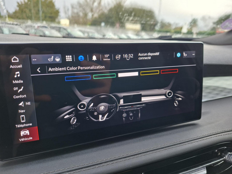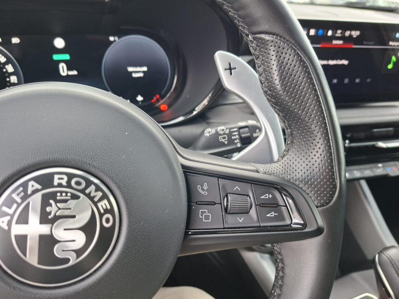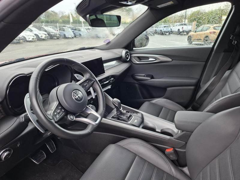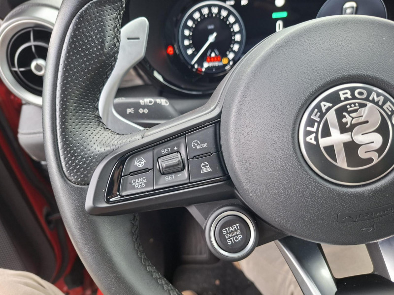 Aide au maintien dans la voie / Alerte de collision avant / Alerte de présence de passager arrière / Alfa Connected Services / Antenne de toit « aileron de requin » / Assistant de vitesse intelligent (ISA) / Badge spécifique / Bouton démarreur au volant / Caméra de recul avec lignes de guidage actives / Ciel de toit sombre / Cockpit digital 12,3" / Détecteur de fatigue du conducteur / Etriers de frein Brembo peints en rouge / Extension de garantie 2 ans / Feux de route automatiques / Freinage d'urgence autonome urbain / Jantes en alliage 20" Speciale Scuro / Kit anti-crevaison / Lumière d'ambiance intérieure configurable (5 couleurs) / Pédalier en aluminium / Peinture pastel Rouge Alfa / Prise USB type A et C / Prises 12V (console centrale et coffre) / Prises USB Type A et C pour passagers arrière / Projecteurs adaptatifs Full LED Matrix / Réglage lombaire électrique 4 directions - conducteur / Rétroviseur intérieur électrochrome / Scudetto finition Dark Miron / Sélecteur de mode de conduite Alfa DNA / Sellerie en Alcantara noir avec surpiqûres rouges / Seuil de portes en aluminium / Système audio à 6 haut-parleurs / Système d'info-divertissement 10,2" tactile / Tapis de sol avant et arrière / Trappe à ski dans la banquette arrière / Vitres avant et arrière électriques à fonction anti-pincement / Volant Sport en cuir pleine fleur