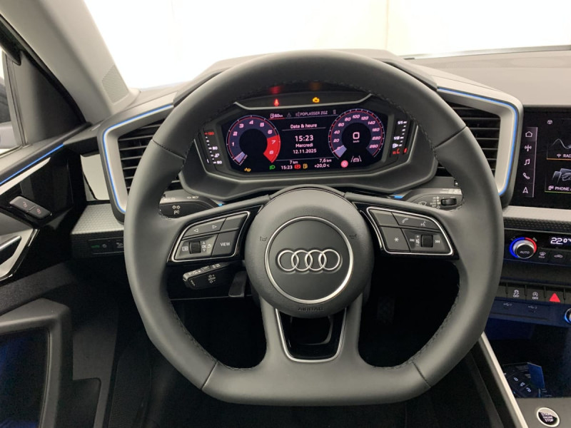 Interface Bluetooth / Audi Pre Sense front / Ciel de pavillon en tissu Gris Titane / Système de lecture des panneaux de signalisation par caméra / Airbags latéraux à l'AV et système d'airbags de tête / Audi Smartphone Interface / Applications décoratives étendues sur le tableau de bord façon verre en noir, de l'écran couleur MMI touch jusqu'aux triangles de portières AV façon verre en noir / Applications décoratives structure polygone en laque fine Ardoise / Applications décoratives étendues en laque diamant Gris Argent dans l'insert du diffuseur d'air et de la console centrale ainsi que dans la poignée de la commande intérieure de verrouillage des portières / Volant en cuir style 3 branches avec multifonctions / Châssis standard / Sellerie tissu Novum pour sièges sport à l'AV / Détecteur d'occupation des sièges / Trousse de secours avec triangle de présignalisation / Cléà fréquence radio / Frein à main manuel en revêtement plastique / Pare-brise en verre athermique avec bande grise sur la partie supérieure du pare-brise / Calandre en Noir Titane / Prises d'air latérales à l'AV en noir mat grainé avec encadrement C en Noir Titane / Détecteur de pluie et de luminosité / Rétroviseur intérieur jour/nuit manuel / Digital cockpit / Encadrement de calandre en Argent Aluminium mat / Feux AR rouges / Eclairage intérieur / Lèvres de becquet latérales à l'AV en noir mat grainé / Phares et feux AR à LED, avec clignotants dynamiques à AR / Diffuseur AR en noir titane mat / MMI Radio plus / Préparation pour la navigation MMI plus et Audi virtual cockpit / Boîtiers de rétroviseurs extérieurs couleur carrosserie / Set de réparation pour pneus / Appel d'urgence Audi connect et services / Accoudoirs de portières en matériaux synthétiques AV / Câbles de recharge pour téléphone portable / Moulures de seuil avec insert en aluminium à l'AV /