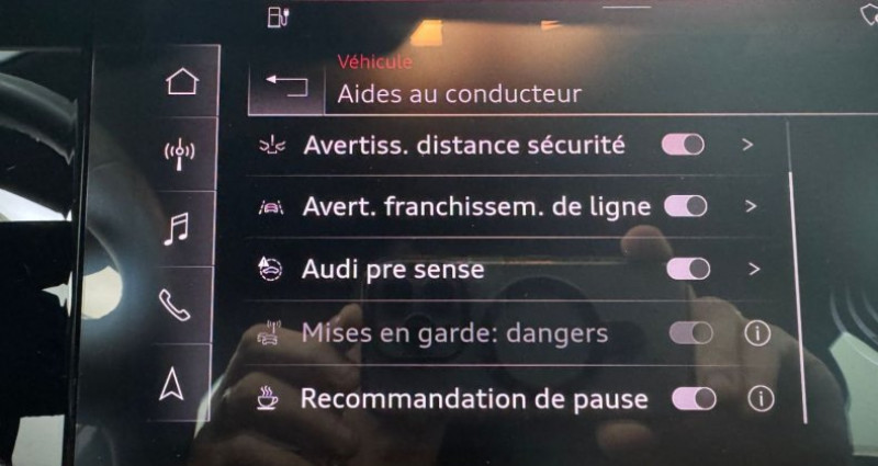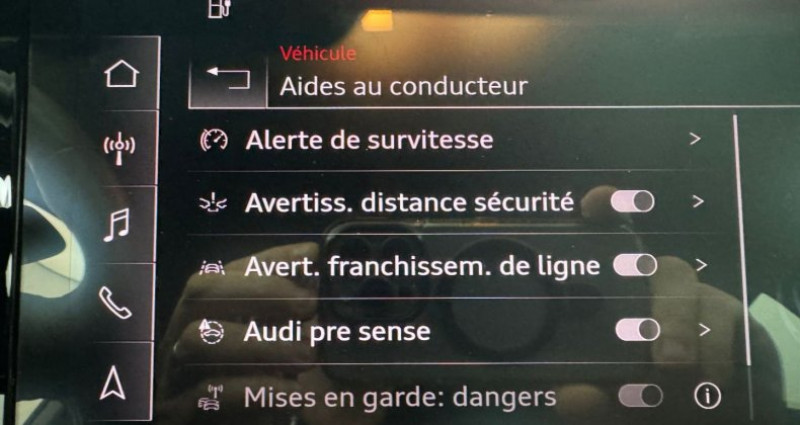 Cylindrée : 1395 cm3 EQUIPEMENTS Audi Connect Appel d'urgence, Alerte de sortie de voie, Audi pre sense front, Boîtiers de rétroviseurs extérieurs dans la couleur de la carrosserie, Clé à fréquence radio (sans safelock), Appel d'urgence Audi connect, Audi Drive Select, Applications décoratives effet spécial soie, 6 HP (passifs), MMI Radio Plus, Climatisation automatique confort 2 zones, Dispositif de limitation de vitesse, Ciel de pavillon en tissu, Extérieur classic avec calandre Noir mat et diffuseur Noir mat, I/Size et Top Tether pour les sièges AR extérieurs, Commande de désactivation de l'airbag passager AV, Interface Bluetooth, Réception radio numérique (DAB), Régulateur de vitesse, Détecteur de pluie et de luminosité, Direction assistée électromécanique asservie à la vitesse, Contrôle de la pression des pneus, Eclairage intérieur, Volant cuir multifonctions Plus 3 branches avec palettes de commande au volant, Sièges AV classiques, Sièges AV réglables manuellement: Hauteur et positionnement en longueur Inclinaison de dossier Hauteur des appuie/tête et des ceintures, Sellerie tissu Index, Peinture métallisée Gris Manhattan, Rétroviseur intérieur jour/nuit automatique sans encadrement, Caméra de recul, Audi virtual cockpit, Navigation MMI plus avec MMI touch, Accoudoir central coulissant en longueur avec inclinaison réglable, Dossier de banquette AR rabattable 40:60, Rétroviseurs extérieurs réglables électriquement et dégivrants, Pare/brise à vitrage acoustique, Phares à LED avec clignotants dynamiques AR, Jantes en alliage léger 17 5 branches parallèles 8 0 J x 17 pneus: 225/45 R17, Appui lombaire à 4 axes pour les sièges AV : réglages électrique horizontal et vertical, Audi park assist,