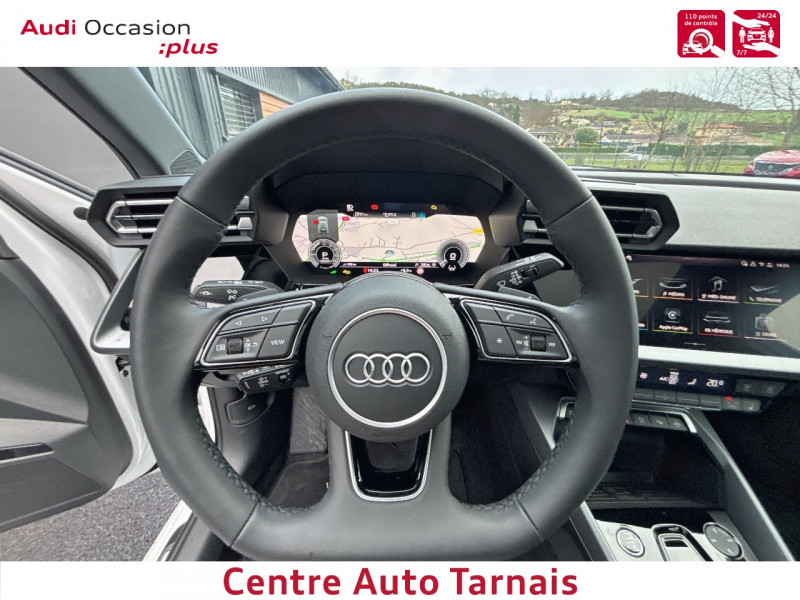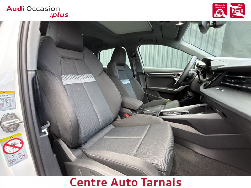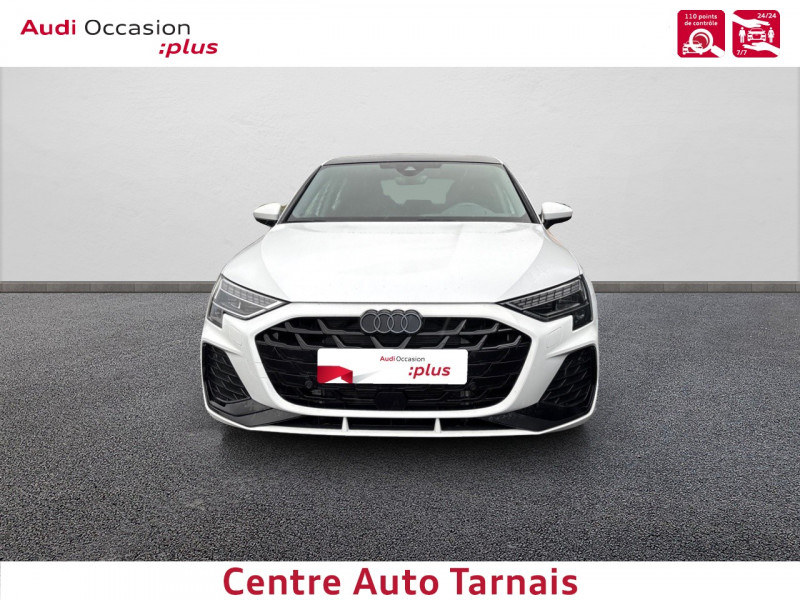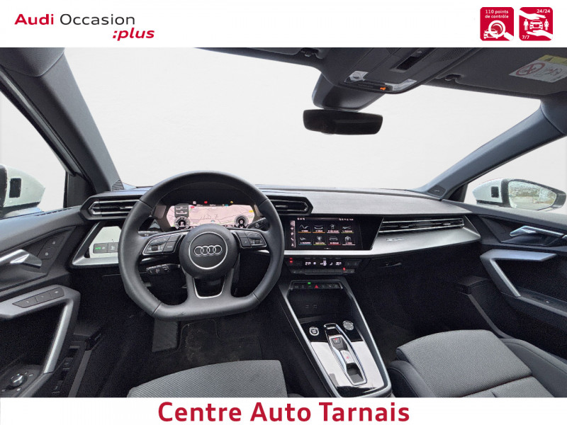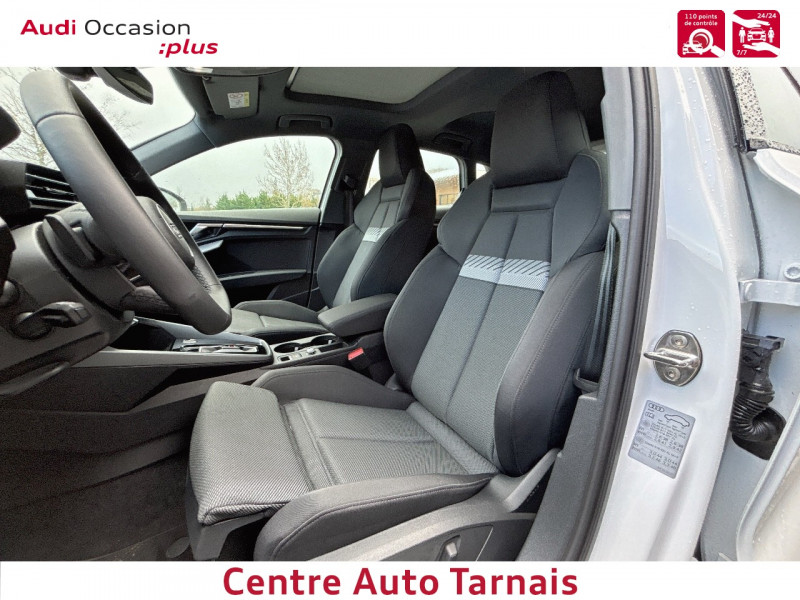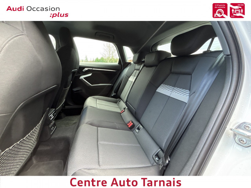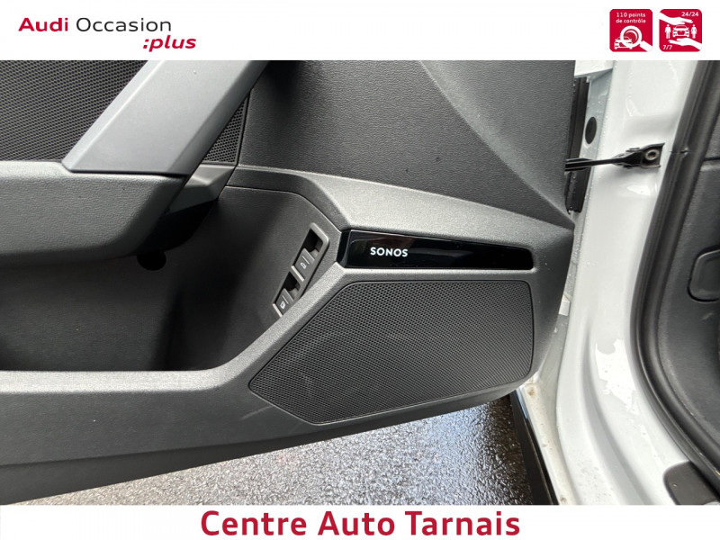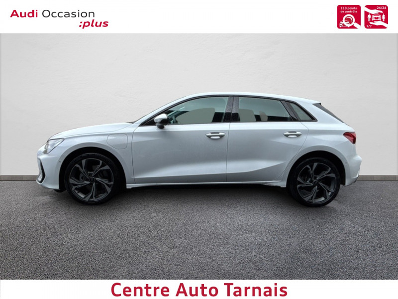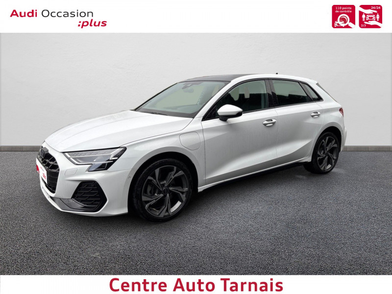 Applications décoratives en aluminium Spectre foncé (au tableau de bord) / Audi park assist plus avec caméra 360° L'aide au stationnement plus peut aider à entrer et à sortir des places de stationnement qui peuvent être limitées par des véhicules ou des objets. Le système prend le contrôle de la direction, de l'accélération, du freinage et du changement de vitesse / Boîte automatique S Tronic 6 vitesses / Jantes en alliage léger 18", 5 branches en Y Gris Graphite, tournées brillantes, 8,0 J x 18" 225/40 R18 / Pack extérieur S line / Pack intérieur S line / Phares à LED avec clignotants dynamiques AR / Rétroviseur intérieur jour/nuit automatique sans encadrement / Rétroviseurs extérieurs réglables, dégivrants, rabattables électriquement avec fonction rabat automatique / Volant cuir Sport multifonctions Plus 3 branches avec méplat et palettes de commande au volant / 2 ports de charge USB AR / Accoudoir central coulissant en longueur, avec inclinaison réglable / Airbags latéraux AV et système d'airbags de tête / Appui lombaire à 4 axes pour les sièges AV : réglages électrique, horizontal et vertical / Audi connect Appel d'urgence & Service / Audi Drive Select / Audi Hold Assist / Audi phone box light / Audi pre sense front / Boîtiers de rétroviseurs extérieurs dans la couleur de la carrosserie / Clé confort incluant déverrouillage du coffre par capteur (sans safelock) - Accès et démarrage du véhicule mains libres (keyless access) - Déverrouillage du hayon via la touche "coffre" de la télécommande ou en simulant un mouvement de pied dans la zone AR du véhicule (ouverture et fermeture). / Cléà fréquence radio (sans safelock) Verrouillage central "Keyless-Go" verrouille et déverrouille les portes, le capot de coffre et la trappe à carburant ; incluant ouverture/fermeture confort des vitres / Commande de désactivation de l'airbag passager AV / Contrôle de la traction (TCS) / Câble de recharge mode 3 pour recharge publique 11kW / Câble de recharge type E/F (8A) / Câbles de recharge pour téléphone portable compatibles Apple et Android / Direction assistée électromécanique, asservie à la vitesse / Dispositif de limitation de vitesse / Détecteur de pluie et de luminosité / Détection de signalisation routière par caméra / Ecrous de roues antivol / I-Size et Top Tether pour les sièges AR extérieurs / Kit réparation / MMI Radio Plus / Outillage de bord / Pare-brise à vitrage acoustique / Rappel de ceinture de sécurité avec dispositif AR de détection d'occupation du siège / Sièges AV réglables manuellement: Hauteur et positionnement en longueur, Inclinaison de dossier, Hauteur des appuie-tête et des ceintures / Système de recharge e-tron compact / Sécurité enfant électrique / Tapis de sol AV/AR / Trousse de secours, triangle de présignalisation et 2 vestes de sécurité / Vitrage Privacy : lunette AR, vitres de portières AR et vitres latérales AR surteintées