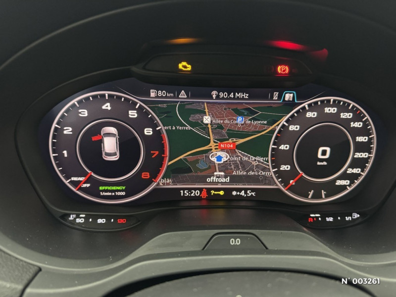 Audi Sound System / Audi Virtual Cockpit / Câbles de recharge pour téléphone portable, compatibles iPhone et Android / Buses de lave-glace degivrantes / Applications décoratives en Aluminium Mistral / Audi Connect avec une carte SIM de données intégrée (valable pour 36 mois) / Audi Hold Assist / Audi Drive Select / Audi Smartphone Interface (Apple CarPlay ou Google AndroidAuto) / Audi Parking System Plus: Signal acoustique et visuel d'aide au stationnement AV et AR par pictogrammes sur l'écran / Advanced Key Système de vérrouillage et de dévérouillage du véhicule sans utilisation de la clé. Démarrage et arrêt du moteur main libre par touche start/stop / Airbags latéraux (airbag thorax et bassin à l'AV) / Airbags frontaux côté conducteur et passager avec airbag de genoux et désactivation de l'airbag passager / Appuis-tête AV et AR intégraux / ASR (antipatinage) pour une motricité et une rigidité transversale optimale. Réduit le patinage des roues motrices. / Jauge de niveau de liquide lave-glace / Lecteur CD/MP3 avec un slot pour carte SD / Navigation MMI Plus avec MMI Touch: Système de navigation / Phares intégralement à LED (full LED) avec clignotants AR dynamiques / Récupération d'énergie, générée lors des phases de freinage ou de décélération et système Start/Stop permettant une économie de carburant / Rétroviseur intérieur jour/nuit automatique / Rétroviseurs extérieurs couleur carrosserie / Fixations ISOFIX pour sièges enfant pour le siège du passager AV + aux places extérieures AR avec sytème d'ancrage ""Top Tether"" / Interface Bluetooth / Jantes en aluminium coulé Audi Sport style 10 branches en D, style titane mat tournées brill. dim. 7.5Jx18 avec pneus 225/40 R18 / Pare-brise acoustique avec isolation acoustique / Compresseur et produit de colmatage en cas de crevaison / Détecteur de pluie et de luminosité / Ecrous de roues antivol / Frein de stationnement électromécanique / Freins à disques sur les essieux AV et AR / Casquette de toit / Ciel de pavillon en tissu Gris roche / Contrôle électronique de stabilisation (ESC): comprend les fonctions ABS, EBV, ASR et EDS / Point de fixation multiples + Filet dans la garnitures latérales + araignée de coffre / Audi Smartphone Interface avec 2 câbles adaptateur / Vide-poches au niveau des pieds côté passager à l'AV / Vide-poches sous la banquette AR (incluant 2 vestes de sécurité) / Lecteur de carte SDXC supplémentaire (jusqu'à 2 To) / Préparation de navigation (fonction de navigation et cartographie disponibles comme équipement ultérieur dans les Accessoires d'Origin Audi) / Audi Music Interface / Lumière réfléchie à LED pour la console centrale et l'intérieur des portières / 2 Spots de lecture AV et AR / Prise 12V dans la console centrale AR / Porte-boissons éclairés / Filet de rangement au dos des sièges AV / Prise 12V dans le coffre / Diffuseurs d'air, la boîte à gants, le bouton de réglage des rétroviseurs, le lève-vitres en Aluminium / Eclairage au sol et éclairage au niveau des pieds à l'AV ainsi qu'éclairage des poignées intérieures de portières / Encadrement de la commande intérieure de verrouillage des portières en Aluminium / Porte-monnaie, touches de commande du frein de stationnement en Aluminium / Tapis de sol AV/AR / Système d'airbags de tête / Triangle de présignalisation + trousse de secours / Encadrement des vitres latérales et baguettes en aluminium anodisé / Vitres latérales et AR athermique / Rétroviseurs extérieurs avec clignotants à LED intégrés / Sécurité enfants activable électriquement / Rétroviseurs extérieurs réglables, dégivrants et rabattables électriquement avec position automatique pour manoeuvre de stationnement