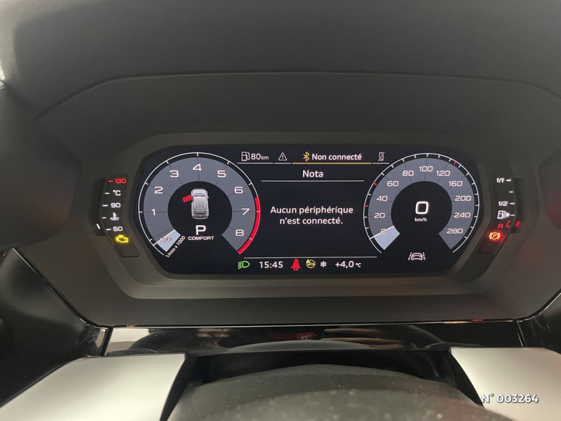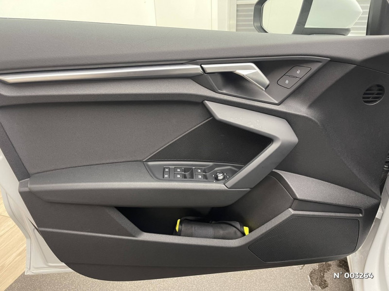 Boîtiers de rétroviseurs extérieurs dans la couleur de la carrosserie / Audi smartphone interface / Câbles de recharge pour téléphone portable compatibles Apple et Android / Combiné d'instruments numérique Digital Cockpit 10,25" / Ciel de pavillon en tissu / Appuis lombaires à 4 axes pour les sièges AV / Audi Drive Select / Audi phone box light / Audi park assist : cherche à l'aide de capteurs à ultrasons les places de stationnement (bataille et créneau) appropriées le long de la chaussée, calcule le créneau idéal et gère le braquage automatiquement / Audi pre sense front / 6 HP (passifs) / 2 ports de charge USB AR / Airbags latéraux AV et système d'airbags de tête / Accoudoir central coulissant en longueur, avec inclinaison réglable / Alerte de sortie de voie / Applications décoratives effet spécial soie / Jantes en alliage léger 17", 5 branches parallèles, 8,0 J x 17", pneus: 225/45 R17 / I-Size et Top Tether pour les sièges AR extérieurs / MMI Radio Plus / Pack Aluminium Intérieur / Outillage de bord / Pare-brise à vitrage acoustique / Extérieur classic avec calandre Noir mat et diffuseur Noir mat / Interface Bluetooth / Kit réparation / Direction assistée électromécanique, asservie à la vitesse / Dispositif de limitation de vitesse / Ecrous de roues antivol / Eclairage intérieur / Cléà fréquence radio (sans safelock) / Commande de désactivation de l'airbag passager AV / Détecteur de pluie et de luminosité / Volant cuir multifonctions Plus 3 branches avec palettes de commande au volant / Système Start & Stop avec récupération d'énergie au freinage / Trousse de secours, triangle de présignalisation et 2 vestes de sécurité / Revêtement Noir Brillant sur les montants de pavillon centraux et AR / Baguette sur les entourages de vitre en aluminium anodisé / Sellerie tissu "Debut 2" / Rétroviseurs extérieurs réglables, dégivrants, rabattables électriquement avec fonction rabat automatique / Rétroviseur intérieur jour/nuit automatique sans encadrement / Sécurité enfant électrique / Sièges AV réglables manuellement: Hauteur et positionnement en longueur, Inclinaison de dossier, Hauteur des appuie-tête et des ceintures / Tapis de sol AV/AR / Rappel de ceinture de sécurité avec dispositif AR de détection d'occupation du siège / Préparation pour appareil de navigation / Régulateur de vitesse plus limiteur de vitesse