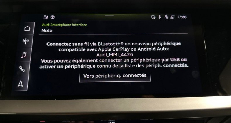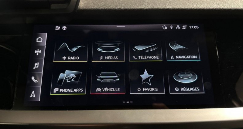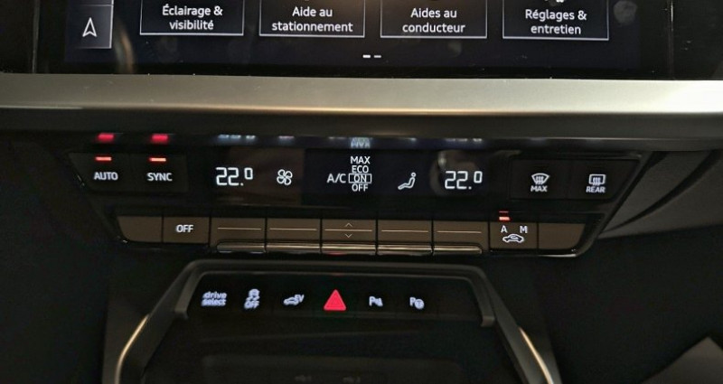Cylindrée : 1395 cm3 Nb. Vitesse : 6 - Sièges AV Sport - Audi Connect Navigation et Divertissement - Audi Connect Navigation et Divertissement Plus - Audi park assist : cherche à l'aide de capteurs à ultrasons les places de stationnement (bataille et créneau) appropriées le long de la chaussée, calcule le créneau idéal et gère le braquage automatiquement - Audi virtual cockpit - Climatisation automatique confort 2 zones - Jantes en alliage léger 17, 5 branches parallèles, 8,0 J x 17, pneus: 225/45 R17 - Navigation MMI plus avec MMI touch - Pack Aluminium Intérieur - Pack Brillance Extérieur *** Avec : Revêtement Noir Brillant sur les montants de pavillon centraux et AR *** Avec : Baguette sur les entourages de vitre en aluminium anodisé - Phares à LED avec clignotants dynamiques AR - Rétroviseur intérieur jour/nuit automatique sans encadrement - Rétroviseurs extérieurs réglables, dégivrants, rabattables électriquement avec fonction rabat automatique, (côté passager AV, marche AR enclenchée) et fonction jour/nuit automatique des deux côtés - Volant cuir multifonctions Plus 3 branches avec palettes de commande au volant - 6 HP (passifs) - Accoudoir central coulissant en longueur, avec inclinaison réglable - Airbags latéraux AV et système d'airbags de tête - Alerte de sortie de voie - Appel d'urgence Audi connect - Applications décoratives effet spécial soie - Appui lombaire à 4 axes pour les sièges AV : réglages électrique, horizontal et vertical - Audi Connect Appel d'urgence - Audi Drive Select - Audi pre sense front - Boîtiers de rétroviseurs extérieurs dans la couleur de la carrosserie - Caméra de recul - Ciel de pavillon en tissu - Clé à fréquence radio (sans safelock) - Combiné d?instruments numérique Digital Cockpit 10,25 - Commande de désactivation de l'airbag passager AV - Contrôle de la pression des pneus - Câble de recharge HH Type E (8 A) - Direction assistée électromécanique, asservie à la vitesse - Dispositif de limitation de vitesse - Dossier de banquette AR rabattable 40:60 - Détecteur de pluie et de luminosité - Eclairage intérieur - Ecrous de roues antivol - Extérieur classic avec calandre Noir mat et diffuseur Noir mat - I-Size et Top Tether pour les sièges AR extérieurs - Interface Bluetooth - Kit réparation - Outillage de bord - Pare-brise à vitrage acoustique - Rappel de ceinture de sécurité avec dispositif AR de détection d'occupation du siège - Réception radio numérique (DAB) - Récupération d'énergie - Régulateur de vitesse - Sièges AV classiques - Sièges AV réglables manuellement: Hauteur et positionnement en longueur, Inclinaison de dossier, Hauteur des appuie-tête et des ceintures - Système Start & Stop avec récupération d'énergie au freinage - Sécurité enfant électrique - Tapis de sol AV/AR - Trousse de secours, triangle de présignalisation et 2 vestes de sécurité