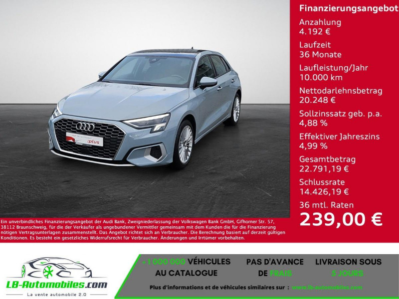 Référence : 1132775 Vos Avantages chez LB-AUTOMOBILES.com / Prix affiché TTC Livré hors carte grise / Livraison sous 10 jours dans toute la France hors 31 / Pas d?avance de frais paiement du véhicule 100% à la livraison par virement. Audi A3 Sportback Neuf remisée, Audi A3 Sportback Occasion Toulouse Beaupuy 31850, Audi A3 Sportback Véhicule sorti de réseau collaborateur, Audi A3 Sportback import, Audi A3 Sportback importateur, Audi A3 Sportback Livraison possible dans toute la France sous 5 jours, Audi A3 Sportback, Audi A3 Sportback Location Option Achat, Audi A3 Sportback LLD, Audi A3 Sportback Longue Durée, Audi A3 Sportback TVA récupérable. Possibilité d'extension de garantie 12, 24,36 mois, Pour tout autres voitures import neufs ou occasions collaborateur fortement remisée, Mandataire Audi, Mandataire BMW, Mandataire Volkswagen, Mandataire Mercedes, Mandataire Peugeot Espagne, Mandataire Renault Espagne, Porsche import, Mandataire Citroën Espagne, Mandataire Seat Espagne, n'hésitez pas à nous contacter. « Sous réserve de vente préalable et erreur de saisie » Principaux équipements : - ABS - Accoudoir - Antidémarrage - Assistance au freinage d'urgence - Avertisseur de franchissement de ligne - Bluetooth - Capteur de lumière - Capteur de pluie - Carnet d'entretien - Chauffage auxiliaire - Cockpit numérique - Contrôle de la pression des pneus - Direction assistée - Éclairage d'ambiance - Écran tactile - ESP - Fermeture centralisée - Feux de jour LED - Garantie - GPS - Isofix - Jantes alliage - Kit mains libres - Ordinateur de bord - Phares LED - Radio DAB - Rétroviseur extérieur électrique - Sièges chauffants - Sièges sport - Streaming musical intégré - Système antipatinage - Système d'appel d'urgence - Système de limitation de la vitesse - Système Stop & Start - Toit ouvrant - Toit panoramique - Traction avant - Tuner/radio - Véhicule non-fumeur - Vitres électriques - Volant en cuir - Volant multifonction