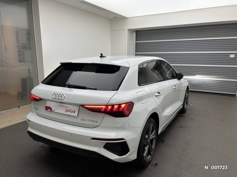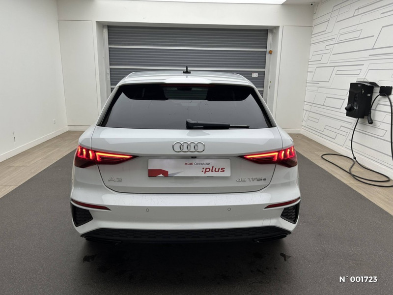 2 ports de charge USB AR / Accoudoir central coulissant en longueur, avec inclinaison réglable / Accoudoir de portière en matière synthétiques / Airbags latéraux à l'AV et système d'airbags de tête / Alerte de sortie de voie / Applications décoratives en aluminium Spectre foncé / Audi Connect navigation et divertissement plus / Audi Drive Select / Audi park assist : cherche à l'aide de capteurs à ultrasons les places de stationnement (bataille et créneau) appropriées le long de la chaussée, calcule le créneau idéal et gère le braquage automatiquement / Audi smartphone interface (Apple CarPlay ou Google Android Auto) / Audi virtual cockpit : combiné d'instruments entièrement numérique de 10,25'' / Audi sound system : 10 HP incluant un HP central et un subwoofer, amplificateur à 6 canaux avec une puissance totale de 180 watts / Audi pre sense front / Ciel de pavillon en tissu noir / Câble de recharge HH Type E (8 A) / Câbles de recharge pour téléphone portable compatibles Apple et Android / Détecteur de pluie et de luminosité / Cléà fréquence radio (sans safelock) / Commande de désactivation de l'airbag passager AV / Direction assistée électromécanique, asservie à la vitesse / Eclairage intérieur Module de pavillon à l'AV et à l'AR, incluant spots de lecture, Boîte à gants éclairée, Éclairage de coffre à droite, / Ecrous de roues antivol / Dispositif de limitation de vitesse / Etriers de frein rouges / Extérieur Sport / Hold Assist / Interface Bluetooth / Pack Esthétique Noir / Outillage de bord / MMI Navigation plus avec MMI touch / Kit réparation / I-Size et Top Tether pour les sièges AR extérieurs / MMI Radio Plus / Jantes en alliage léger 18'', 5 branches doubles en V (style S), Gris Graphite 8,0J x 18", pneus 225/40 R18 / Pare-brise à vitrage acoustique / Rappel de ceinture de sécurité avec dispositif AR de détection d'occupation du siège / Phares à LED avec clignotants dynamiques AR / Pare-chocs PHEV Competition / Régulateur de vitesse plus limiteur de vitesse / Rétroviseur intérieur jour/nuit automatique sans encadrement / Sécurité enfant électrique / Seuils de portes AV avec insert en aluminium et illuminé / Sellerie tissu "Pouls" / Combinaison tissue pouls/en matière synthétiques avec estampagne S / Sièges AV réglables manuellement : hauteur d'assise, positionnement en longueur, inclinaison du dossier, hauteur des appuie-tête et hauteur des ceintures / Pédalier et repose-pieds en acier inoxydable / Trousse de secours, triangle de présignalisation et 2 vestes de sécurité / Système Start & Stop avec récupération d'énergie au freinage / Volant cuir multifonctions Plus 3 branches avec palettes de commande au volant / Vitrage Privacy : lunette AR, vitres de portières AR et vitres latérales AR surteintées / Logo S / Tapis de sol, AV et AR, en velours, noir avec surpiqûres / Frein à main en cuir synthétique