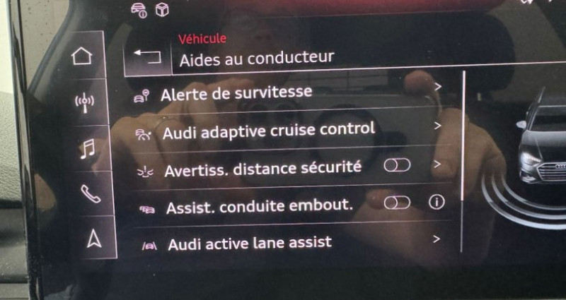 Cylindrée : 1968 cm3 EQUIPEMENTS Sièges AV chauffants, Rampes de pavillon en Aluminium poli, Airbags grand volume conducteur et passager AV, Détecteur de pluie et de luminosité, Coffre à ouverture et fermeture électriques, Commande de désactivation de l'airbag passager AV, Blocage électronique de différentiel EDS, Tire Mobility System Compresseur et produit de colmatage en cas de crevaison, Pack Brillance, Système d'information du conducteur avec écran couleur haute résolution de 7, Contrôle électronique de stabilisation (ESC), Protection antidémarrage électronique, Fixation pour sièges enfants ISOFIX et Top Tether pour les places AR extérieures, Climatisation automatique, Volant en cuir style 3 branches avec multifonctions, Feux AR à LED, Vitres athermiques, Rétroviseurs extérieurs avec feux clignotants à LED intégrés et dans la teinte du véhicule, Eclairage intérieur, Jantes en aluminium coulé style dynamique à 5 bras 7 5Jx17 avec pneus 225/50 R17, Identification du modèle selon le nouveau marquage de puissance, Ciel de pavillon en tissu selon la couleur intérieure choisie, Moulures de seuil avec insert en aluminium dans les ouvertures des portières AV, Dossier de banquette AR rabattable en 3 parties 40 : 20 : 40 ou complètement, Frein de stationnement électromécanique, Keyless Go: démarrage et arrêt du moteur par touche moteur Start/Stop sur la console centrale, Châssis : pour une bonne dynamique de conduite couplée à un confort de conduite souverain, Direction assistée électromécanique, Pare/soleil côtés conducteur et passager AV, Plancher de chargement réversible, S tronic boîte séquentielle 7 vitesses à double embrayage avec commande électrohydraulique, Phares AV à LED (feux de croisement feux de route feux diurnes et feux de position LED clignotants à ampoule avec éclairage tout/temps), Rétroviseur intérieur sans encadrement jour/nuit automatique, Ceintures de sécurité automatiques à 3 points pour tous les sièges contrôle de port de ceinture AV, Peinture métallisée Noir Mythic, Sécurité enfants, Caméra multifonction, 8 HP passifs, Affichage de contrôle de pression des pneus, Airbags latéraux à l'AV et système d'airbags de tête, Audi Parking System Plus, Caméra de recul, Appui lombaire à 4 axes pour les sièges AV: réglages électrique horizontal et vertical, Système de lecture des panneaux de signalisation par caméra, Augmentation de la capacité du réservoir à carburant à 54 litres, Augmentation de la capacité du réservoir d'AdBlue à 24 litres, Navigation MMI plus avec MMI touch, Audi Drive Select, Antipatinage ASR pour une motricité optimale empêche le patinage des roues motrices, Audi Pre Sense city, Sièges AV Sport, Appel d'urgence et service Audi connect avec commande du véhicule, Assistant de feux de route, Sellerie en tissu Système, Applications décoratives argent flex métallique, Audi active Lane Assist, Audi Adaptative Cruise Control, VOEU, Accoudoir central confort AV avec inclinaison réglable et coulissant en longueur, AVANT,