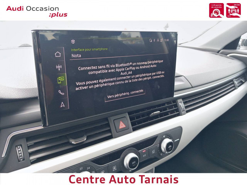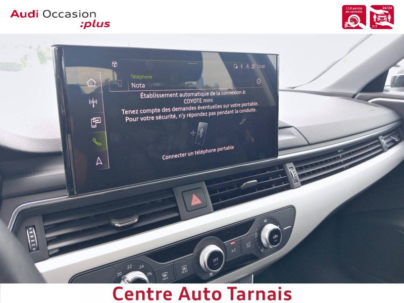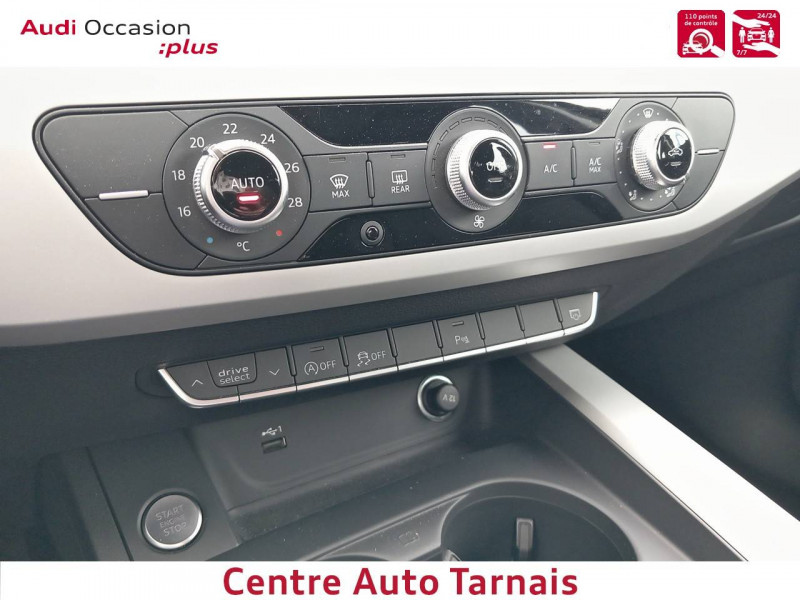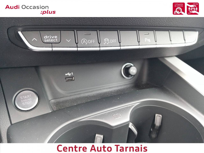 Audi Parking System: Signal acoustique d'aide au stationnement AR / Baguette enjoliveuse AR en argent aluminium mat / Calandre en noir titane laqué avec lamelles en argent aluminium mat / Ceintures de sécurité, automatiques à 3 points pour tous les sièges, contrôle de port de ceinture AV / Frein de stationnement électromécanique / Grilles d'entrée d'air latérales en noir mat grainé avec insert en argent aluminium mat / Jantes en aluminium forgé style 10 branches, 7.5Jx17'' avec pneus 225/50 R17 / Moulures de seuil avec insert en aluminium dans les ouvertures des portières AV / Navigation MMI plus avec MMI touch / Pack Brillance / Phares AV à LED (feux de croisement, feux de route, feux diurnes et feux de position LED, clignotants à ampoule, avec éclairage tout-temps) / Phares à LED, avec clignotants AR à LED dynamiques / Préparation pour crochet d'attelage / Préparation pour l'activation de la fonction de navigation / Rétroviseur intérieur sans encadrement jour/nuit automatique / Rétroviseurs extérieurs avec feux clignotants à LED intégrés et dans la teinte du véhicule / Rétroviseurs extérieurs réglables et escamotables électriquement, jour/nuit automatique, dégivrants des deux côtés et buses de lave-glaces dégivrantes / Volant en cuir style 3 branches avec multifonctions / 8 HP passifs / Accoudoir central confort AV avec inclinaison réglable et coulissant en longueur / Airbags latéraux à l'AV et système d'airbags de tête / Antipatinage ASR pour une motricité optimale, empêche le patinage des roues motrices / Appel d'urgence et service Audi connect avec commande du véhicule / Applications décoratives argent flex métallique / Appui lombaire à 4 axes pour les sièges AV: réglages électrique, horizontal et vertical / Audi Connect avec carte SIM intégrée (e-SIM) et licence d'utilisation pour 3 ans / Audi Drive Select / Audi Parking System Plus / Audi Pre Sense city / Audi smartphone interface (Apple CarPlay ou Google Android Auto) / Blocage électronique de différentiel EDS / Châssis : pour une bonne dynamique de conduite couplée à un confort de conduite souverain / Ciel de pavillon en tissu selon la couleur intérieure choisie / Coffre à ouverture et fermeture électriques / Colonne de direction de sécurité / Commande de désactivation de l'airbag passager AV / Contrôle électronique de stabilisation (ESC) / Câbles de recharge pour téléphone portable, compatibles iPhone et Android / Diffuseur AR en noir titane mat / Direction assistée électromécanique / Dispositif anti-erreur de carburant / Dossier de banquette AR rabattable en 3 parties 40 : 20 : 40 ou complètement / Détecteur de pluie et de luminosité / Eclairage intérieur / Ecrous de roues antivol / Extensions de bas de caisse couleur carrosserie / Filet de séparation vertical amovible / Finition extérieure Design / Fixation pour sièges enfants ISOFIX et Top Tether pour les places AR extérieures / Identification du modèle selon le nouveau marquage de puissance / Interface Bluetooth / Keyless Go: démarrage et arrêt du moteur par touche moteur Start/Stop sur la console centrale / Limitation de la vitesse maximale à 210 km/h / Plancher de chargement réversible / Pneus à roulage optimisé (faible résistance au roulement), 225/50 R 17 - Vmax = 210 km/h / Prise 12 V dans le coffre / Rampes de pavillon Noires / Recommandation de repos / Récupération Permet de réaliser des économies de carburant en récupérant l'énergie de décélération et de freinage / Réservoir AdBlue de 12 l / S tronic, boîte séquentielle 7 vitesses à double embrayage avec commande électrohydraulique / Sièges AV réglables manuellement en hauteur et en profondeur ; réglage manuel des appuie-tête en hauteur / Système d'information du conducteur avec écran couleur haute résolution de 7" / Sécurité enfants / Tapis complémentaires AV/AR / Tire Mobility System Compresseur et produit de colmatage en cas de crevaison / Trousse de secours avec triangle de présignalisation / Vide-poches dans les contre-portes à l'AV et à l'AR