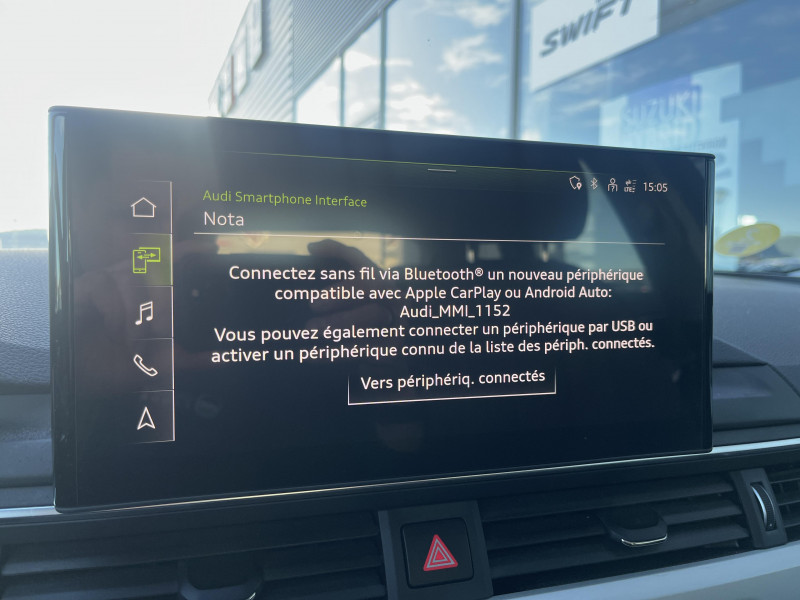 Baguette enjoliveuse AR en argent aluminium mat / Calandre en noir titane laqué avec lamelles en argent aluminium mat / Ceintures de sécurité, automatiques à 3 points pour tous les sièges, contrôle de port de ceinture AV / Frein de stationnement électromécanique / Grilles d?entrée d?air latérales en noir mat grainé avec insert en argent aluminium mat / Jantes en aluminium forgé style 10 branches, 7.5Jx17'' avec pneus 225/50 R17 / Moulures de seuil avec insert en aluminium dans les ouvertures des portières AV / Navigation MMI plus avec MMI touch / Phares AV à LED (feux de croisement, feux de route, feux diurnes et feux de position LED, clignotants à ampoule, avec éclairage tout-temps) / Phares à LED, avec clignotants AR à LED dynamiques / Préparation pour crochet d'attelage / Préparation pour l'activation de la fonction de navigation / Rétroviseur intérieur sans encadrement jour/nuit automatique / Rétroviseurs extérieurs avec feux clignotants à LED intégrés et dans la teinte du véhicule / Rétroviseurs extérieurs réglables et escamotables électriquement, jour/nuit automatique, dégivrants des deux côtés et buses de lave-glaces dégivrantes / Volant en cuir style 3 branches avec multifonctions / 8 HP passifs / Accoudoir central confort AV avec inclinaison réglable et coulissant en longueur / Airbags latéraux à l'AV et système d'airbags de tête / Antipatinage ASR pour une motricité optimale, empêche le patinage des roues motrices / Appel d'urgence et service Audi connect avec commande du véhicule / Applications décoratives argent flex métallique / Appui lombaire à 4 axes pour les sièges AV: réglages électrique, horizontal et vertical / Audi Connect avec carte SIM intégrée (e-SIM) et licence d'utilisation pour 3 ans / Audi Drive Select / Audi Parking System Plus / Audi Pre Sense city / Audi smartphone interface (Apple CarPlay ou Google Android Auto) / Blocage électronique de différentiel EDS / Châssis : pour une bonne dynamique de conduite couplée à un confort de conduite souverain / Ciel de pavillon en tissu selon la couleur intérieure choisie / Coffre à ouverture et fermeture électriques / Colonne de direction de sécurité / Commande de désactivation de l'airbag passager AV / Contrôle électronique de stabilisation (ESC) / Câbles de recharge pour téléphone portable, compatibles iPhone et Android / Diffuseur AR en noir titane mat / Direction assistée électromécanique / Dispositif anti-erreur de carburant / Dossier de banquette AR rabattable en 3 parties 40 : 20 : 40 ou complètement / Détecteur de pluie et de luminosité / Eclairage intérieur / Ecrous de roues antivol / Extensions de bas de caisse couleur carrosserie / Filet de séparation vertical amovible / Finition extérieure Design / Fixation pour sièges enfants ISOFIX et Top Tether pour les places AR extérieures / Identification du modèle selon le nouveau marquage de puissance / Interface Bluetooth / Keyless Go: démarrage et arrêt du moteur par touche moteur Start/Stop sur la console centrale / Limitation de la vitesse maximale à 210 km/h / Plancher de chargement réversible / Pneus à roulage optimisé (faible résistance au roulement), 225/50 R 17 - Vmax = 210 km/h / Prise 12 V dans le coffre / Rampes de pavillon Noires / Recommandation de repos / Récupération Permet de réaliser des économies de carburant en récupérant l'énergie de décélération et de freinage / Réservoir AdBlue de 12 l / S tronic, boîte séquentielle 7 vitesses à double embrayage avec commande électrohydraulique / Sièges AV réglables manuellement en hauteur et en profondeur ; réglage manuel des appuie-tête en hauteur / Système d'information du conducteur avec écran couleur haute résolution de 7" / Sécurité enfants / Tapis complémentaires AV/AR / Tire Mobility System Compresseur et produit de colmatage en cas de crevaison / Trousse de secours avec triangle de présignalisation / Vide-poches dans les contre-portes à l'AV et à l'AR