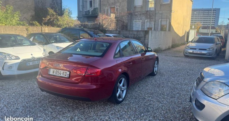 Audi a4 TDI ambiance lux143 CH Premier immatriculation 25/06/2008 OPTIONS ET ÉQUIPEMENTS : Audio - Télécommunications : - Chargeur de CD - Lecteur CD /MP3 - Système de navigation Conduite : - Capteur de pluie - Régulateur de vitesse Extérieur : - Lave phares - Phares xénon - Rétroviseurs électriques et dégivrants Intérieur : - 4 vitres électriques - Climatisation automatique - Climatisation multi-zones - Ordinateur de bord - Rétroviseur intérieur électrochrome - Sièges AV électriques - Volant réglable hauteur - Volant réglable profondeur Pack : - Régulateur / Limiteur de vitesse Sécurité : - ABS - Airbag passager - Airbags latéraux - Anti-patinage - Antibrouillards avant - Assistance au freinage d'urgence - Contrôle de pression des pneus - ESP - Roue de secours Autres équipements et informations : - Véhicule non fumeur Garage prince auto 7 Rue des alliés 57050 metz