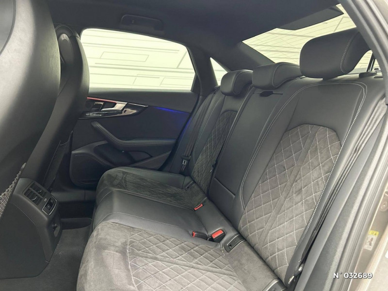 Câbles de recharge pour téléphone portable, compatibles iPhone et Android / Ceintures de sécurité, automatiques à 3 points pour tous les sièges, contrôle de port de ceinture AV / Capot de coffre à ouverture automatique / Blocage électronique de différentiel EDS / Audi Virtual cockpit plus / Audi Sound System / Audi smartphone interface (Apple CarPlay ou Google Android Auto) / Audi Pre Sense city / 8 HP passifs / Accoudoir central confort AV avec inclinaison réglable et coulissant en longueur / Antipatinage ASR pour une motricité optimale, empêche le patinage des roues motrices / Airbags latéraux à l'AV et système d'airbags de tête / Appel d'urgence et service Audi connect avec commande du véhicule / Audi Drive Select / Applications décoratives argent flex métallique / Audi Connect avec carte SIM intégrée (e-SIM) et licence d'utilisation pour 3 ans / Application décoratives aluminium brossé mat / Audi Parking System Plus: Signal sonore et visuel AV/AR / Préparation pour l'activation de la fonction de navigation / Système d'information du conducteur (affichage d'un grand nombre d'informations utiles sur un écran TFT monochrome de 5") / Pack Eclairage / Navigation MMI plus avec MMI touch / Vitrage Privacy (vitres surteintées) / Toit en couleur contrastée Noir Brillant / Tapis complémentaires AV/AR / Triangle de présignalisation / 30 couleurs au choix pour un profil de couleur personnalisable / 3 profils de couleur prédéfinis ; un profil de couleur supplémentaire, interactif et personnalisé / Touche extérieure noire au niveau de l'Audi singleframe, des baguettes décoratives sur les vitres latérales et du pare-chocs AV et AR / Tire Mobility System Compresseur et produit de colmatage en cas de crevaison / Identification du modèle selon le nouveau marquage de puissance / Feux AR à LED, clignotants, feux stop, feux AR, feux de recul et feux de plaque AR à LED / Eléments de l'habitacle en simili-cuir / Interface Bluetooth / Finition extérieure S Line / Frein de stationnement électromécanique / Jantes en aluminium coulé Audi Sport 5 branches trapézoïdal, finition titane mat, polies brillant Dimension : 8,0 J x 18" Pneus : 245/40 R 18 / MMI Radio Plus / Limitation de la vitesse maximale à 210 km/h / Moulures de seuil avec insert en aluminium AV, éclairées, avec inscription S / Keyless Go: démarrage et arrêt du moteur par touche moteur Start/Stop sur la console centrale / Fixation pour sièges enfants ISOFIX et Top Tether pour les places AR extérieures incluant un point de fixation supplémentaire (Top Tether) / Détecteur de pluie et de luminosité / Coques de rétroviseurs noir brillant / Contrôle électronique de stabilisation (ESC) / Colonne de direction de sécurité / Clé confort incluant déverrouillage du coffre par capteur (avec safelock) / Commande de désactivation de l'airbag passager AV / Châssis de série, pour un confort de conduite accru avec une excellente dynamique / Clé Audi connect (Smartkey) / Ciel de pavillon en tissu noir / Diffuseur avec finition symétrique des sorties d'échappement de style en chrome à gauche et à droite / Direction assistée électromécanique / Dossier de banquette AR rabattable en 3 parties 40 : 20 : 40 ou complètement / Ecrous de roues antivol / Eclairage intérieur / Audi Hold Assist / Appui lombaire à 4 axes pour les sièges AV: réglages électrique, horizontal et vertical / Audi Phone Box avec charge du téléphone par induction (standard Qi) / Vitrage acoustique pour les vitres de portières AV / Vide-poches dans les contre-portes à l'AV et à l'AR / Volant Sport contour en cuir style 3 branches à méplat avec multifonctions plus / Pack Eclairage / Pneus à roulage optimisé (faible résistance au roulement), 245/40 R 18 - Vmax = 210 km/h / Phares Matrix LED, feux AR à LED et lave-phares / Pédalier et repose-pieds en acier inoxydable / Pack Rangement et Coffre / S tronic, boîte séquentielle 7 vitesses à double embrayage avec commande électrohydraulique / Récupération Permet de réaliser des économies de carburant en récupérant l'énergie de décélération et de freinage / Rétroviseur intérieur sans encadrement jour/nuit automatique / Préparation pour crochet d'attelage / Recommandation de repos / Sièges AV avec fonction massage / Sécurité enfants / Sellerie Microfibre Dinamica / cuir combinés avec logo "S" dans le dossier des sièges AV / Rétroviseurs extérieurs réglables et escamotables électriquement, jour/nuit automatique, dégivrants des deux côtés et buses de lave-glaces dégivrantes / Surfaces d'accentuation faà§on verre en noir