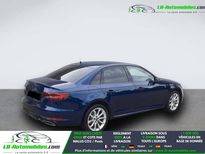 Référence : 1188764 Vos Avantages chez LB-AUTOMOBILES.com / Prix affiché TTC Livré hors carte grise / Livraison sous 10 jours dans toute la France hors 31 / Pas d?avance de frais paiement du véhicule 100% à la livraison par virement. Audi A4 Neuf remisée, Audi A4 Occasion Toulouse Beaupuy 31850, Audi A4 Véhicule sorti de réseau collaborateur, Audi A4 import, Audi A4 importateur, Audi A4 Livraison possible dans toute la France sous 5 jours, Audi A4, Audi A4 Location Option Achat, Audi A4 LLD, Audi A4 Longue Durée, Audi A4 TVA récupérable. Possibilité d'extension de garantie 12, 24,36 mois, Pour tout autres voitures import neufs ou occasions collaborateur fortement remisée, Mandataire Audi, Mandataire BMW, Mandataire Volkswagen, Mandataire Mercedes, Mandataire Peugeot Espagne, Mandataire Renault Espagne, Porsche import, Mandataire Citroën Espagne, Mandataire Seat Espagne, n'hésitez pas à nous contacter. « Sous réserve de vente préalable et erreur de saisie » Principaux équipements : - ABS - Accoudoir - Android Auto - Antidémarrage - Apple CarPlay - Assistance de démarrage en côte - Bluetooth - Boîte de vitesses robotisée - Capteur de lumière - Capteur de pluie - Carnet d'entretien - Chargement par induction pour smartphones - Cockpit numérique - Commande vocale - Contrôle de la pression des pneus - Diesel avec filtre à particules - Direction assistée - Éclairage adaptatif - Éclairage d'ambiance - Écran tactile - ESP - Fermeture centralisée - Feux de jour LED - Garantie - GPS - Hayon électrique - Isofix - Jantes alliage - Kit de réparation d'urgence des pneus - Kit mains libres - Lecteur CD - Ordinateur de bord - Package hiver - Pack fumeur - Pack sport - Phare antibrouillard - Phares LED - Pneus toutes saisons - Port USB - Réglage électrique des sièges - Régulateur de vitesse adaptatif - Rétroviseur extérieur électrique - Rétroviseur intérieur anti-éblouissement automatique - Rétroviseurs extérieurs rabattables électriquement - Révision complète - Sièges chauffants - Sièges sport - Support lombaire - Suspension sport - Système antipatinage - Système de nettoyage des phares - Système de sonorisation - Système Stop & Start - Traction avant - Tuner/radio - Véhicule non-fumeur - Vitres électriques - Vitres teintées - Volant en cuir - Volant multifonction - WLAN / point d'accès Wi-Fi