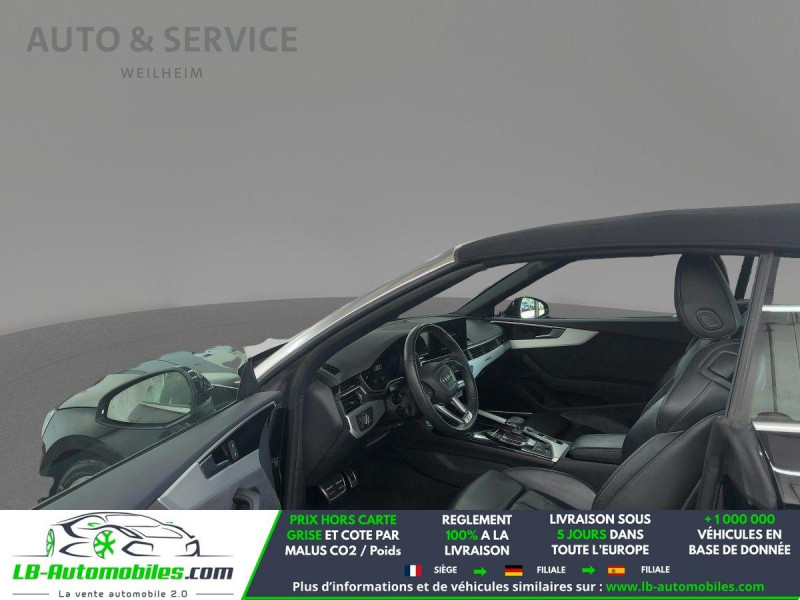 Référence : 1161907 Vos Avantages chez LB-AUTOMOBILES.com / Prix affiché TTC Livré hors carte grise / Livraison sous 10 jours dans toute la France hors 31 / Pas d?avance de frais paiement du véhicule 100% à la livraison par virement. Audi A5 Cabriolet Neuf remisée, Audi A5 Cabriolet Occasion Toulouse Beaupuy 31850, Audi A5 Cabriolet Véhicule sorti de réseau collaborateur, Audi A5 Cabriolet import, Audi A5 Cabriolet importateur, Audi A5 Cabriolet Livraison possible dans toute la France sous 5 jours, Audi A5 Cabriolet, Audi A5 Cabriolet Location Option Achat, Audi A5 Cabriolet LLD, Audi A5 Cabriolet Longue Durée, Audi A5 Cabriolet TVA récupérable. Possibilité d'extension de garantie 12, 24,36 mois, Pour tout autres voitures import neufs ou occasions collaborateur fortement remisée, Mandataire Audi, Mandataire BMW, Mandataire Volkswagen, Mandataire Mercedes, Mandataire Peugeot Espagne, Mandataire Renault Espagne, Porsche import, Mandataire Citroën Espagne, Mandataire Seat Espagne, n'hésitez pas à nous contacter. « Sous réserve de vente préalable et erreur de saisie » Principaux équipements : - 4x4 - ABS - Accoudoir - Android Auto - Antidémarrage - Apple CarPlay - Assistance au freinage d'urgence - Assistance de démarrage en côte - Assistant d'angle mort - Assistant feux de route - Attache remorque pivotante - Avertisseur de franchissement de ligne - Bluetooth - Boîte de vitesses robotisée - Capteur de lumière - Carnet d'entretien - Chargement par induction pour smartphones - Cockpit numérique - Commande vocale - Contrôle de la pression des pneus - Diesel avec filtre à particules - Direction assistée - Éclairage adaptatif - Éclairage d'ambiance - Éclairage route non éblouissant - Écran tactile - ESP - Fermeture centralisée - Feux de jour LED - Garantie - GPS - Hayon électrique - Isofix - Jantes alliage - Kit mains libres - Ordinateur de bord - Package hiver - Pack sport - Phares LED - Pneus été - Port USB - Radio DAB - Régulateur de vitesse adaptatif - Rétroviseur extérieur électrique - Rétroviseur intérieur anti-éblouissement automatique - Rétroviseurs extérieurs rabattables électriquement - Sièges arrières chauffants électriques - Sièges chauffants - Sièges sport - Streaming musical intégré - Support lombaire - Suspension sport - Système antipatinage - Système d'appel d'urgence - Système d'avertissement de la distance - Système de limitation de la vitesse - Système de reconnaissance des panneaux de signalisation - Système de sonorisation - Système Stop & Start - Tuner/radio - Véhicule non-fumeur - Verrouillage centralisé sans clé - Vitres électriques - Volant chauffant - Volant en cuir - Volant multifonction