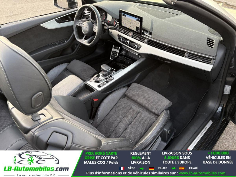 Référence : 1189984 Vos Avantages chez LB-AUTOMOBILES.com / Prix affiché TTC Livré hors carte grise / Livraison sous 10 jours dans toute la France hors 31 / Pas d?avance de frais paiement du véhicule 100% à la livraison par virement. Audi A5 Cabriolet Neuf remisée, Audi A5 Cabriolet Occasion Toulouse Beaupuy 31850, Audi A5 Cabriolet Véhicule sorti de réseau collaborateur, Audi A5 Cabriolet import, Audi A5 Cabriolet importateur, Audi A5 Cabriolet Livraison possible dans toute la France sous 5 jours, Audi A5 Cabriolet, Audi A5 Cabriolet Location Option Achat, Audi A5 Cabriolet LLD, Audi A5 Cabriolet Longue Durée, Audi A5 Cabriolet TVA récupérable. Possibilité d'extension de garantie 12, 24,36 mois, Pour tout autres voitures import neufs ou occasions collaborateur fortement remisée, Mandataire Audi, Mandataire BMW, Mandataire Volkswagen, Mandataire Mercedes, Mandataire Peugeot Espagne, Mandataire Renault Espagne, Porsche import, Mandataire Citroën Espagne, Mandataire Seat Espagne, n'hésitez pas à nous contacter. « Sous réserve de vente préalable et erreur de saisie » Principaux équipements : - ABS - Accoudoir - Antidémarrage - Assistance au freinage d'urgence - Assistance de démarrage en côte - Assistant de sortie de stationnement - Assistant feux de route - Bluetooth - Boîte de vitesses robotisée - Capteur de lumière - Capteur de pluie - Carnet d'entretien - Chargement par induction pour smartphones - Commande vocale - Contrôle de la pression des pneus - Direction assistée - Écran tactile - ESP - Fermeture centralisée - Feux de jour LED - Garantie - GPS - Isofix - Jantes alliage - Kit de réparation d'urgence des pneus - Kit mains libres - Lecteur CD - Ordinateur de bord - Package hiver - Pack sport - Phare antibrouillard - Phares LED - Pneus été - Port USB - Radio DAB - Régulateur de vitesse - Rétroviseur extérieur électrique - Rétroviseur intérieur anti-éblouissement automatique - Sièges chauffants - Sièges sport - Streaming musical intégré - Suspension adaptative - Suspension sport - Système antipatinage - Système d'alarme - Système d'appel d'urgence - Système d'avertissement de la distance - Système de détection de la fatigue - Système de limitation de la vitesse - Système de reconnaissance des panneaux de signalisation - Système de sonorisation - Système Stop & Start - Traction avant - Véhicule non-fumeur - Verrouillage centralisé sans clé - Vitres électriques - Vitres teintées - Volant en cuir - Volant multifonction - WLAN / point d'accès Wi-Fi