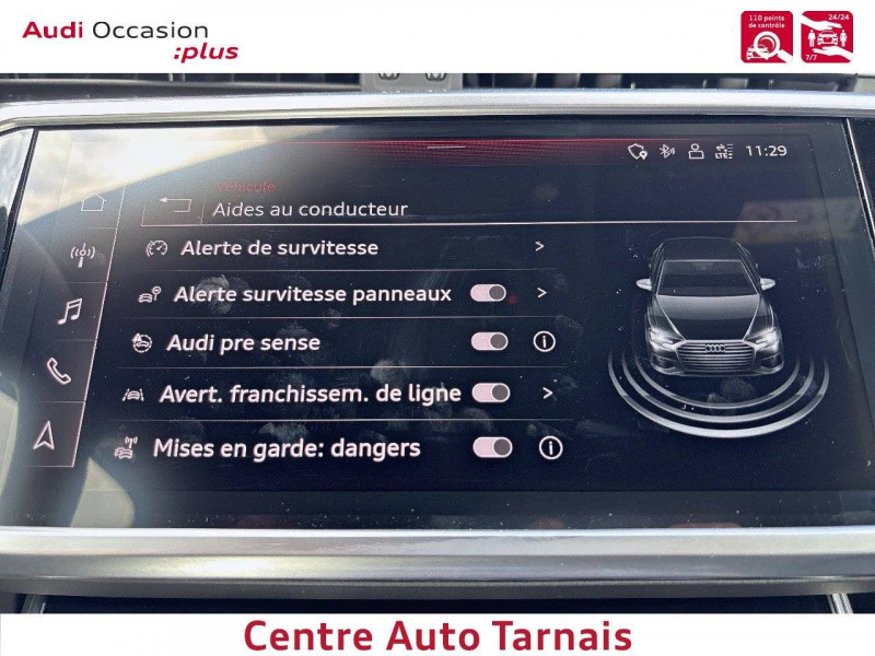 Applications décoratives en aluminium brossé mat foncé / Audi Virtual Cockpit / Capot de coffre à ouverture automatique (fermeture manuelle) / Feux AR à LED avec feux de recul et feux AR de brouillard intégrés / Interface Bluetooth Connexion des téléphones portables compatibles Bluetooth via l'interface véhicule, fonction mains libres dans le véhicule via microphone de plafond et HP, possibilité de connexion de 2 téléphones (2 × HFP/PBAP), streaming audio Bluetooth (A2DP), affichage des SMS/e-mails (MAP) entrants, commande via les systèmes d'autoradio/navigation, du volant multifonction ou via la commande vocale / Jantes en aluminium coulé style 5 branches doubles, gris contrasté, partiellement polies, 8,5Jx19" Pneus : 245/45 R19 / Moulures de seuil avec insert en aluminium AV/AR, éclairées, avec inscription "S" à l'AV / Navigation MMI plus avec MMI touch response / Pack Eclairage intérieur à LED - En plus de l'éclairage intérieur de série: - Éclairage des seuils de portières AR - Éclairage d'ambiance du tissu des portières AV/AR - Éclairage périphérique dans les poignées de portières extérieures AV/AR - Éclairage d'ambiance du tableau de bord / Pack extérieur Brillance - Baguette sur les appuis de vitre en aluminium anodisé - Revêtement Noir brillant sur les montants de pavillon centraux - Baguette des feux AR en chrome / Pack Extérieur S line - Pare-chocs S AV et AR avec inserts S line (structure alvéolée) - Grilles d'entrée d'air latérales spécifiques en Noir titane mat avec insert en gris platine - Calandre en Noir titane mat avec lamelles en argent aluminium mat - Extensions de bas de caisse / baguettes de portières spécifiques S, laquées dans la couleur de carrosserie - Emblème "S line" sur les ailes AV - Diffuseur spécifique S line et grille en Noir titane mat - Finition des sorties d'échappement en argent aluminium mat / Pack Non fumeur - Une prise 12 volts AV et AR / Pack Rangement - 2 porte-boissons dans l'accoudoir central AR - Filet de coffre à fixer aux oeilletons de fixation sur le plancher du coffre - 2 autres vestes de sécurité pour les passagers AR / Préparation pour crochet d'attelage / Rétroviseur intérieur jour/nuit automatique sans encadrement (Frameless) / Rétroviseurs extérieurs réglables, dégivrants et rabattables électriquement avec fonction rabat automatique pour le rétroviseur côté passager AV lors des manoeuvres, clignotants à LED intégrés / Touches de commande façon verre en Noir avec réponse haptique incluant style aluminium étendu / Volant Sport contour en cuir avec multifonction, palettes de changement de vitesse et méplat / Airbags latéraux à l'AV et système d'airbags de tête / Appel d'urgence et service Audi connect incluant commande de véhicule / Appui lombaire à 4 axes pour les sièges AV, réglage électrique, horizontal et vertical / Appuie-tête à AV pour sièges AV réglables manuellement en hauteur / Assistant de feux de route / Audi Connect avec carte SIM intégrée (e-SIM) et licence d'utilisation pour 3 ans / Audi Drive Select Permet de sélectionner différents modes de conduite: Efficiency, Confort, Dynamic, Lift, Individual. Les systèmes et équipements du véhicules s'adaptent suivant le mode sélectionné / Audi Music Interface à l'AV et l'AR / Audi Parking System Plus / Audi Pre Sense Basic / Audi Pre Sense front / Audi smartphone interface / Badges extérieurs avec identification du modèle et inscription de la puissance/technologie / Boîtiers de rétroviseurs extérieurs couleur carrosserie / Buses de lave-glace degivrantes / Caméra multifonction pour système d'assistance à la conduite / Ciel de pavillon en tissu noir / Cléà fréquence radio (sans safelock) / Commande de désactivation de l'airbag passager AV / Câble de recharge pour téléphone portable / Eclairage intérieur / Ecrous de roues antivol et indicateur de desserrage d'écrous / Eléments de l'habitacle supérieurs en matériaux synthétiques Tableau de bord et rebords de portières en matériaux synthétiques / Fixation pour sièges enfants ISOFIX et Top Tether pour les places AR extérieures / Outillage de bord et cric / Pare-brise en verre de sécurité feuilleté athermique / Pédalier et repose-pieds en acier inoxydable / Rampes de pavillon anodisées / Régulateur de vitesse incluant limiteur de vitesse / Réservoir AdBlue à capacitéétendue (24 litres) / Set de réparation pour pneus / Système audiophonique Audi / Tableau de bord et revêtement de porte en deux pièces et une/plusieurs couleurs / Tapis complémentaires avec double passepoil / Technologie hybride léger - Mild-Hybrid / Tissu Effet pour sièges standards à l'AV / Trousse de secours, triangle de présignalisation et veste de sécurité / Vitres athermiques sur les côtés et à l'AR lunette AR dégivrante, avec minuterie