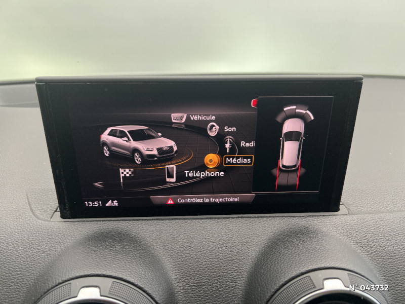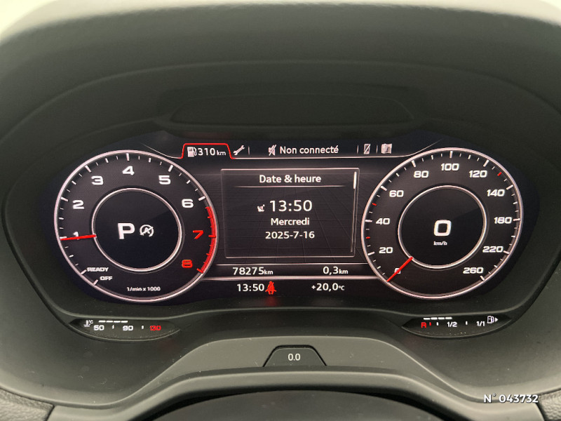 Protection antidémarrage électronique, intégrée à la gestion du moteur, activation automatique par la clé du véhicule / Récupération d'énergie au freinage / Volant en cuir style 3 branches avec multifonctions / Volant 3 branches multifonctions en cuir avec méplat / Rétroviseurs extérieurs réglables électriquement et dégivrants incluant buses de lave-glaces dégivrantes / Sécurité enfants / Sellerie S line en Tissu Pulse/Cuir Noir / Set de réparation pour pneus, avec compresseur 12 volts et produit de colmatage. Vitesse maximale autorisée 80 km/h / Sièges AV réglables manuellement en hauteur et en profondeur, réglage manuel des appuie-tête en hauter / Sortie d'échappement monoflux avec 2 sorties à gauche / Stickers "Anneaux Audi" sur les Blades / Surpiqûres contrastées sur les selleries, le volant, le soufflet de levier/sélecteur de vitesses ainsi que tapis complémentaires / Surpiqûres contrastées sur les selleries, volant Sport en cuir, le soufflet de levier/sélecteur de vitesses ainsi que tapis complémentaires / Système de freinage avec freins à disque à l'AV et à l'AR / Tapis complémentaires AV et AR / Tapis de coffre à bagages / Toit ouvrant coulissant/relevable électriquement en verre de sécurité simple vitrage teinté et pare-soleil manuel / Triangle de présignalisation / Vide-poches / Vitres latérales et AR athermique / Repose-genoux et diffuseurs d'air laqués / Repose-pied et pédalier en acier inoxydable / Rétroviseur intérieur jour/nuit automatique / Rétroviseur intérieur jour/nuit automatique / Rétroviseurs extérieurs avec clignotants à LED intégrés / Ecrous de roues antivol / Embout(s) de sortie(s) d'échappement chromé(s) / Feux AR rouges avec feux de recul blancs et feux AR de brouillard intégrés, feux de plaque AR à LED et 3ème feu de stop surélevé / Fixation pour sièges enfants ISOFIX aux places extérieures AR avec Top Tether / Frein de stationnement électromécanique / Identification du modèle et de la technologie sur le capot de coffre / Inscription S line sur les ailes AV / Interface Bluetooth / Jantes Audi Sport en aluminium coulé style 5 branches offroad design titanium mat et look polies brillant 7Jx18" avec pneus 215/50 R18 / MMI Navigation Plus avec MMI touch / MMI Radio Plus / Pack Aluminium Intérieur / Pack Brillance Audi exclusive / Airbags latéraux AV et système d'airbags de tête / Applications décoratives en Aluminium brossé mat / Audi Connect / Audi Drive Select / Audi Drive Select / Audi Hold Assist / Audi Music Interface / Audi Parking System Plus: Système accoustique et visuel d'aide au stationnement AV et AR / Audi Pre-Sense Front avec détection des piétons / Audi Smartphone Interface / Audi Sound System / Audi Virtual Cockpit / Audi Virtual Cockpit combiné d'instruments entièrement numérique de 12.3" avec affichage haute résolution / Blade Gris Titane mat / Blocage électronique de différentiel EDS / Boîte de vitrese S tronic à 7 rapports / Câbles de recharge pour téléphone portable, compatibles iPhone et Android / Ceintures de sécurité: Ceintures 3 points à enrouleur pour tous les sièges, avec contrôle de port à l'AV, assorties à la couleur de l'habitacle / Châssis dynamique pour un excellent dynamisme et un grand confort / Ciel de pavillon en tissu noir / Clé Confort (Keyless entry) / Colonne de direction de sécurité / Contrôle électronique de stabilisation ESC / Cric et outillage de bord / Désactivation de l'airbag passager / Détecteur de pluie et de luminosité / Déverrouillage du coffre avec touche douce (déverrouillage avec assistance électrique) / Direction progressive à assistance électromécanique / Dispositif anti-erreur de carburant / Dossier de banquette AR rabattable en deux parties, 1/3, 2/3 ou complètement / Eclairage intérieur à temporisation avec contacteurs sur toutes les portières et éclairage du coffre / Rétroviseurs extérieurs couleur carrosserie / Rétroviseurs extérieurs escamotables électriquement, dégivrants des deux côtés et buses de lave-glaces dégivrantes / Rétroviseurs extérieurs réglables, dégivrants et rabattables électriquement, incluant fonction rabat automatique / Pack Eclairage / Pare-soleil avec miroirs de courtoisie / Peinture intégrale / Phares à LED avec clignotants dynamiques à l'AR / Pommeau de levier/sélecteur de vitesses en cuir perforé noir