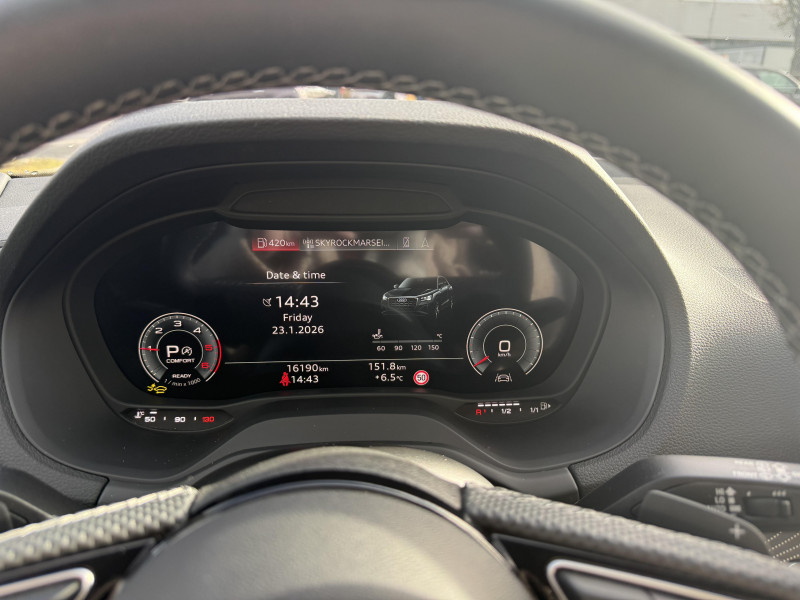 Application décorative Graphique lumineux avec pack d'éclairage d'ambiance plus Applications décoratives avec rétroéclairage de couleur sur le tableau de bord et sur le repose-genoux de la console centrale / Audi connect navigation et divertissement plus / Audi Virtual Cockpit / Jantes 19" Audi Sport, gris titane mat, 5 bras turbo Pneus 235/40 R19 / MMI navigation avec MMI touch / Moulures de seuil avec insert en aluminium, éclairées / Phares Matrix LED avec clignotants dynamiques à l'AR / Rétroviseur intérieur jour/nuit automatique / Rétroviseurs extérieurs réglables, dégivrants et rabattables électriquement, jour/nuit automatiques des deux côtés / Volant Sport en cuir style 3 branches avec multifonction, méplat et palettes / Airbags latéraux AV avec système d'airbags de tête / Appuis lombaires à 4 axes pour les sièges AV / Audi connect Remote & Control / Audi Drive Select / Audi Hold Assist / Audi Phone Box avec charge du téléphone par induction (standard Qi) / Audi pre sense front / Audi Smartphone Interface / Audi Sound System avec 10 HP / Avertissement de sortie de voie / Blade Noir Brillant / Châssis standard / Clé confort sans SAFELOCK / Détecteur d?occupation de sièges / MMI radio plus avec MMI touch réception radio de haute qualité, une réception radio numérique, un écran central tactile de 8,8", une interface Bluetooth pour la connexion d'un téléphone portable ainsi que 2 interfaces USB-C avec fonction de chargement et de données pour l'écoute de la musique d'un support de stockage portable / Pare-chocs en peinture intégrale / Pédalier standard / Set de réparation pour pneus / Sièges AV à réglage manuel / Système de lecture des panneaux de signalisation par caméra / Sécurité enfant électrique / Tapis de sol à l'AV et à l'AR / Trousse de secours et triangle de présignalisation / Vitres surteintées (Privacy glass)