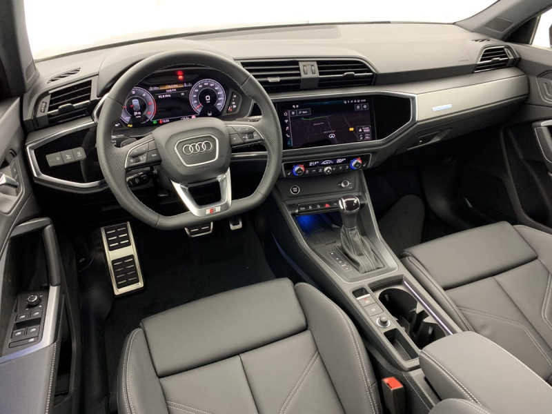 Pack Aluminium Intérieur / Audi Hold Assist / Appui lombaire à 4 axes pour les sièges AV: réglages électrique, horizontal et vertical / Applications décoratives en aluminium mat Brossé Foncé / Audi Parking System Plus / Audi Smartphone Interface / Audi Connect Navigation et Divertissement Plus / Ecrous de roues antivol / Détecteur de pluie et de luminosité / Volant cuir Sport multifonctions Plus 3 branches avec méplat et palettes de commande au volant / Vitrage Privacy : lunette AR, vitres de portières AR et vitres latérales AR surteintées / Audi Drive Select / Clé confort incluant déverrouillage du coffre par capteur (sans Safelock) / Rétroviseur intérieur jour/nuit automatique sans encadrement / Sièges AV réglables manuellement Hauteur et positionnement en longueur, Inclinaison de dossier, Hauteur des appuie-tête et des ceintures / Fixation pour sièges enfants ISOFIX et Top Tether pour les sièges extérieurs AR / Kit réparation / Outillage de bord / Trousse de secours, triangle de présignalisation et 2 vestes de sécurité / Banquette AR avec porte-gobelet dans l'accoudoir de la place centrale / Hayon de coffre à ouverture et fermeture électrique / Audi Virtual cockpit plus / Accoudoir central coulissant en longueur, avec inclinaison réglable et vide-poches relevable / Assise et dossier de banquette AR, divisée, rabattable 40/20/40, Assise coulissante en longueur, Dossier avec inclinaison réglable / MMI Radio Plus avec MMI Touch / Boîtiers de rétroviseurs extérieurs couleur carrosserie / Pare-brise en verre acoustique avec verre feuilleté athermique / 2 prises USB AR (type-C) et prise 12V dans la console centrale AR / Avertisseur de franchissement de ligne et avertisseur de changement de voie / Détection de signalisation routière par caméra / Accoudoirs des contre-portes en matériaux synthétiques monopur 550 / Pack Eclairage d'ambiance plus : Eclairage dans la zone des pieds AV/AR Eclairage du porte-boissons AV Eclairage du compartiment de rangement sous le tableau de bord Choix parmi 30 couleurs Eclairage des seuils de portières AV Eclairage d'ambiance latéral de la console centrale AV Miroirs de courtoisie éclairés pour conducteur et passager AV Inscription éclairée sur le tableau de bord passager AV (anneaux Audi) / Pack S line extérieur : Diffuseur en Noir Titane mat Lamelles en Argent Aluminium mat Encadrement des prises d'air latérales AV en Gris Platine mat Becquet AV en peinture intégrale (couleur de la carrosserie) avec lame Gris Platine mat Grille de diffuseur Noir mat grenue Châssis Sport Emblème S line sur les ailes extérieures Barrette du diffuseur noir titane mat Calandre en noir titane, lames intérieures grises Moulures de seuil avec insert en aluminium à l'AV, éclairées, avec inscription S Protection du seuil de chargement en acier inoxydable Enjoliveurs de passage de roue et extensions de bas de caisse en peinture contrastée / Pack Esthétique Noir plus : Entourage des vitres latérales avec des baguettes enjoliveuses Noir Calandre Singleframe Noire Lames intérieurs de la calandre Singleframe nid d'abeille noires au lieu de grises Anneaux Audi et monogrammes en Noir Brillant / Ciel de pavillon en tissu Noir /