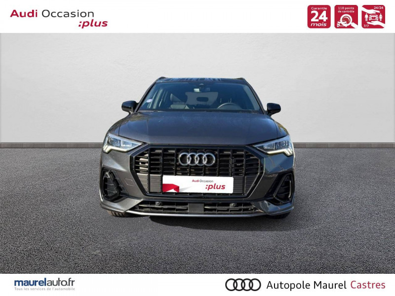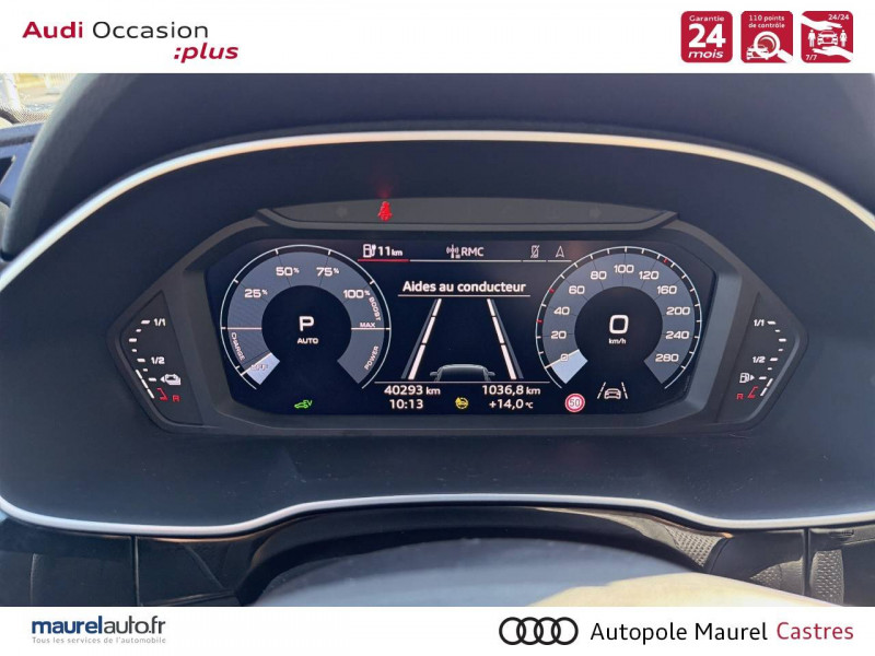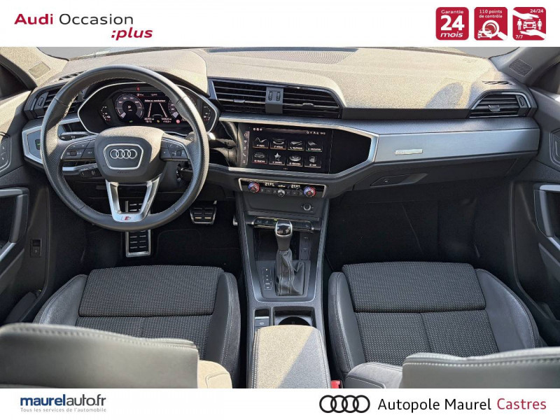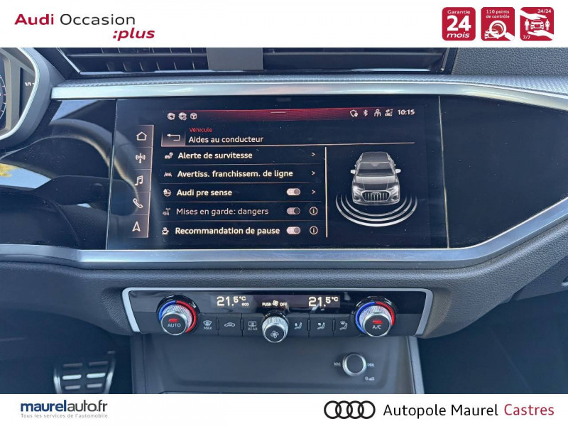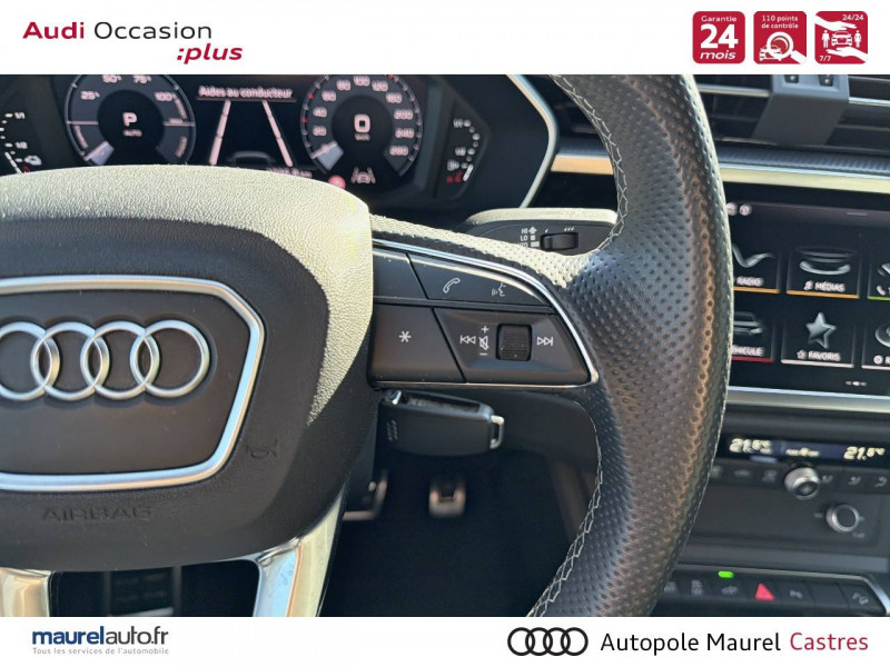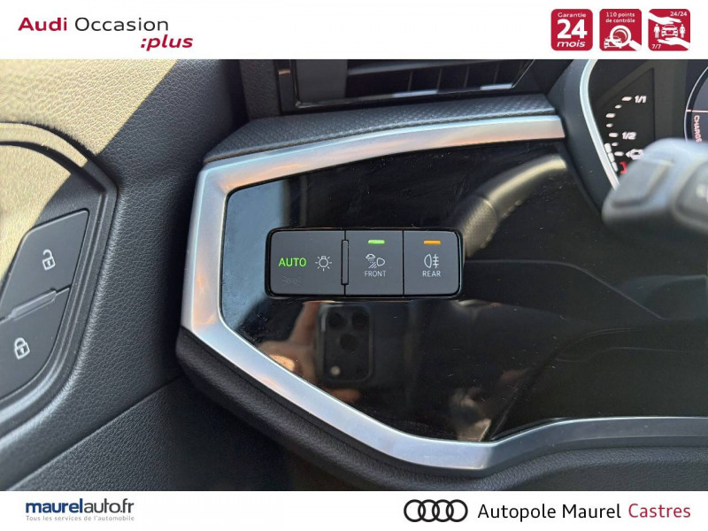 2 prises USB AR (type-C) et prise 12V dans la console centrale AR / Accoudoir central AV avec vide-poches relevable et inclinaison réglable et coulissant en longueur / Accoudoirs des contre-portes en similicuir Monopur 550 / Applications décoratives en aluminium mat Brossé Foncé / Appuis lombaires à 4 axes pour les sièges AV / Assise et dossier de banquette AR, divisée, rabattable 40/20/40 / Audi Connect Navigation et Divertissement / Audi Connect sécurité et assistance en ligne / Audi Drive Select / Audi Hold Assist / Audi Parking System Plus / Audi Pre Sense Basic / Audi Pre Sense front / Audi virtual cockpit / Banquette AR avec porte-gobelet dans l'accoudoir de la place centrale / Boîtiers de rétroviseurs extérieurs dans la couleur de la carrosserie / Câble de recharge HH Type E (8 A) / Ciel de pavillon en tissu noir / Cléà fréquence radio / Combiné d'instruments entièrement numérique 10,25" / Détecteur de pluie et de luminosité / Direction assistée électromécanique, asservie à la vitesse / Eclairage intérieur / Ecrous de roues antivol / Fixation pour sièges enfants ISOFIX et Top Tether pour les sièges extérieurs AR / Interface Bluetooth / Interface USB pour chargement d'appareils externes / Jantes en aluminium coulé 18" 5 branches en V 7Jx18", pneus 235/55 R18 / Kit réparation / MMI Navigation plus avec MMI touch response / MMI Radio Plus avec MMI Touch / Outillage de bord / Pack Aluminium Intérieur / Pack intérieur estéhtique S line / Pack Sécurité / Pack S line extérieur / Pare-brise en verre acoustique avec verre feuilleté athermique / Pare-chocs S line dans une peinture intégrale (couleur de la carrosserie) / Phares à LED, avec clignotants AR à LED dynamiques / Rampes de pavillon Noires / Rétroviseur intérieur jour/nuit automatique sans encadrement / Rétroviseurs extérieurs réglables, dégivrants et rabattables électriquement avec fonction rabat automatique / Sellerie Tissu/Similicuir Monopur 550 / Sièges AV réglables manuellement: Hauteur et positionnement en longueur, Inclinaison de dossier, Hauteur des appuie-tête et des ceintures / Tapis de sol AV/AR / Trousse de secours, triangle de présignalisation et 2 vestes de sécurité