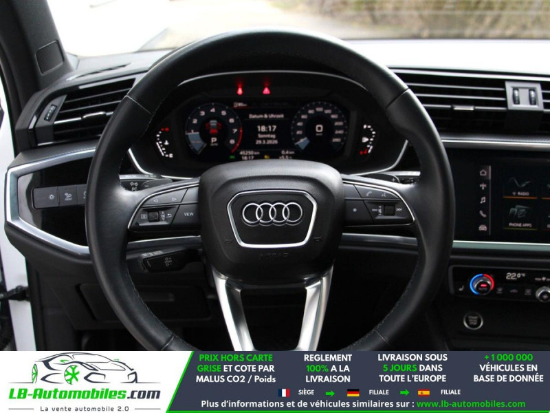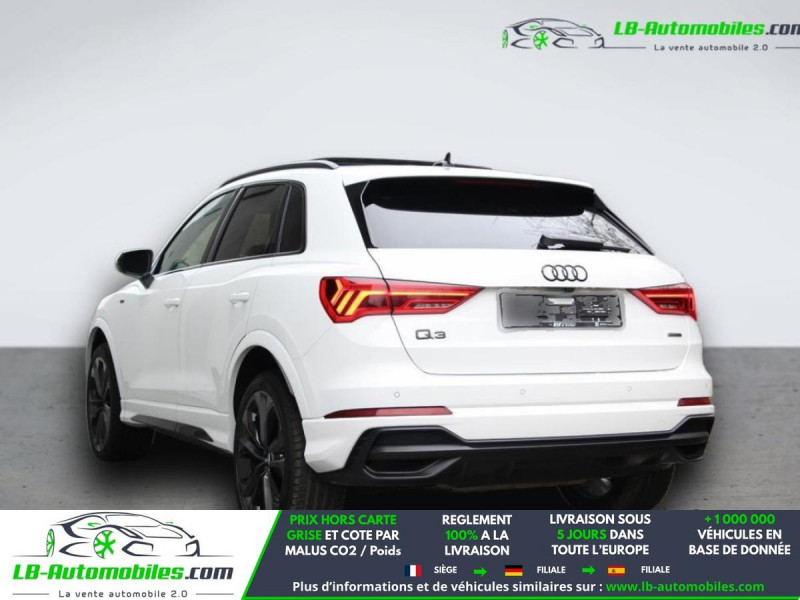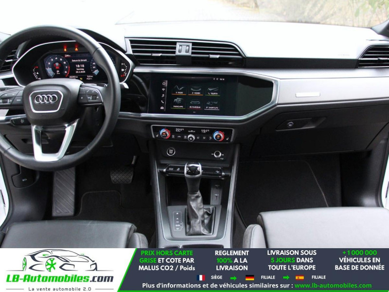 Référence : 1209675 Vos Avantages chez LB-AUTOMOBILES.com / Prix affiché TTC Livré hors carte grise / Livraison sous 10 jours dans toute la France hors 31 / Pas d?avance de frais paiement du véhicule 100% à la livraison par virement. Audi Q3 Neuf remisée, Audi Q3 Occasion Toulouse Beaupuy 31850, Audi Q3 Véhicule sorti de réseau collaborateur, Audi Q3 import, Audi Q3 importateur, Audi Q3 Livraison possible dans toute la France sous 5 jours, Audi Q3, Audi Q3 Location Option Achat, Audi Q3 LLD, Audi Q3 Longue Durée, Audi Q3 TVA récupérable. Possibilité d'extension de garantie 12, 24,36 mois, Pour tout autres voitures import neufs ou occasions collaborateur fortement remisée, Mandataire Audi, Mandataire BMW, Mandataire Volkswagen, Mandataire Mercedes, Mandataire Peugeot Espagne, Mandataire Renault Espagne, Porsche import, Mandataire Citroën Espagne, Mandataire Seat Espagne, n'hésitez pas à nous contacter. « Sous réserve de vente préalable et erreur de saisie » Principaux équipements : - 4x4 - ABS - Accoudoir - Android Auto - Antidémarrage - Apple CarPlay - Assistance au freinage d'urgence - Assistance de démarrage en côte - Assistant d'angle mort - Assistant de sortie de stationnement - Assistant feux de route - Avertisseur de franchissement de ligne - Bluetooth - Boîte de vitesses robotisée - Capteur de lumière - Capteur de pluie - Carnet d'entretien - Cockpit numérique - Commande vocale - Contrôle de la pression des pneus - Diesel avec filtre à particules - Direction assistée - Éclairage adaptatif - Éclairage d'ambiance - Écran tactile - ESP - Fermeture centralisée - Feux de jour LED - Galerie de toit - Grille de protection pour coffre - Hayon électrique - Isofix - Jantes alliage - Kit de préparation pour système de navigation - Kit mains libres - Ordinateur de bord - Pack sport - Phares LED - Pneus été - Port USB - Réglage électrique des sièges - Régulateur de vitesse adaptatif - Rétroviseur extérieur électrique - Rétroviseur intérieur anti-éblouissement automatique - Rétroviseurs extérieurs rabattables électriquement - Roue galette - Sièges chauffants - Sièges sport - Streaming musical intégré - Support lombaire - Système antipatinage - Système d'avertissement de la distance - Système de détection de la fatigue - Système de limitation de la vitesse - Système de sonorisation - Système Stop & Start - Toit ouvrant - Toit panoramique - Tuner/radio - Véhicule non-fumeur - Verrouillage centralisé sans clé - Vitres électriques - Vitres teintées - Volant en cuir - Volant multifonction - WLAN / point d'accès Wi-Fi