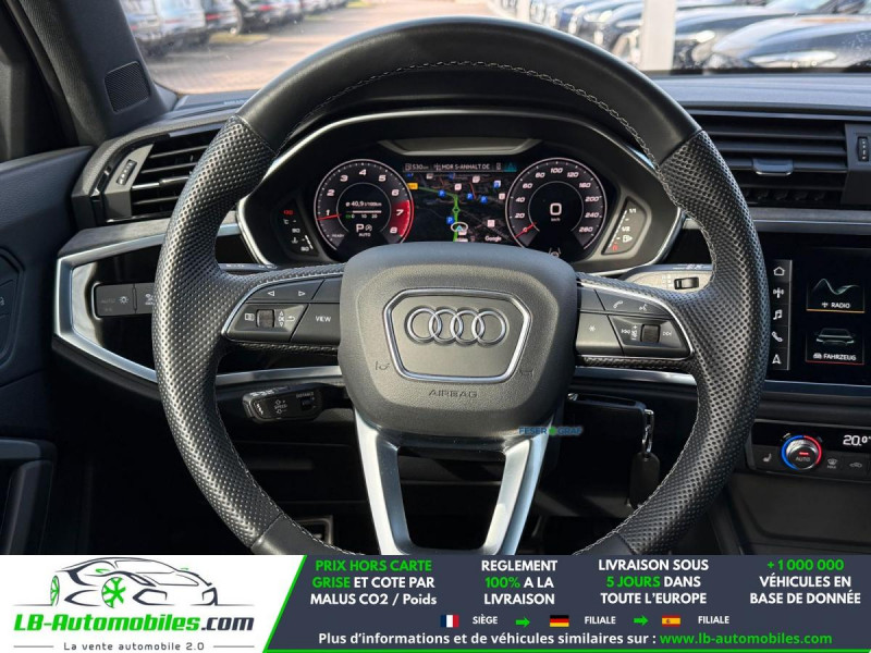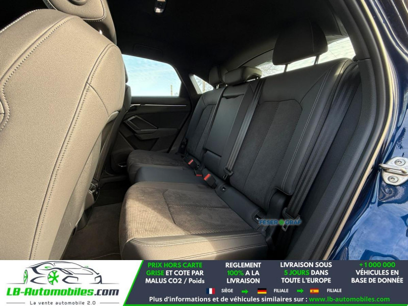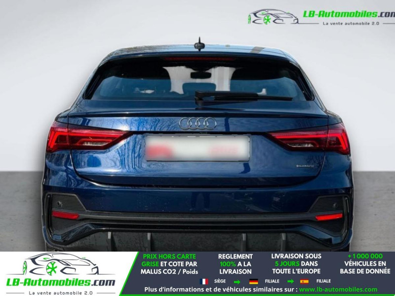Référence : 1205143 Vos Avantages chez LB-AUTOMOBILES.com / Prix affiché TTC Livré hors carte grise / Livraison sous 10 jours dans toute la France hors 31 / Pas d?avance de frais paiement du véhicule 100% à la livraison par virement. Audi Q3 Neuf remisée, Audi Q3 Occasion Toulouse Beaupuy 31850, Audi Q3 Véhicule sorti de réseau collaborateur, Audi Q3 import, Audi Q3 importateur, Audi Q3 Livraison possible dans toute la France sous 5 jours, Audi Q3, Audi Q3 Location Option Achat, Audi Q3 LLD, Audi Q3 Longue Durée, Audi Q3 TVA récupérable. Possibilité d'extension de garantie 12, 24,36 mois, Pour tout autres voitures import neufs ou occasions collaborateur fortement remisée, Mandataire Audi, Mandataire BMW, Mandataire Volkswagen, Mandataire Mercedes, Mandataire Peugeot Espagne, Mandataire Renault Espagne, Porsche import, Mandataire Citroën Espagne, Mandataire Seat Espagne, n'hésitez pas à nous contacter. « Sous réserve de vente préalable et erreur de saisie » Principaux équipements : - 4x4 - ABS - Accoudoir - Antidémarrage - Assistance au freinage d'urgence - Assistance de démarrage en côte - Assistant feux de route - Avertisseur de franchissement de ligne - Bluetooth - Capteur de lumière - Capteur de pluie - Carnet d'entretien - Chargement par induction pour smartphones - Cockpit numérique - Commande vocale - Contrôle de la pression des pneus - Diesel avec filtre à particules - Direction assistée - Éclairage d'ambiance - Éclairage route non éblouissant - ESP - Fermeture centralisée - Feux de jour LED - Garantie - GPS - Hayon électrique - Isofix - Jantes alliage - Kit de réparation d'urgence des pneus - Kit mains libres - Ordinateur de bord - Pack fumeur - Pack sport - Phares LED - Point Isofix siège passager - Port USB - Radio DAB - Régulateur de vitesse adaptatif - Rétroviseur extérieur électrique - Rétroviseur intérieur anti-éblouissement automatique - Rétroviseurs extérieurs rabattables électriquement - Sièges chauffants - Sièges sport - Support lombaire - Suspension sport - Système antipatinage - Système d'appel d'urgence - Système de limitation de la vitesse - Système de nettoyage des phares - Système de reconnaissance des panneaux de signalisation - Système de sonorisation - Système Stop & Start - Tuner/radio - Vitres électriques - Volant en cuir - Volant multifonction