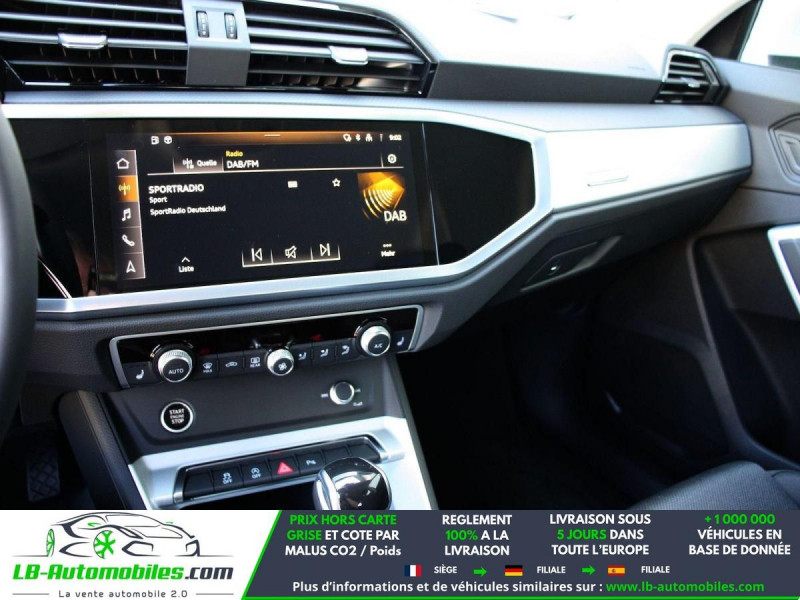 Référence : 1170808 Vos Avantages chez LB-AUTOMOBILES.com / Prix affiché TTC Livré hors carte grise / Livraison sous 10 jours dans toute la France hors 31 / Pas d?avance de frais paiement du véhicule 100% à la livraison par virement. Audi Q3 Neuf remisée, Audi Q3 Occasion Toulouse Beaupuy 31850, Audi Q3 Véhicule sorti de réseau collaborateur, Audi Q3 import, Audi Q3 importateur, Audi Q3 Livraison possible dans toute la France sous 5 jours, Audi Q3, Audi Q3 Location Option Achat, Audi Q3 LLD, Audi Q3 Longue Durée, Audi Q3 TVA récupérable. Possibilité d'extension de garantie 12, 24,36 mois, Pour tout autres voitures import neufs ou occasions collaborateur fortement remisée, Mandataire Audi, Mandataire BMW, Mandataire Volkswagen, Mandataire Mercedes, Mandataire Peugeot Espagne, Mandataire Renault Espagne, Porsche import, Mandataire Citroën Espagne, Mandataire Seat Espagne, n'hésitez pas à nous contacter. « Sous réserve de vente préalable et erreur de saisie » Principaux équipements : - ABS - Accoudoir - Antidémarrage - Assistance au freinage d'urgence - Assistance de démarrage en côte - Avertisseur de franchissement de ligne - Bluetooth - Capteur de lumière - Capteur de pluie - Carnet d'entretien - Cockpit numérique - Commande vocale - Contrôle de la pression des pneus - Diesel avec filtre à particules - Direction assistée - Éclairage d'ambiance - ESP - Fermeture centralisée - Feux de jour LED - Galerie de toit - GPS - Hayon électrique - Isofix - Jantes alliage - Kit mains libres - Ordinateur de bord - Package hiver - Phares LED - Pneus été - Port USB - Radio DAB - Régulateur de vitesse - Rétroviseur extérieur électrique - Sièges chauffants - Sièges sport - Support lombaire - Système antipatinage - Système d'alarme - Système d'appel d'urgence - Système de limitation de la vitesse - Système de reconnaissance des panneaux de signalisation - Système de sonorisation - Système Stop & Start - Traction avant - Tuner/radio - Véhicule non-fumeur - Verrouillage centralisé sans clé - Vitres électriques - Volant en cuir - Volant multifonction
