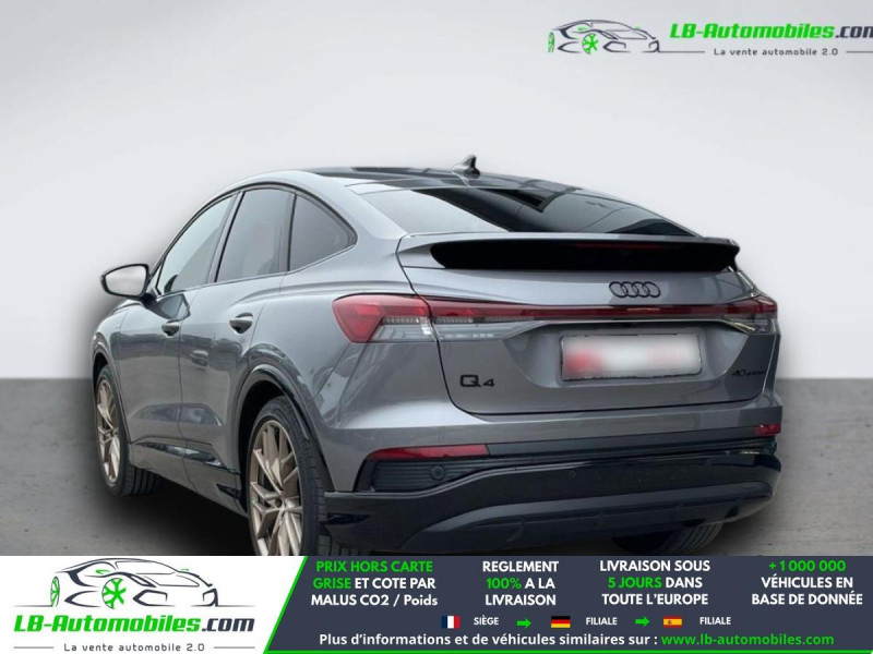 Référence : 1205108 Vos Avantages chez LB-AUTOMOBILES.com / Prix affiché TTC Livré hors carte grise / Livraison sous 10 jours dans toute la France hors 31 / Pas d?avance de frais paiement du véhicule 100% à la livraison par virement. Audi Q4 E-Tron Sportback Neuf remisée, Audi Q4 E-Tron Sportback Occasion Toulouse Beaupuy 31850, Audi Q4 E-Tron Sportback Véhicule sorti de réseau collaborateur, Audi Q4 E-Tron Sportback import, Audi Q4 E-Tron Sportback importateur, Audi Q4 E-Tron Sportback Livraison possible dans toute la France sous 5 jours, Audi Q4 E-Tron Sportback, Audi Q4 E-Tron Sportback Location Option Achat, Audi Q4 E-Tron Sportback LLD, Audi Q4 E-Tron Sportback Longue Durée, Audi Q4 E-Tron Sportback TVA récupérable. Possibilité d'extension de garantie 12, 24,36 mois, Pour tout autres voitures import neufs ou occasions collaborateur fortement remisée, Mandataire Audi, Mandataire BMW, Mandataire Volkswagen, Mandataire Mercedes, Mandataire Peugeot Espagne, Mandataire Renault Espagne, Porsche import, Mandataire Citroën Espagne, Mandataire Seat Espagne, n'hésitez pas à nous contacter. « Sous réserve de vente préalable et erreur de saisie » Principaux équipements : - ABS - Accoudoir - Affichage tête haute - Android Auto - Antidémarrage - Apple CarPlay - Assistance au freinage d'urgence - Assistant d'angle mort - Assistant feux de route - Avertisseur de franchissement de ligne - Bluetooth - Boîte de vitesses robotisée - Capteur de lumière - Capteur de pluie - Carnet d'entretien - Cockpit numérique - Commande vocale - Contrôle de la pression des pneus - Direction assistée - Éclairage adaptatif de virage - Éclairage d'ambiance - Éclairage route non éblouissant - Écran tactile - ESP - Fermeture centralisée - Feux de jour LED - Galerie de toit - Garantie - GPS - Hayon électrique - Isofix - Jantes alliage - Kit mains libres - Ordinateur de bord - Pack sport - Phares LED - Point Isofix siège passager - Port USB - Réglage électrique des sièges - Réglage électrique des sièges avec fonction mémoire - Régulateur de vitesse adaptatif - Rétroviseur extérieur électrique - Rétroviseur intérieur anti-éblouissement automatique - Rétroviseurs extérieurs rabattables électriquement - Sièges chauffants - Sièges sport - Streaming musical intégré - Support lombaire - Suspension sport - Système antipatinage - Système d'appel d'urgence - Système d'avertissement de la distance - Système de limitation de la vitesse - Système de nettoyage des phares - Système de sonorisation - Tuner/radio - Véhicule non-fumeur - Vitres électriques - Vitres teintées - Volant en cuir - Volant multifonction