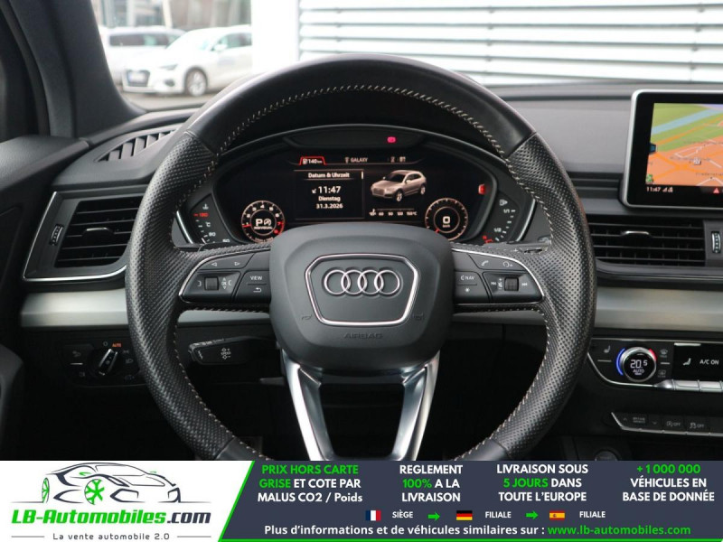 Référence : 1208606 Vos Avantages chez LB-AUTOMOBILES.com / Prix affiché TTC Livré hors carte grise / Livraison sous 10 jours dans toute la France hors 31 / Pas d?avance de frais paiement du véhicule 100% à la livraison par virement. Audi Q5 Neuf remisée, Audi Q5 Occasion Toulouse Beaupuy 31850, Audi Q5 Véhicule sorti de réseau collaborateur, Audi Q5 import, Audi Q5 importateur, Audi Q5 Livraison possible dans toute la France sous 5 jours, Audi Q5, Audi Q5 Location Option Achat, Audi Q5 LLD, Audi Q5 Longue Durée, Audi Q5 TVA récupérable. Possibilité d'extension de garantie 12, 24,36 mois, Pour tout autres voitures import neufs ou occasions collaborateur fortement remisée, Mandataire Audi, Mandataire BMW, Mandataire Volkswagen, Mandataire Mercedes, Mandataire Peugeot Espagne, Mandataire Renault Espagne, Porsche import, Mandataire Citroën Espagne, Mandataire Seat Espagne, n'hésitez pas à nous contacter. « Sous réserve de vente préalable et erreur de saisie » Principaux équipements : - 4x4 - ABS - Accoudoir - Android Auto - Antidémarrage - Apple CarPlay - Assistance au freinage d'urgence - Assistance de démarrage en côte - Bluetooth - Boîte de vitesses robotisée - Capteur de pluie - Carnet d'entretien - Chargement par induction pour smartphones - Cockpit numérique - Contrôle de la pression des pneus - Direction assistée - Éclairage d'ambiance - ESP - Fermeture centralisée - Feux de jour - Galerie de toit - Garantie - GPS - Grille de protection pour coffre - Hayon électrique - Isofix - Jantes alliage - Kit mains libres - Ordinateur de bord - Pack sport - Phares bi-xénon - Pneus été - Port USB - Radio DAB - Régulateur de vitesse - Rétroviseur extérieur électrique - Sièges chauffants - Sièges sport - Streaming musical intégré - Support lombaire - Suspension sport - Système antipatinage - Système d'appel d'urgence - Système d'avertissement de la distance - Système de nettoyage des phares - Système de sonorisation - Système Stop & Start - Tuner/radio - Véhicule non-fumeur - Verrouillage centralisé sans clé - Vitre chauffante - Vitres électriques - Volant en cuir - Volant multifonction