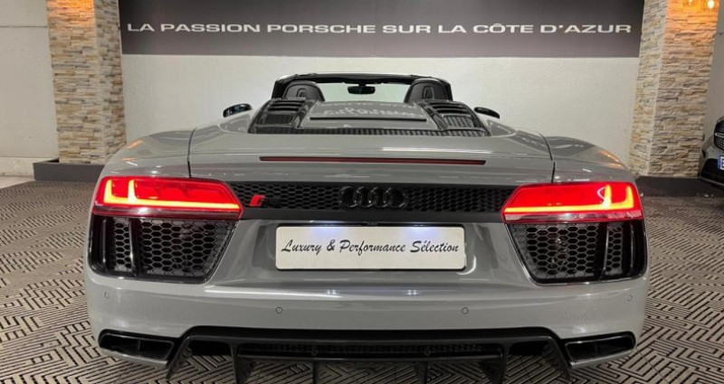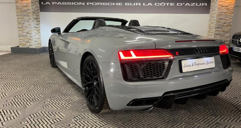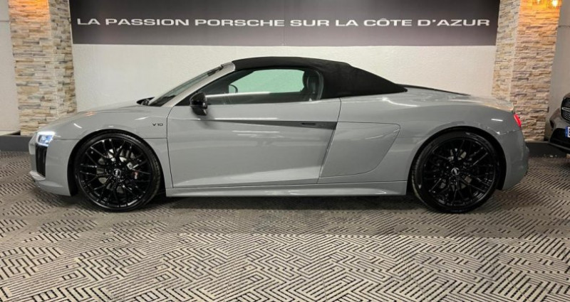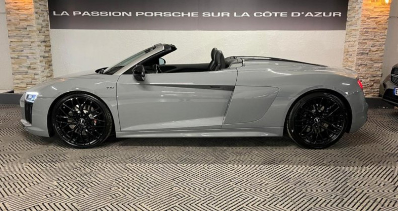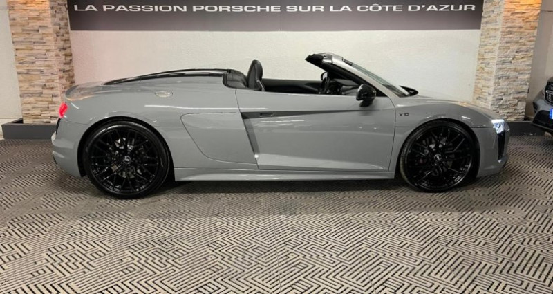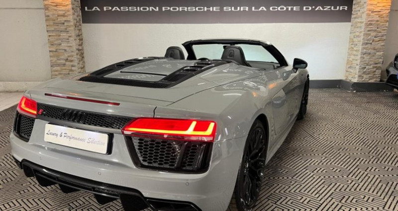 ======= OPTIONS ======= Applications décoratives carbone brillant pour la barrette sur le monoplace, inserts dans la portière et le tableau de bord côté passager avant ainsi que sur la console centrale Assistant de feux de route Audi connect Audi Parking System Plus avec caméra de recul Audi phone box avec chargeur sans fil Baguettes de seuil de porte en Carbone brillant Eclairage d'ambiance à LED Feux arrière à LED avec clignotants dynamiques Jantes 20 en aluminium forgé style 10 branches en Y, polies brillant Media package MMI Navigation plus Pack Confort Pack Cuir Pack de style extérieur Noir Titane avec montants de pare-brise sont de couleur aluminium Pack Sport Pédalier et repose-pied en acier inoxydable Phares à LED avec éclairage laser Audi Réception radio numérique (DAB) Sellerie complète en cuir Nappa fin avec piquage en losange Audi exclusive Sorties d'échappement Sport ======= EQUIPEMENTS DE SERIE ======= ABS : système antiblocage avec répartiteur électronique de freinage EBV et amplificateur hydraulique de freinage Affichage du contrôle de la pression des pneumatiques Airbag frontal passager déconnectable Airbags frontaux grand volume conducteur et passager Airbags latéraux (tête thorax) à l'avant, intégrés aux dossiers des sièges Alarme antivol Applications décoratives étendues laque noire pour l'encadrement de l'Audi virtual cockpit et des diffuseurs d'air Applications décoratives laque anodisée anthracite pour la barrette sur le monoplace, inserts dans la portière et le tableau de bord côté passager avant ainsi que sur la console centrale ASR : système d'antipatinage Audi Drive Select Audi Parking System Plus Audi Premium Tracking System Audi smartphone interface Audi virtual cockpit Badge Audi Sport sur la calandre avant Boîte de vitesses S tronic séquentielle à 7 rapports à double embrayage avec commande électrohydraulique Ciel de pavillon en tissu, selon la couleur choisie, argent lunaire ou noir Climatisation automatique confort spéciale R8 Direction assistée électromécanique EBV : Répartiteur électronique de freinage Eclairage d'accueil LED de portières EDS : blocage électronique de différentiel ESP (programme électronique de stabilisation) Essuie-glaces avant automatique avec détecteur de pluie et allumage automatique des feux Feux arrières à LED Interface Bluetooth Jantes 19 en aluminium noir RWS Exclusive Moulures de seuils de portes avec insert d'aluminium et inscription R8 Outillage de bord dans le coffre Panneaux latéraux (side blade) de couleur noire en haut couleur carrosserie en bas Préparation de navigation Régulateur et limiteur de vitesse Réservoir de carburant 83 litres (+10 litres) Rétroviseur intérieur électrochrome Rétroviseurs extérieurs asphériques Rétroviseurs extérieurs couleur carrosserie Rétroviseurs extérieurs réglables électriquement et dégivrants Sellerie mixte Alcantara cuir Sièges avant réglables en hauteur électriquement Sièges Sport R8 Système d'accès et de démarrage sans clé Keyless Access Système Start Stop avec récupération d'énergie de freinage Tire Mobility System (TMS) ; compresseur 12 V et produit de colmatage pour les pneus dans le coffre ; vitesse maximale 80 km h ; remplace la roue de secours pour un gain de place et de poids Trousse de premier secours avec triangle de signalisation Vitres athermiques teintées vertes et pare-brise en verre feuilleté accoustique Nb. Vitesses : 7 Conso Mixte : l/100