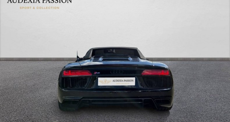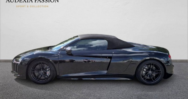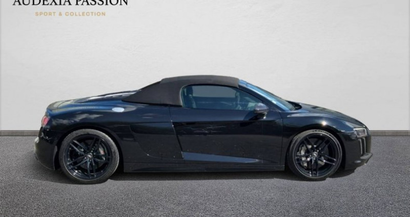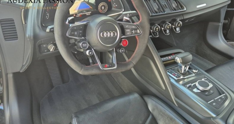 Cylindrée : 5204 cm3 Nb. Vitesse : 7 - Allumage automatique des feux et détecteur de pluie - Applications décoratives étendu laque noire pour l'encadrement de l'Audi virtual cockpit et des diffuseurs d'air - Audi Virtual Cockpit - Boîte automatique S Tronic 7 vitesses à double embrayage - Climatisation automatique Confort spéciale R8 - Eclairage intérieur à technologie LED - EDS: Blocage électronique de différentiel et aide au démarrage - Feux AR à LED avec clignotants dynamiques - Jantes en aluminium coulé style 5 branches en V 8.5Jx19 avec pneus 245/35 R19 à l'AV et 11Jx19 avec pneus 295/35 R19 à l'AR - Moulures de seuils de portes avec insert d'aluminium et inscription R8 - Navigation MMI Plus avec MMI Touch: Système de navigation - Pack Eclairage - Rétroviseur intérieur jour/nuit automatique - Rétroviseurs extérieurs réglables, dégivrants et rabattables électriquement à réglage jour/nuit automatique des 2 côtés - ABS (antiblocage de roue) avec répartiteur de freinage EBV et amplificateur hydraulique de freinage - Affichage du contrôle de pression des pneumatiques - Airbag passager AV désactivable - Airbags frontaux conducteur et passager grand volume - Airbags latéraux AV - Alarme antivol - Applications décoratives laque anodisée anthracite pour la barrette sur le monoplace, inserts dans la portière et le tableau de bord côté passager ainsi que sur la console centrale - Appuis-tête AV actifs - Appuis-tête AV réglables en hauteur - ASR : antipatinage - Audi Drive Select (Permet le réglage du mode de conduite) - Audi Magnetic Ride - Audi Parking System Plus AV et AR - Audi Premium Tracking System - Boîtiers de rétroviseurs extérieurs dans la couleur de la carrosserie - Clé confort (keyless) avec ouverture/fermeture des portes er démarrage du moteur sans clé - Direction assistée électromécanique - EBV : Répartiteur électronique de freinage - ESP: Programme électronique de stabilisation déconnectable - Fixation pour sièges enfants ISOFIX pour le siège passager AV - Freins AV : étriers 8 pistons avec disques wave/Freins AR : étriers 4 pistons avec disques wave - Kit de 1er secours avec triangle de signalisation - Outillage de bord dans le coffre - Panneaux latéraux (Side blade) de couleur Argent glacier métal - Récupération d'énergie au freinage - Réglage électrique des deux sièges AV réglage électrique de la position longitudinale de sièges, réglage pneumatique de l'appui lombaire à 4 axes - Régulateur/Limiteur de vitesse - Réservoir de carburant 83 litres (+10 litres) - Rétroviseurs extérieurs avec verre asphérique - Sièges AV Sport R8 - Sièges Chauffants - Système Start & Stop avec récupération d'énergie au freinage - Tire Mobility System Compresseur et produit de colmatage pour les pneus; remplace roue de secours normale - Vitres athermiques teintées vertes et pare-brise en verre feuilleté accoustique