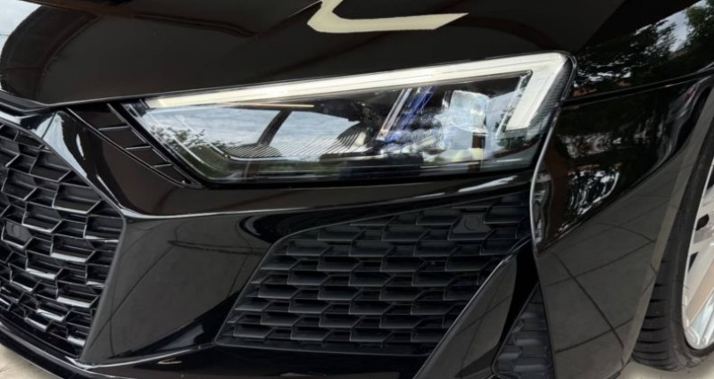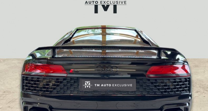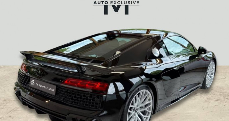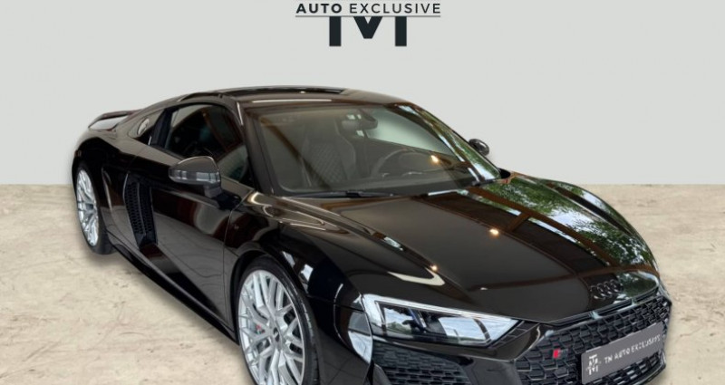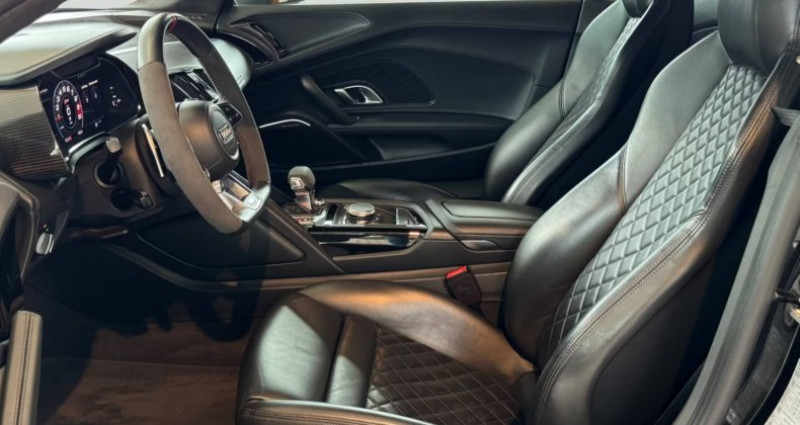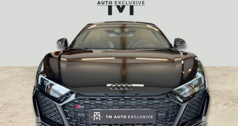 Cylindrée : 5204 cm3 Nb. Vitesse : 7 - ABS : système antiblocage avec répartiteur électronique de freinage EBV et amplificateur hydraulique de freinage - Affichage de contrôle de pression des pneus : Contrôle durant la marche la pression choisie et la température des pneus en service, Affichage des pressions et températures de chaque roue sur l'Audi virtual cockpit - Airbags frontaux grand volume côtés conducteur et passager, désactivable côté passager - Alarme antivol périmétrique, volumétrique et anti-soulèvement - Allumage automatique des feux et des essuie-glaces (capteur de pluie/luminosité) - Applications décoratives carbone brillant pour la barrette sur le monoplace inserts dans la portière et le tableau de bord côté passager avant ainsi que sur la console centrale - Applications décoratives carbone mat pour la barrette sur le monoplace, inserts dans la portière et le tableau de bord côté passager AV ainsi que sur la console centrale - Applications décoratives étendu carbone mat pour l'encadrement de l'Audi virtual cockpit et des diffuseurs d'air - Applications décoratives étendues carbone brillant pour l'encadrement de l'Audi virtual cockpit et des diffuseurs d'air - Applications décoratives Style piano laqué noir Audi exclusive pour la barrette sur le monoplace, inserts dans la portière et le tableau de bord côté passager AV ainsi que sur la console centrale - Appuis-tête actifs réglables en hauteur - ASR : antipatinage - Assistant de feux de route, activaction et désactivation automatique des feux de route - Audi Connect - Audi Drive Select - Audi Magnetic Ride - Audi Parking System Plus - Audi Parking System Plus avec caméra de recul - Audi phone box avec recharge par induction - Audi Virtual Cockpit - Badge R8 sur la calandre AV - Bang & Olufsen Sound System - Boîte de vitesses S tronic séquentielle à 7 rapports à double embrayage avec commande électrohydraulique - Boitiers de rétroviseurs extérieurs en carbone brillant Audi Exclusive - Capot moteur en carbone brillant - Ciel de pavillon en tissu noir ou argent lunaire selon la couleur de l'intérieur choisie - Clé confort (keyless) avec ouverture/fermeture des portes er démarrage du moteur sans clé - Climatisation automatique confort spéciale R8 (avec notamment réglage asservi à la position du soleil) - Commandes en cuir Audi Exclusive sur la jante du volant et pommeau/soufflet de sélecteur de vitesses - Direction assistée électromécanique - EBV : Répartiteur électronique de freinage - Eclairage d'accueil LED de portières - Eclairage intérieur à technologie LED - EDS: Blocage électronique de différentiel et aide au démarrage - ESP: Programme électronique de stabilisation déconnectable - Feux AR à LED avec clignotants dynamiques - Fixation pour sièges enfants ISOFIX pour le siège passager AV - Freins céramique RS avec étriers de frein en bleu avec inscription Audi ceramic a l'AV - Jantes en aluminium forgé style 5 branches doubles finition titane mat polies brillant 8.5Jx19 avec pneus 245/35 R19 à l'AV et 11Jx19 avec pneus 295/35 R19 à l'AR - Kit de 1er secours avec triangle de signalisation - Moulures de seuils de portes avec insert d'aluminium et inscription R8 - Navigation MMI Plus avec MMI Touch: Système de navigation - Outillage de bord dans le coffre - Pack Eclairage - Pack esthétique noir brillant Audi Exclusive *** Avec : Anneaux Audi et monogrammes en Noir Brillant - Pack Extérieur Carbone brillant Audi exclusive - Pack Rangement *** Avec : Filet vide-poches derrière les sièges + filets latéraux dans le coffre - Panneaux latéraux (Side blade) de couleur carbone brillant - Pédalier et repose-pieds en acier inoxydable - Peinture métallisée Noir Mythic - Premium Tracking System pour Audi : système d'immobilisation et de localisation par satellite, couplé à l'alarme antivol - Réception radio numérique (DAB) - Réglage électrique en hauteur des 2 sièges AV - Régulateur/Limiteur de vitesse - Réservoir de carburant 83 litres (+10 litres) - Rétroviseur intérieur jour/nuit automatique - Rétroviseurs extérieurs avec verre asphérique (grand angle) - Rétroviseurs extérieurs réglables, dégivrants et rabattables électriquement à réglage jour/nuit automatique des 2 côtés - Sellerie complète cuir Nappa fin avec piquage en losange Audi Exclusive - Sellerie cuir Nappa fin perforé - Sièges baquets R8 - Sièges Chauffants - Sièges Sport R8 - Sorties d'échappements avec embouts noir brillant - Spoiler AR en carbone brillant - Système Start & Stop avec récupération d'énergie au freinage - Tire mobility system (TMS) ; compresseur 12 V et produit de colmatage pour les pneus dans le coffre vitesse maximale 80 km/h ; remplace la roue de secours pour un gain de place et de poids - Vitres athermiques teintées vertes et pare-brise en verre feuilleté accoustique - Volant Performance R8 en cuir multifonction Plus et 3 satellites de commande