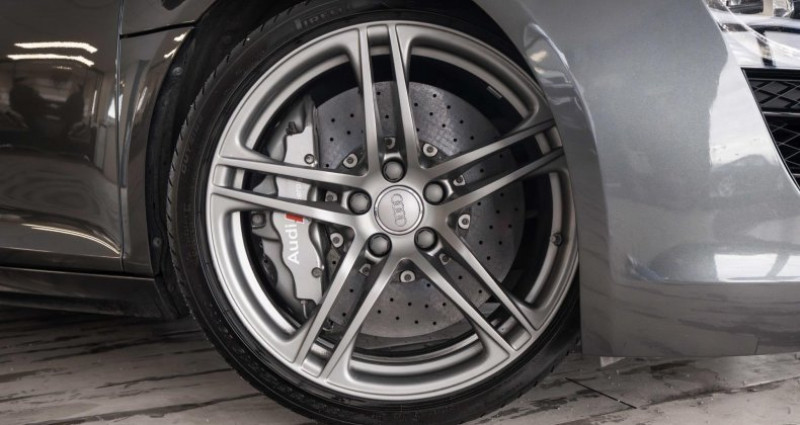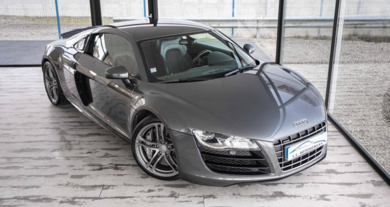 ======= OPTIONS ======= Applications décoratives en carbone sigma sur Monoposto, habillage sur la console centrale, vide-poches de portières, poignée de porte côté passager Compartiment moteur avec applications carbone sigma Freins céramique plus endurants et résistants Jantes en aluminium coulé style 5 branches doubles 8,5 J x 19? avec pneumatiques 235 35 R 19 à l'avant et 11 J x 19? avec pneumatiques 295 30 R 19 à l'arrière Parking System Plus avec caméra de recul : signal acoustique et visuel d'aide au stationnement avant et arrière avec caméra de recul permettant de visualiser l'arrière du véhicule sur l'écran couleur du MMI. Sellerie Alcantara et cuir Sellerie cuir Alcantara Audi exclusive Seuils de portes Audi exclusive éclairés par LED, avec baguette en aluminium et inscription R8 Sideblades carbone sigma ======= EQUIPEMENTS DE SERIE ======= 3ème feu stop arrière ABS : système antiblocage avec répartiteur électronique de freinage EBV et amplificateur hydraulique de freinage Airbags frontaux grand volume côté conducteur et passager avant avec 2 stades de gonflement suivant la gravité du choc Airbags latéraux (tête thorax) à l'avant, intégrés aux dossiers des sièges ; en cas de déclenchement d'un airbag, le système déverrouille les portières, allume l'éclairage intérieur, active les feux de Alarme antivol incluant protection volumétrique de l'habitacle et protection antiremorquage par capteur d'inclinaison désactivable Applications décoratives Gris micrométallique Appuie-tête actifs réglables en hauteur ASR (antipatinage) pour une motricité et une rigidité transversale optimales Assistant de démarrage en côte Audi Backguard Audi Magnetic Ride : suspension adaptative pilotée par champ magnétique Audi Premium Tracking System : système de localisation et d'immobilisation par satellite couplé à l'alarme antivol Avertisseur deux tons sur le moyeu du volant Badge V10 sur les ailes avant Bang & Olufsen Sound System : 465 watts, 12 haut-parleurs. Subwoofer de 130 mm dans un caisson Bass Reflex Boîte à gants verrouillable et éclairée avec rangement pour lunettes Calandre Singleframe laquée noir brillant Calandre spécifique : cadre laqué noir, grille avec baguettes horizontales et verticales chromées Carrosserie à architecture Audi Space Frame (ASF) ; innovante combinaison ultra rigide d'aluminium et de magnésium améliorant le dynamisme et la stabilité Ceintures de sécurité trois points à enrouleur avec prétensionneurs pyrotechniques, limiteurs de tension et réglage en hauteur Cendrier et allume-cigares sur la console centrale Changeur 6 CD sous l'espace de rangement derrière les sièges Châssis Sport avec ressorts et amortisseurs à réglage plus dynamique Chauffage des sièges conducteur et passager Ciel de pavillon en tissu noir ou gris lumière Climatisation automatique, sans CFC, avec réglage asservi à la position du soleil ; régulation électronique de la température, du débit et de la répartition de l'air ; position embouteillage et circuit fermé, filtre à charbon actif Cockpit de type Monoposto : arche entourant la casquette d'instrumentation et se prolongeant sur la portière conducteur et sur la console centrale Colonne de direction de sécurité, complète le potentiel de protection de la ceinture et de l'airbag ; réglable mécaniquement en hauteur et en profondeur Contrôle de la pression des pneumatiques Détecteur de pluie et allumage automatique des projecteurs Déverrouillage du capot moteur, de la malle avant et de la trappe à carburant depuis la place conducteur Diffuseur et extracteur d'air arrière spécifiques laqués noir Direction assistée électromécanique EBV : Répartiteur électronique de freinage Éclairage intérieur à LED à temporisation avec contacteurs sur les deux portières Eclaireurs et catadioptres sur toutes les portières Écrous antivol, ne s'enlèvent qu'à l'aide de l'adaptateur fourni EDS (blocage électronique de différentiel) Essuie-glace deux vitesses avec commande automatique Extensions de bas de caisse latérales Extracteurs d'air style aluminium à droite et à gauche du capot moteur Feux antibrouillard arrière Feux arrière entièrement à diodes, feux stop, troisième feu stop, clignotants, feux arrière et feu arrière de brouillard sous verre transparent, feux de recul et clignotants blancs Feux de jour à LED Fixation pour siège enfant ISOFIX côté passager avant, support pour fixation de siège enfant suivant norme ISO Frein à main mécanique Freinage : étriers fixes à huit pistons à l'avant et à quatre pistons à l'arrière, cartographie de servofrein adaptée, disques de freinage ajourés et ventilés à l'avant et à l'arrière, en deux par GPS Plus : système de navigation GPS Grille de boîte de vitesses manuelle en H, en acier Inscription R8 à l'arrière du véhicule et sur le compte-tours Instrumentation de bord spécifique V10 Instrumentation R8 spécifique gris micrométallique à éclairage réglable Lave-phares haute pression Livre de bord avec étui en Alcantara Lunette arrière dégivrante avec minuterie et antenne de vitre intégrée Moquette et tapis complémentaires en velours, couleur assortie à celle de l'habitacle Moulures de seuils de portes avec insert d'aluminium et inscription R8 Outillage de bord dans le coffre Pack Eclairage Pare-brise athermique en verre feuilleté avec bande grise sur la partie supérieure Pare-chocs enrobés de synthétique dans la couleur de la carrosserie Pare-soleil rabattables et pivotants, côtés conducteur et passager avant, avec miroir de courtoisie occultable Pédalier et repose-pied style aluminium Plafonnier à temporisation avec contacteur sur toutes les portières ; éclairage côté passager avant et dans le coffre Plaque d'identification V10 en carbone sigma sur le moteur Pommeau de levier de vitesses en aluminium avec anneau décoratif style aluminium Porte-boissons, double dans la c