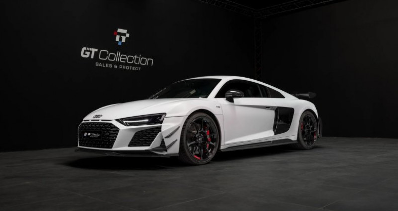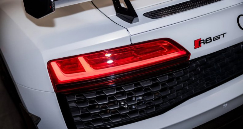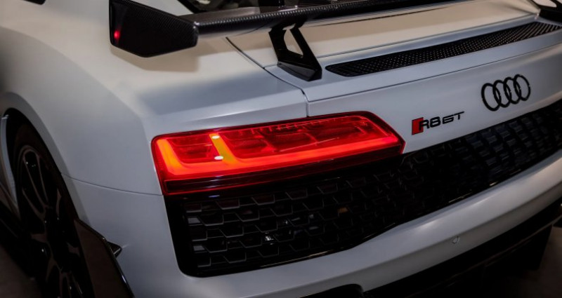 - EDS: Blocage électronique de différentiel et aide au démarrage - Pédalier et repose-pieds en acier inoxydable - Boîtiers de rétroviseurs extérieurs en carbone brillant Audi Exclusive - Capot moteur en carbone brillant - Pack Extérieur Carbone brillant Audi exclusive - Panneaux latéraux (Side blade) de couleur carbone brillant - Réservoir de carburant 83 litres (+10 litres) - Applications décoratives étendues carbone brillant pour l’encadrement de l’Audi virtual cockpit et des diffuseurs d’air - Jantes 20'' spécifiques R8 Coupé GT RWD AV : 8.5 J x 20 avec pneu 245/30 R20 et AR : 11 J x 20 avec pneu 305/30 R20 - Boîte de vitesses S tronic séquentielle à 7 rapports à double embrayage avec commande électrohydraulique - Applications décoratives en Carbone brillant - Freins céramique RS avec étriers de frein en Gris Anthracite - Châssis sport performance avec barre stabilisatrice CFK - Badge spécifique GT - Système d'échappement, enjoliveurs de sortie en noir brillant - Aide parking avec caméra de recul - Échappement sport - Étriers de freins noirs - Jantes noires - Peinture opaque - Radar de recul - Suspension sport - Sièges AV chauffants - Rétroviseur intérieur avec réglage jour/nuit automatique - Sellerie mixte Cuir/Alcantara - Audi Drive Select (Permet le réglage du mode de conduite) - Direction Dynamique - Réception radio numérique (DAB) - Audi Connect - Sièges baquets R8 - Volant Performance R8 3 branches en Cuir multifonction plus - Vitres athermiques teintées vertes et pare-brise en verre feuilleté acoustique - Baguettes de seuil de porte en Carbone brillant - Audi phone box avec recharge par induction - Navigation MMI avec MMI touch - Éclairage d'accueil LED de portières - Audi Smartphone Interface - Réglage électrique en hauteur des 2 sièges AV (le réglage longitudinal est manuel, pour permettre un gain de poids) - Climatisation automatique confort spéciale R8 (avec réglage asservi à la position du soleil) - Rétroviseurs extérieurs réglables, dégivrants, rabattables électriquement avec fonction rabat auto et jour/nuit auto - Câble de recharge pour téléphone portable - Intérieur spécifique R8 Coupé GT RWD (noir avec surpiqûres rouges, ceintures rouges, numéro XXX/333, surtapis noirs avec liseret rouge et badge R8 GT) - Ciel de pavillon en tissu noir - Pack éclairage - Audi Virtual Cockpit - Clé confort (keyless) avec ouverture/fermeture des portes et démarrage sans clé - Kit de 1er secours avec triangle de signalisation - Outillage de bord dans le coffre - Tire mobility system (TMS) avec compresseur 12 V et produit de colmatage (remplace roue de secours) - ASR - EBV : Répartiteur électronique de freinage - Système Start & Stop avec récupération d'énergie au freinage - Affichage du contrôle de pression des pneumatiques - Phares à LED avec éclairage laser Audi - Caméra de recul - Assistant de feux de route - Feux AR à LED avec clignotants dynamiques - ABS : système antiblocage avec répartiteur électronique de freinage EBV et amplificateur hydraulique - Airbags frontaux grand volume (désactivable côté passager) - ESP : programme électronique de stabilisation (désactivable en deux temps, relie ABS, EBV, ASR, capteurs) - Allumage automatique des feux et des essuie-glaces (capteur pluie/luminosité) - Audi Parking System Plus - Régulateur/Limiteur de vitesse - Airbags latéraux (tête/thorax) à l'AV intégrés aux dossiers des sièges - Alarme antivol - Bang & Olufsen Sound System - Ciel de pavillon en Alcantara - Pack Esthétique Noir plus - Suspensions réglables
