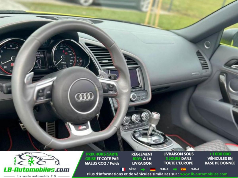 Référence : 1189880 Vos Avantages chez LB-AUTOMOBILES.com / Prix affiché TTC Livré hors carte grise / Livraison sous 10 jours dans toute la France hors 31 / Pas d?avance de frais paiement du véhicule 100% à la livraison par virement. Audi R8 Neuf remisée, Audi R8 Occasion Toulouse Beaupuy 31850, Audi R8 Véhicule sorti de réseau collaborateur, Audi R8 import, Audi R8 importateur, Audi R8 Livraison possible dans toute la France sous 5 jours, Audi R8, Audi R8 Location Option Achat, Audi R8 LLD, Audi R8 Longue Durée, Audi R8 TVA récupérable. Possibilité d'extension de garantie 12, 24,36 mois, Pour tout autres voitures import neufs ou occasions collaborateur fortement remisée, Mandataire Audi, Mandataire BMW, Mandataire Volkswagen, Mandataire Mercedes, Mandataire Peugeot Espagne, Mandataire Renault Espagne, Porsche import, Mandataire Citroën Espagne, Mandataire Seat Espagne, n'hésitez pas à nous contacter. « Sous réserve de vente préalable et erreur de saisie » Principaux équipements : - 4x4 - ABS - Accoudoir - Antidémarrage - Bluetooth - Boîte de vitesses robotisée - Capteur de pluie - Carnet d'entretien - Contrôle de la pression des pneus - Direction assistée - ESP - Fermeture centralisée - Feux de jour - GPS - Hayon électrique - Isofix - Jantes alliage - Kit de préparation pour système de navigation - Kit mains libres - Ordinateur de bord - Pack sport - Phares LED - Pneus été - Point Isofix siège passager - Port USB - Réglage électrique des sièges - Régulateur de vitesse - Rétroviseur extérieur électrique - Rétroviseur intérieur anti-éblouissement automatique - Révision complète - Sièges chauffants - Sièges sport - Suspension sport - Système antipatinage - Système d'alarme - Système de limitation de la vitesse - Système de nettoyage des phares - Système de sonorisation - Tuner/radio - Véhicule non-fumeur - Vitres électriques - Vitres teintées - Volant multifonction