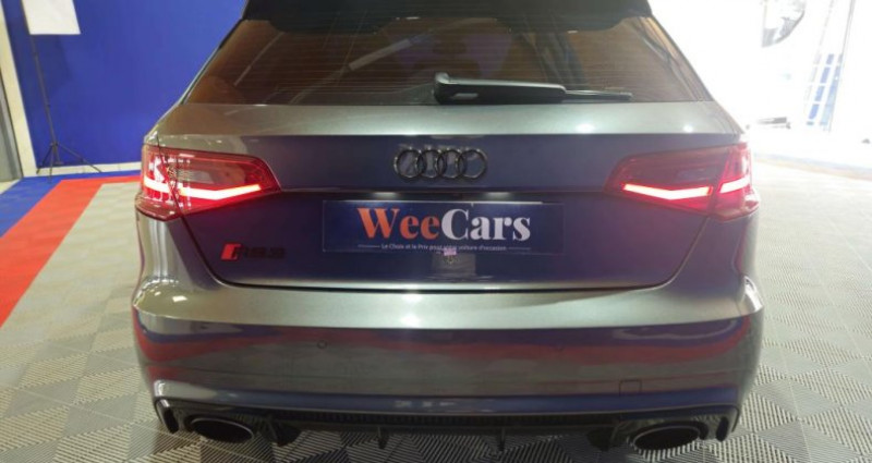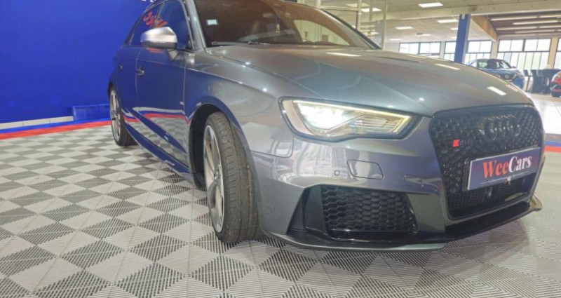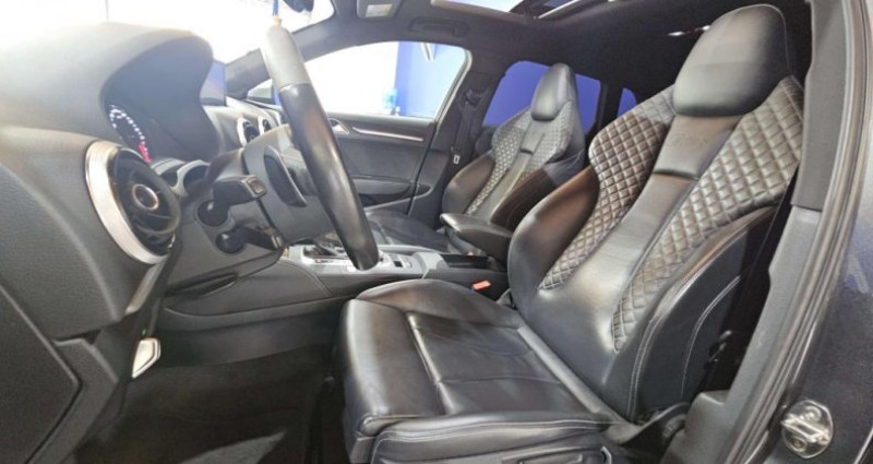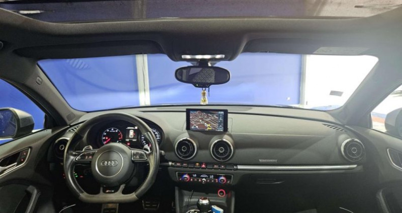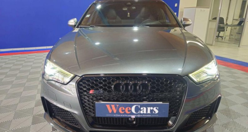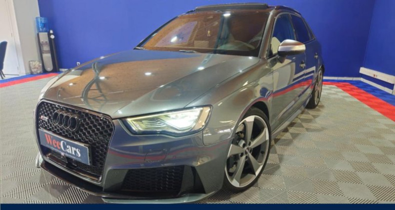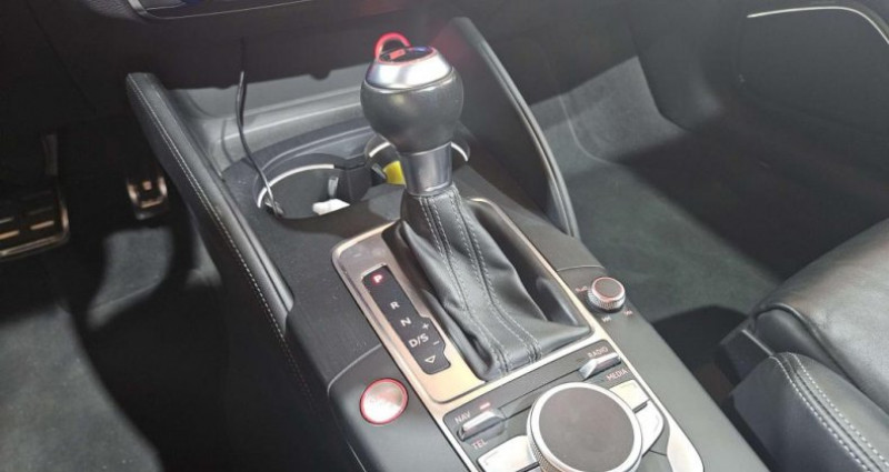 ======= OPTIONS ======= Accoudoir central arrière avec porte-boissons, trappe à skis Adaptive Light : projecteurs directionnels Airbags latéraux à l'arrière Appui lombaire à 4 axes avec réglage électrique, pour les sièges conducteur et passager avant, réglage horizontal et vertical Audi Active Lane Assist Audi connect en combinaison avec le MMI GPS advanced avec MMI Touch Audi Hold Assist : maintient le véhicule à l'arrêt en côte comme en descente, sans limite de temps. Le système est activé par pression sur une touche et permet au conducteur un redémarrage confortable sans actionner le frein à main Audi magnetic ride : système d'amortisseurs adaptatifs permettant de choisir soi-même le réglage du châssis Audi Phone Box Audi pre sense Bang & Olufsen Sound System Caméra de recul : avec affichage de la zone située derrière le véhicule sur l'écran MMI Etriers de frein laqués rouge avec inscription RS à l'avant Jantes en aluminium coulé Audi Sport style 5 branches en hélice, finition titane mat, polies brillant 19 MMI GPS Advanced avec MMI touch Pack Design RS Pack esthétique noir brillant Phares à LED Rétroviseurs extérieurs escamotables électriquement, dégivrants, jour nuit automatique côté conducteur et buses de lave-glaces dégivrantes Sièges avant chauffants Sièges avant réglables électriquement Sièges Sport RS à l'avant en cuir Nappa avec surpiqûres diamant Sorties d'échappement Sport RS pour une sonorité encore plus sportive Toit panoramique en verre : commande électrique pour relever et ouvrir la partie avant en verre, fonctionnement automatique pour l'ouverture et la fermeture, zone en verre teinté avec pare-soleil réglable en continu Vitesse maximale (Vmax) relevée à 280 km h Vitres surteintées (privacy glass) : lunette arrière et vitres latérales arrière surteintées ======= EQUIPEMENTS DE SERIE ======= 4 oeilletons de fixation dans le coffre Accoudoir central avant coulissant en longueur, avec vide-poches relevable et inclinaison réglable Advanced Key : système d'autorisation d'accès et de démarrage main libre Ailes avant avec passages de roues élargis Airbag genoux conducteur Airbags grand volume pour le conducteur et le passager Airbags latéraux à l'avant intégrés au dossier des sièges Alarme antivol incluant protection volumétrique de l'habitacle et protection antiremorquage par capteur d'inclinaison désactivable Allume-cigare et cendrier amovible, couvercle chromé avec anneaux Audi, allume-cigare sur la console centrale au lieu de la prise 12 volts de série Applications décoratives sur les contre-portes et tableau de bord style 3D noir ASR (antipatinage) Assistance hydraulique au freinage d'urgence Assistant de freinage en cas de collision, en cas d'accident Audi Drive Select : différents réglages du véhicule à travers trois modes Audi parking system plus : signal acoustique et visuel d'aide au stationnement avant et arrière par pictogrammes sur l'écran Audi Premium Tracking System Audi Sound System avec 10 haut-parleurs Baguettes décoratives sur les vitres latérales style aluminium mat ; revêtement noir brillant sur les montants de pavillon centraux extérieurs et les triangles de portières arrière Becquet arrière RS3 laqué dans la couleur de la carrosserie, au niveau du pavillon avec inserts aérodynamiques latéraux noir brillant Boîte à gants grand volume côté passager avant, éclairée Cache-bagages amovible Calandre Audi singleframe avec grille de calandre à structure alvéolée noir brillant et encadrement d'une seule pièce style aluminium mat ; ouvertures d'entrées d'air en noir brillant Carrosserie galvanisée Ceintures de sécurité 3 points automatiques pour toutes les places, prétensionneurs pyrotechniques, réglage des ceintures en hauteur à l'avant ; limiteurs de tension sur toutes les places extérieures Châssis Sport RS Ciel de pavillon en tissu noir Clé à fréquence radio, avec emblème RS Climatisation automatique Confort avec réglage asservi à la position du soleil, réglage de température gauche droite séparé Contrôle de ceinture attachée pour toutes les places ; un signal acoustique et visuel à l'avant prévient lorsque la ceinture n'est pas fixée, un signal visuel à l'arrière attire l'attention sur la fixation des ceintures Contrôle de pression des pneus ( TPMS ) Contrôle électronique de stabilisation (ESC) désactivable Détecteur de pluie et de luminosité incluant bande grise dans la partie supérieure du pare-brise Direction progressive contribuant à une augmentation de la dynamique de conduite grâce à une démultiplication directe et progressive Disques de frein ventilés à l'arrière Disques de frein Wave en matériau composite, ventilés et perforés à l'avant Dossier de banquette arrière rabattable en deux parties 40 60 ou complètement Ecrous antivol EDS (blocage électronique de différentiel) Essuie-glace arrière avec déclenchement automatique en marche arrière Etriers laqués noir extra brillant, avec inscription RS à l'avant Extensions de bas de caisse couleur carrosserie Feux arrière avec feux de recul blancs et feux de brouillard arrière, incluant troisième feu stop surélevé et éclairage de plaque à LED Feux de freinage adaptatifs (déclenchement des feux de détresse automatique) Feux de route assistés : gestion automatique du passage de feux de croisement à pleins phares et inversement Fixation pour sièges enfants ISOFIX et Top Tether pour les places arrière extérieures Frein de stationnement electromécanique Identification du modèle technologie sur le capot de coffre Inscription quattro sur le tableau de bord côté passager Inscription quattro sur la calandre, le capot de coffre et le tableau de bord côté passager Inscriptions RS3 sur la calandre, le capot de coffre, les baguettes des seuils de portes, le volant Sport, le pommeau de levier de vitesses et le compte-tours Lave-essuie-glace 2 vitesses, 4