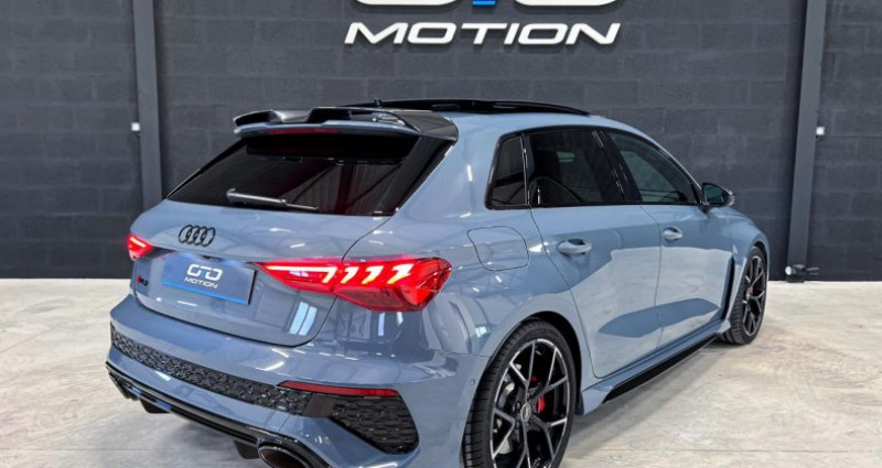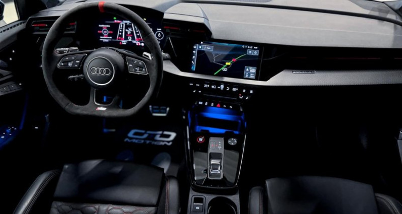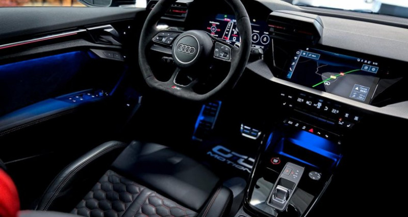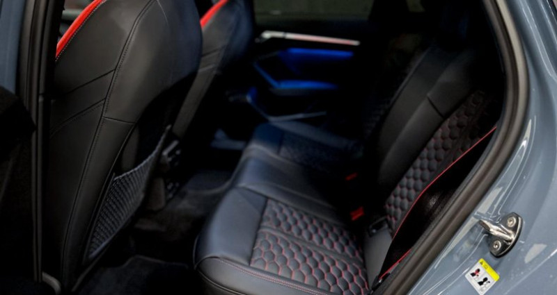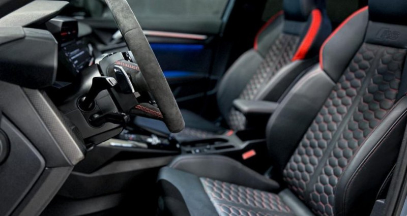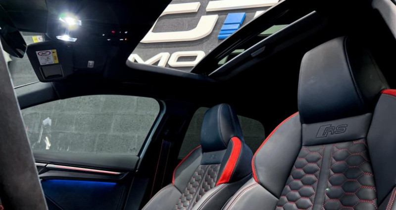 ======= OPTIONS ======= Système d'échappement sport RS Appuis lombaires à 4 axes pour les sièges AV Audi Pre Sense Basic Audi smartphone interface Bang & Olufsen Premium Sound System avec son 3D Restitution sonore grâce à 17 HP incluant des HP au son 3D, 1 HP central et un subwoofer, ainsi qu'un amplificateur à 16 canaux d'une puissance totale de 730 watts Ceintures de sécurité avec bordure rouge Hayon assisté électriquement pour l'ouverture et la fermeture Jantes style à 5 branches en Y noir avec impression graphique 9,0J x 19pneus 265 30 AV, 8,0J x 19pneus 245 35 AR Phares Matrix LED avec clignotants dynamiques AV AR Sellerie en cuir Nappa fin avec surpiqûres contrastés et embossé RS Sièges AV chauffants Tapis complémentaires noirs avec inscription RS et surpiqûres contrastées rouges Toit panoramique Vitrage Privacy : lunette AR, vitres de portières AR et vitres latérales AR surteintées Volant plat rond en alcantara avec surpiqure rouge ======= EQUIPEMENTS DE SERIE ======= Extérieur RS avec équipement extérieur RS en noir mat Calandre noir mat, Diffuseur noir mat Accoudoir central coulissant en longueur, avec inclinaison réglable Adaptative Cruise Control Airbags latéraux AV et système d'airbags de tête Alerte de sortie de voie Appel d'urgence Audi connect Audi Connect Appel d'urgence Audi Drive Select Audi Park Assist Audi pre sense front Banquette AR variable, 40:20:40 Boîte à gants éclairée Boîte à gants verrouillable Boîtiers de rétroviseurs extérieurs en Noir Caméra de recul Ciel de pavillon en tissu noir Climatisation automatique confort 2 zones Combiné d'instruments numérique Digital Cockpit avec design spécifique RS supplémentaire 10,25 Commande de désactivation de l'airbag passager AV Compartiment de rangement côté conducteur Contrôle de la pression des pneus Détecteur de pluie et de luminosité Deuxième lumière LED à gauche du coffre à bagages Direction progressive Dispositif de limitation de vitesse Eclairage à droite dans le coffre Ecrous de roues antivol Filet de compartiment bagage Filet de rangement AR des sièges AV I-Size et Top Tether pour les sièges AR extérieurs Inserts décoratifs en carbone Atlas Structure Interface Bluetooth Kit réparation MMI Navigation plus avec MMI touch MMI Radio Plus Module de pavillon AV et AR incluant spots de lecture Pare-brise à vitrage acoustique Peinture métallisée Gris Kemora Prise 12V dans la console centrale AR Prise 12V dans le coffre Réception radio numérique (DAB) Rétroviseur intérieur jour nuit automatique sans encadrement Rétroviseurs extérieurs réglables, dégivrants, rabattables électriquement avec fonction rabat automatique, (côté passager AV, marche AR enclenchée) et fonction jour nuit automatique des deux côtés Rappel de ceinture de sécurité avec dispositif AR de détection d'occupation du siège Sécurité enfant électrique Sièges AV Sport Suppression d'identification moteur Trousse de secours Volant cuir Sport multifonctions Plus 3 branches avec méplat et palettes de commande au volant Nb. Vitesses : 7 Conso Mixte : l/100