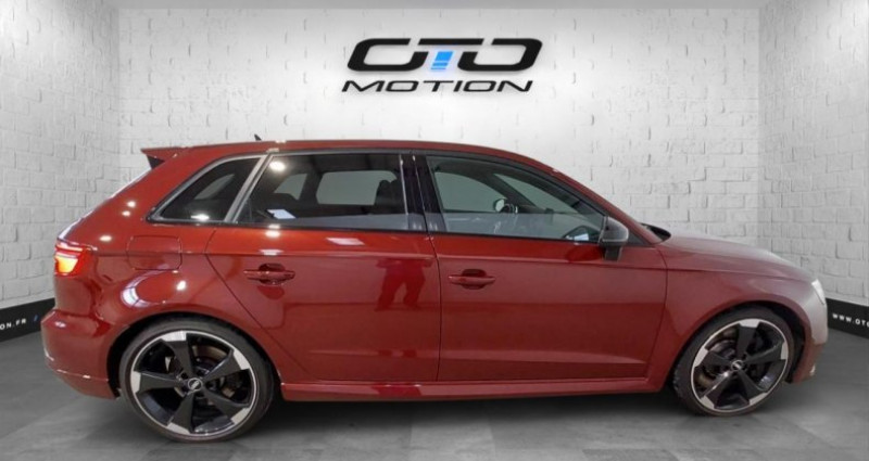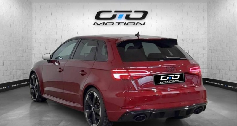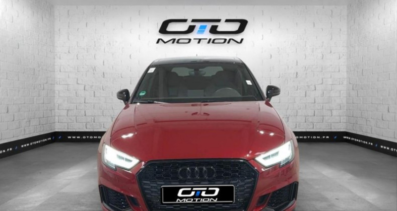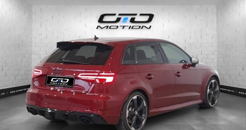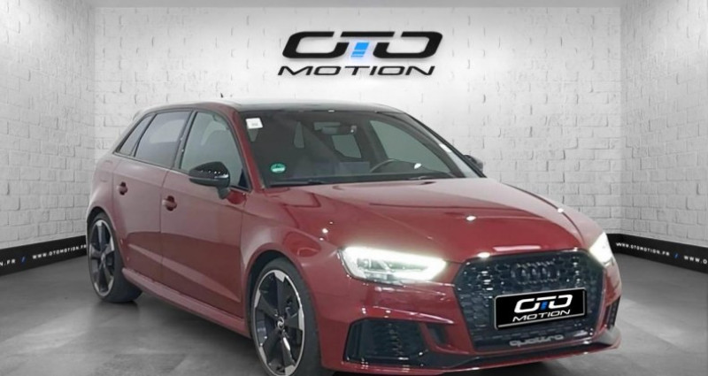 ======= OPTIONS ======= Sorties d'échappement Sport RS pour une sonorité encore plus sportive ; à double flux, avec commande des clapets d?échappement et embouts ovales noir brillant Accoudoirs dans les contreportes en cuir synthétique noir avec surpiqûres contrastées rouges Airbags latéraux AR Applications décoratives aluminium compétition éclairage design Appuis lombaires à 4 axes avec réglage électrique pour les sièges conducteur et passager AV réglage horizontal et vertical Appuis lombaires à 4 axes avec réglage électrique pour les sièges conducteur et passager AV réglage horizontal et vertical Audi Magnetic Ride: Système d'amortisseurs adaptifs Audi Phone Box avec charge du téléphone par induction (standard Qi) Bang & Olufsen Sound System Banquette AR divisée en 3 parties 40 20 40 avec accoudoir central Buses de lave-glace degivrantes Ceintures de sécurité noires avec bordure rouge Coques de rétroviseurs extérieurs en teint Audi exclusive noir brillant Diffuseurs d'air rouges Extension de garantie 1 an supplémentaire (2 + 1) ou 60000 km Jantes en aluminium coulé style rotor 5 branches, noir anthracite finition brillantes avec pneus 235 35 R19 Pack vide-poches coffre à bagages avec offre étendue de prises 12 V et USB Peinture Audi exclusive Réception radio numérique (DAB) Rétroviseurs extérieurs réglables, dégivrants et rabattables électriquement avec position automatique pour manoeuvre de stationnement et fonction jour nuit automatique côté conducteur Rétroviseurs extérieurs réglables, dégivrants et rabattables électriquement avec position automatique pour manoeuvre de stationnement et fonction jour nuit automatique côté conducteur Repose-genoux sur la console centrale en Alcantara noir avec surpiqûres contrastées rouges Sellerie cuir Nappa fin avec surpiqûres diamant et estampillage RS Sièges AV chauffants Sièges AV chauffants Sièges Sport RS à l?AV Tapis complémentaires noirs avec inscription RS3 et surpiqûres contrastées rouges Toit panoramique en verre Vitesse maximale relevée à 280 km h Vitres AR surteintées (Privacy glass) : lunette et vitres latérales AR surteintées ======= EQUIPEMENTS DE SERIE ======= Suppression totale de l'indication du modèle et de la technologie Nb. Vitesses : 7 Conso Mixte : l/100