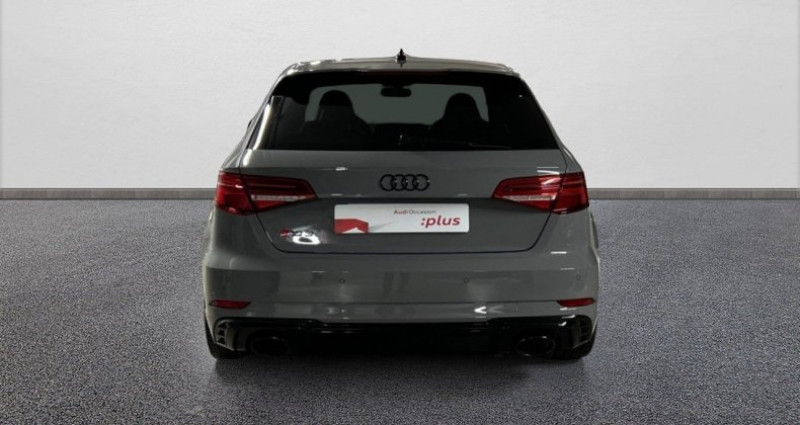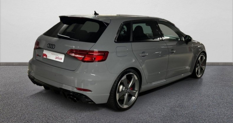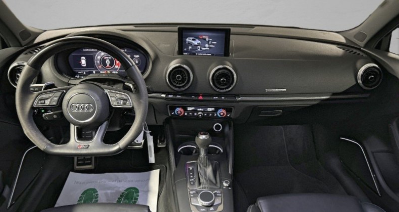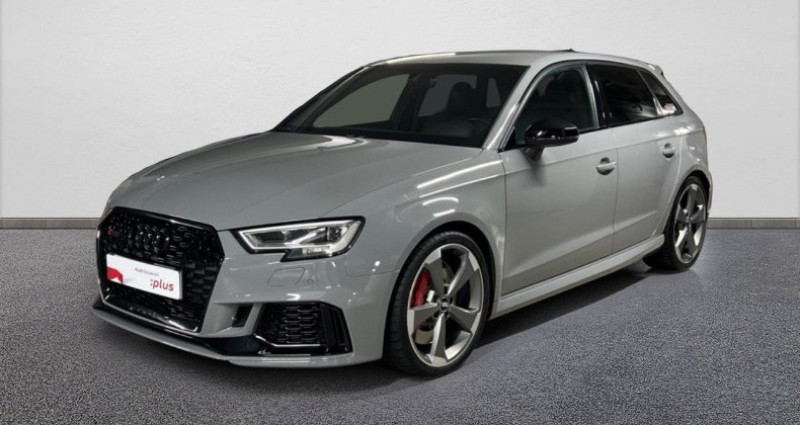 Cylindrée : 2480 cm3 Nb. Vitesse : 7 - Pack Cuir étendu *** Avec : Eléments de l'habitacle étendu en simili-cuir - Vitesse maximale relevée à 280 km/h - Sorties d'échappement Sport RS pour une sonorité encore plus sportive ; à double flux, avec commande des clapets d?échappement et embouts ovales noir brillant - Sellerie cuir Nappa fin avec surpiqûres diamant et estampillage RS - Sièges Sport RS à l?AV - Jantes en aluminium coulé style rotor à 5 branches en style titane mat finition brillantes avec pneus : 255/30R19 AV et 235/35 AR - Bang & Olufsen Sound System - Vitres AR surteintées (Privacy glass) : lunette et vitres latérales AR surteintées - Airbags latéraux AR - Sièges AV chauffants - Banquette AR divisée en 3 parties 40/20/40 avec accoudoir central - Appuis lombaires à 4 axes avec réglage électrique pour les sièges conducteur et passager AV réglage horizontal et vertical - Coques de rétroviseurs extérieurs en couleur carrosserie - Fixation pour siège-enfant ISOFIX pour le siège du passager AV - Tapis réversible pour coffre (velours et gomme) - Rétroviseurs extérieurs réglables, dégivrants et rabattables électriquement avec position automatique pour manoeuvre de stationnement et fonction jour/nuit automatique côté conducteur - Audi Virtual Cockpit - Baguettes décoratives sur les vitres latérales style aluminium mat, revêtement noir brillant sur les montants de pavillon centraux et les triangles de portes AR - Calandre Audi singleframe avec grille de calandre à structure alvéolée noir brillant et encadrement d'une seule pièce style aluminium mat; incluant inscription quattro en noir mat - Climatisation automatique bi-zone - Frein de stationnement électromécanique - Jantes en alliage léger en style à 5 branches, ultrabrillantes, avec pneus 235/35 R19 - MMI Navigation plus avec MMI touch - Pack Aluminium Extérieur *** Avec : Encadrement des vitres latérales et baguettes en aluminium anodisé - Pack Aluminium Intérieur *** Avec : Bouton de réglage des rétroviseurs en aluminium *** Avec : Diffuseurs d'air style aluminium *** Avec : Boîte à gants en aluminium *** Avec : Lève-vitres, encadrement de la commande intérieure de verrouillage des portières, porte-monnaie, touches de commande du frein de stationnement et - le cas échéant - de l?Audi hold assist en aluminium - Pack Eclairage *** Avec : Miroirs de courtoisie éclairés *** Avec : Eclairage au sol et éclairage au niveau des pieds à l'AV ainsi qu'éclairage des poignées intérieures de portières *** Avec : Lumière réfléchie pour la console centrale et l'intérieur des portières *** Avec : Eclairage anti-éblouissant de l'intérieur du véhicule à LED *** Avec : 2 Spots de lecture AV et AR *** Avec : Porte-boissons éclairés - Pack Rangement et coffre - Phares intégralement à LED (full LED) avec clignotants AR dynamiques - Rétroviseur intérieur jour et nuit automatique - Rétroviseurs extérieurs réglables, dégivrants et rabattables électriquement avec position automatique pour manoeuvre de stationnement - Rétroviseurs extérieurs style aluminium mat avec rappels de clignotant à LED, asphérique côté conducteur, convexe côté passager AV, dégivrants et escamotables électriquement - Sellerie cuir Nappa fin avec estampillage RS - Seuils de portes avec inserts en aluminium et emblème RS3 - Volant Sport 3 branches multifonction en cuir avec méplat et palettes de changement de vitesse - ABS avec répartiteur électronique de freinage EBV, programme électronique de stabilisation ESC avec détection de barres de toit et assistance au freinage d?urgence - Accoudoir central AV avec vide-poches relevable et inclinaison réglable et coulissant en longueur - Advanced Key - Ailes AV avec passages de roues élargis - Airbags frontaux côté conducteur et passager avec airbag de genoux et désactivation de l'airbag passager - Airbags frontaux côtés conducteur et passager - Airbags latéraux (airbag thorax et bassin à l'AV) et système d'airbag de tête - Alarme antivol - Applications décoratives sur les contre-portes et tableau de bord style 3D gris titane - Appuis-tête intégraux à l?AV et à l?AR - ASR (antipatinage) pour une motricité et une rigidité transversale optimale. Réduit le patinage des roues motrices. - Audi Connect avec une carte SIM de données intégrée (valable pour 36 mois) - Audi Drive Select - Audi Hold Assist - Audi Parking System Plus - Audi Smartphone interface (Apple CarPlay ou Google AndroidAuto) - Audi Sound System 10 haut-parleurs incluant un haut-parleur central et un subwoofer ; amplificateur à 6 canaux avec une puissance totale de 180 watts - Becquet AR RS3 laqué dans la couleur de la carrosserie, au niveau du pavillon avec inserts aérodynamiques latéraux noir brillant - Buses de lave-glace degivrantes - Châssis Sport RS avec tarage dynamique des ressorts et des amortisseurs - Ciel de pavillon en tissu noir - Clé à fréquence radio avec emblème RS - Direction progressive - Détecteur de pluie et de luminosité - Extentions de bas de caisse couleur carrosserie - Feux de route assistés - Freins à disques sur les essieux AV et AR - Identification du modèle /technologie sur le capot de coffre - Inscription RS3 sur la calandre, le capot de coffre, les baguettes des seuils de portes, le volant Sport, le pommeau de levier de vitesse et le compte-tours - Kit anticrevaison - Lave-phares - Pare-brise acoustique ameliore l'isolation phonique du pare brise et réduit les bruits exterieurs - Pare-chocs spécifiques RS style dynamique et sportif - Pédalier et repose-pieds en acier inoxydable - Roues avec écrous antivol - Récupération d'énergie - Régulateur de vitesse - Sièges AV Sport - Tapis de sol AV/AR - Tracking system pour Audi - Triangle de présignalisation - Trousse de secours - Volant réglable manuellement en hauteur et en profondeur