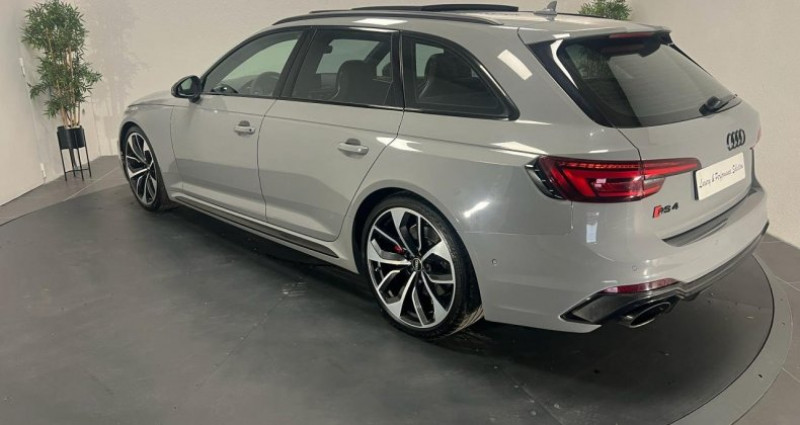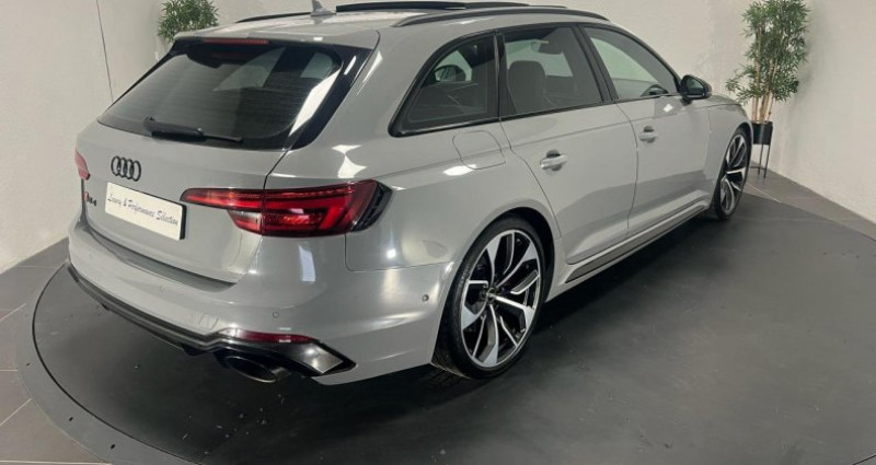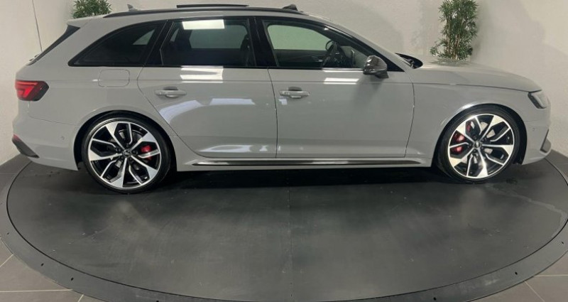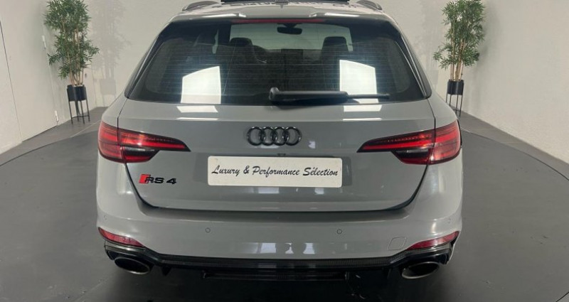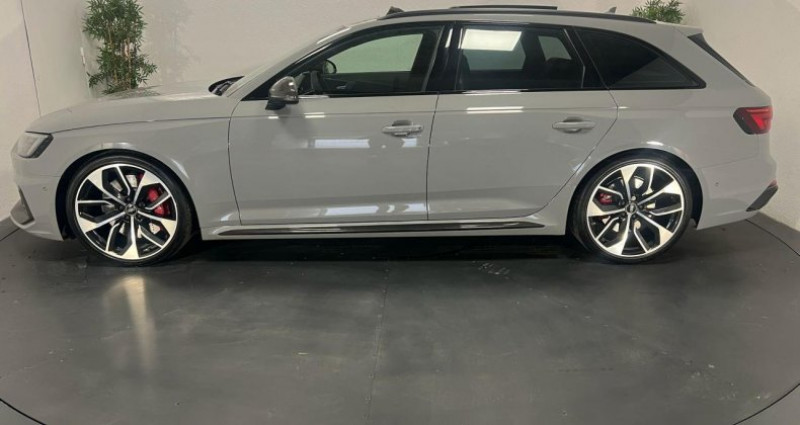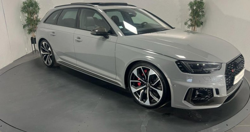 ======= OPTIONS ======= Affichage tête haute Applications décoratives Carbone Assistant de feux de route Audi Active Lane Assist Audi Hold Assist, maintient le véhicule à l'arrêt, aussi bien en côte qu'en descente, sans limite de temps Augmentation de la vitesse de pointe à 280 km h Bang & Olufsen sound system avec son en 3D Clé confort + Alarme antivol avec fonction safelock Différentiel quattro Sport : répartition dynamique de couple droite gauche sur l'essieu arrière Direction dynamique : augmente la dynamique et le confort de conduite grâce à une régulation dynamique de la direction en fonction de la situation de conduite Echappement Sport RS incluant sonorité encore plus travaillée et sorties d?échappement noires Eléments de l'habitacle en cuir Nappa fin Etriers de frein laqués rouge brillant avec inscription RS à l'avant et à l'arrière Jantes aluminium forgé, 5 branches doubles Edge, 20 Lecture des panneaux de signalisation (RSA) Pack Assistance Route Pack Design RS Pack Esthétique carbone & noir brillant Pack Esthétique noir brillant Réception radio numérique (DAB) Sellerie cuir Nappa fin Sièges avant et arrière chauffants Toit panoramique ======= EQUIPEMENTS DE SERIE ======= Accoudoir central confort à l'avant avec inclinaison réglable et coulissant en longueur Airbags grand volume pour le conducteur et le passager Airbags latéraux à l'avant et système d'airbags de tête Antipatinage électronique ASR Applications décoratives en aluminium Racing Audi connect Audi connect Sécurité et Service Audi Drive Select Audi phone box avec chargeur sans fil Audi smartphone interface Audi Sound System Audi Tracking System Audi virtual cockpit Blocage électronique de différentiel EDS Cache-bagages électrique Calandre singleframe structure nid d'abeilles, inscription quattro et logo RS 4 Ceintures de sécurité automatiques à trois points pour tous les sièges et contrôle de port de ceinture à l avant Cendriers et allume-cigares Châssis Sport RS Ciel de pavillon en tissu noir Clé confort Climatisation automatique Confort Plus 3 zones à fonctionnalités étendues et affichage numérique Colonne de direction de sécurité : contient un système mécanique de déplacement avec fonction d'amortissement qui complète le potentiel de sécurité de la ceinture et de l'airbag Contrôle de pression des pneus ( TPMS ) Coques de rétroviseurs extérieurs en aluminium Détecteur de pluie et allumage automatique des projecteurs Deux sorties d'échappement chromées droite et gauche Direction assistée électromécanique Dossier de banquette arrière rabattable en trois parties 40 : 20 : 40 ou complètement Ecrous antivol Eléments de l'habitacle en similicuir ESC (contrôle électronique de stabilisation) Fixation pour sièges enfants ISOFIX et Top Tether pour les places arrière extérieures Fixations ISOFIX pour le siège passager avant + désactivation de l'airbag Frein de stationnement electromécanique Grilles d'entrée d'air latérales et applications en aluminium mat, spoiler avant noir, baguettes latérales en noir, diffuseur arrière noir et baguette horizontale en aluminium mat Hayon à ouverture et fermeture automatiques Inscriptions RS 4 sur les ailes avant Interface Bluetooth Lave-phares Limitateur et régulateur de vitesse MMI navigation plus avec MMI touch Outillage de bord et cric Pack Assistance City Pack Eclairage Pare-chocs spécifiques RS style dynamique et sportif Peinture vernie Gris Nardo Phares à LED avec clignotants arrière à LED dynamiques Projecteurs avant et phares arrière foncés Quattro: transmission intégrale permanente avec répartition asymétrique et dynamique de couple Rétroviseur intérieur électrochrome Rétroviseurs extérieurs avec clignotants à LED intégrés Rétroviseurs extérieurs jour nuit automatiques Rétroviseurs extérieurs réglables et escamotables électriquement, dégivrants des deux côtés et buses de lave-glaces dégivrantes Rampes de pavillon en Aluminium Recommandation de repos qui analyse le comportement routier au moyen de différents capteurs Sellerie cuir Alcantara avec surpiqûres contrastées et embossé RS Sièges avant avec réglage lombaire électrique et fonction massage Sièges avant chauffants Sièges avant réglables électriquement avec fonction mémoires pour le siège conducteur Sièges Sport RS à l'avant avec appuie-tête intégrés Système d'arrêt et de redémarrage automatique du moteur Stop & Start Tapis de sol avant et arrière Tiptronic : boîte automatique 8 rapports avec programme de commande dynamique (DSP) Tire Mobility System : compresseur et produit de colmatage en cas de crevaison Triangle de pré signalisation Trousse de secours Vitres athermiques Volant 3 branches multifonctions plus en cuir avec méplat avec logo RS Nb. Vitesses : 8 Conso Mixte : l/100