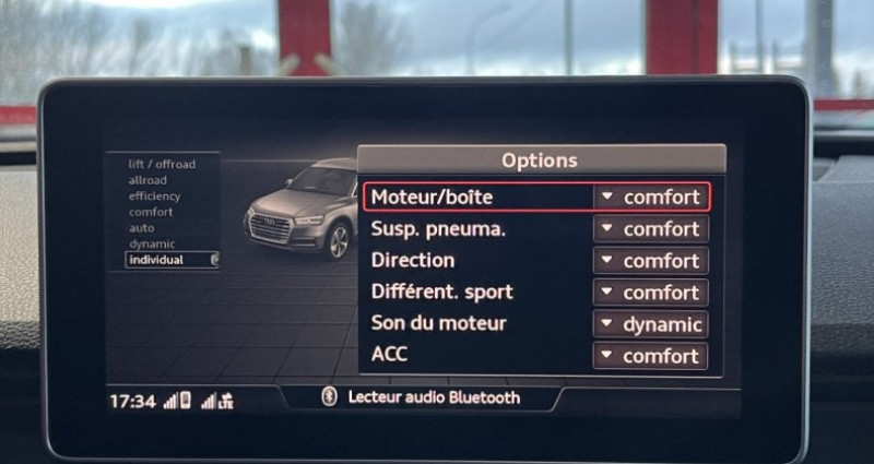 AUDI SQ5 3,0 V6 TDI 347 QUATTRO BVA8 , NOIR FULL OPTIONS DANS UN EXCELLENT ETAT PRIX DU VEHICULE NEUF 76980 € HORS OPTIONS PRIX DES OPTIONS 20790 € VEHICULE DE DEUXIEME MAIN AVEC UN HISTORIQUE LIMPIDE EXCLUSIF AUDI VÉHICULE SOIGNÉ AVEC UNE BELLE CONFIGURATION D'OPTIONS GARANTIE DANS TOUS LES RESEAUX AUDI FRANCE OU EUROPE CARNET D'ENTRETIEN À JOUR EXCLUSIF AUDI REVISION OK DOUBLE DE CLÉ AUCUN FRAIS À PRÉVOIR EQUIPEMENTS - Écran tactile Sono Hi-Fi Caméra de recul Prise auxiliaire Prise USB Préparation téléphone Système Bluetooth Commandes audio au volant Compatibilité MP3 Ordinateur de bord Système de navigation Feux de jour Aide au démarrage en côte Suspensions sport Sièges avant sport Éco mode Essuie-glace automatique Limiteur de vitesse Pack électrique Start and stop Rétroviseurs rabattables électriquement Régulateur de vitesse adaptatif Driving mode selection Rétroviseurs électriques dégivrants Vitres arrières teintées Vitres teintées Attelage Volant sport Toit panoramique Barre de toit Allumage auto des feux Accoudoir central Détecteur de pluie Démarrage sans clé Volant cuir Jantes alliage Rétroviseurs électriques Feux à LED Aide au stationnement Radar de recul Régulateur de vitesse Chauffage auxiliaire Sellerie cuir Sièges chauffants Sièges électriques Vitres électriques Direction assistée Toit ouvrant Climatisation automatique Front assist Vérouillage centralisé à distance Airbags genoux Airbags rideaux Fixation Isofix Vérouillage centralisé Feux anti-brouillard Anti-démarrage Airbags latéraux Airbag conducteur 4x4 Anti-patinage ESP ABS