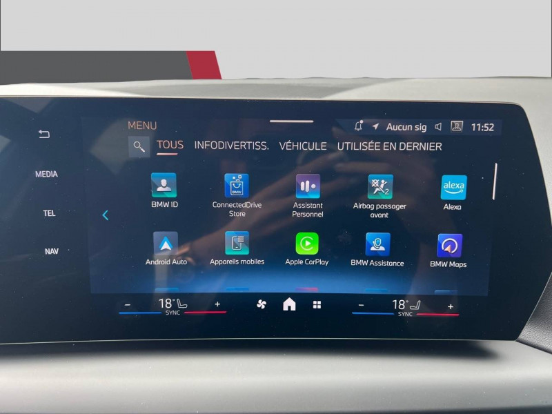 2 porte-gobelets sur la console centrale / 2 ports USB Type C dans la console centrale + 2 à l'AR / 3ème feu stop à LED sur la lunette AR / Accoudoir central AV avec compartiment de rangement / Active Guard - Avertissement de sortie de voie - Avertissement de collision frontale avec intervention sur les freins - Avertissement de virage à gauche (véhicule) avec fonction de freinage - Indicateur de limitation de vitesse - Assistant d'évitement / Airbags de tête AV et aux places latérales AR / Alarme antivol / Appel d'Urgence Intelligent (durée de vie de la voiture) Appel automatique vers le centre d'assistance BMW en cas d'accident. Touche SOS pour Appel d'Urgence manuel. Les données importantes sont automatiquement transmises aux secours : identification et localisation de la voiture, nombre de passagers à bord, statuts des airbags. Ce service utilise la carte SIM montée d'usine et ne requiert pas l'utilisation du smartphone. / Appuis-tête et ceintures de sécurité 3 points à toutes les places / BMW Curved Display / BMW Intelligent Personal Assistant / BMW Live Cockpit Navigation Plus / BMW "My Modes" (Personal/ Efficient/ Sport) / Boîte de vitesses automatique à double embrayage DKG7 à 7 rapports / Calandre avec encadrement en chrome et barreaux verticaux / diagonaux / Capteurs d'impact - Activation de l'airbag, des feux de détresse, de l'éclairage intérieur - Déverrouillage des portes et légère ouverture des vitres / Compartiment à bagages : 2 crochets de sac, filet sur panneau droit / Contrôle de stabilité dynamique (DSC) avec dotation élargie - Assistant de démarrage en côte - Assistant dynamique de motricité (DTC) / Désignation du modèle à droite du hayon / Détecteur d'accident (crash sensor) - Allume les feux de détresse - Déverouillage des portes / Détecteur de pluie et allumage automatique des projecteurs / Déverrouillage électrique du coffre via la volet de coffre ou la clé radiocommandée / Driving Assistant - Avertisseur de franchissement de ligne (>70km/h avec vibrations dans le volant) - Avertisseur d'angle mort (>20km/h avec voyant d'alerte) - Avertisseur de risque de collision AV (>15km/h, préconditionnment du freinage >50km/h, assistance au freinage) - Avertisseur de risque de collision AR (déclenchement automatique des warning) - Avertisseur de trafic transversal AR (Avertisseur en cas de circulation transversale détectée derrière la voiture) / Eclairage de bienvenue autour du véhicule / Eclairage de plaque d'immatriculation à LED / Eclairage intérieur - Lampes de courtoisie - Eclairage habitacle AV et AR, y compris éclairage d'ambiance - Eclairage coffre à bagages sur le coté droit - Eclairage intérieur du compartiement de rangement dans l'accoudoir central - Lampes de lecture à l'AV et à l'AR - Eclairage plancher AV et AR / Eléments extérieurs M Sport / Eléments extérieurs (poignées de portes, baguettes de pare-chocs et de toit) couleur carrosserie / Fonction Start&Stop avec système prédictif via la navigation / Inserts décoratifs Dark Silver / Jantes en alliage léger 18" style 975 M, à rayons doubles, bicolores Midnight Grey 8 J x 18 / pneus 225/45 R18.Comprennent écrous de roues antivol. Montage chaînes à neige impossible. / Kit de mobilité BMW Bouteille de mastic pour pneumatiques - compresseur électrique 12 V (connexion à une prise 12V) / Lève-vitres AV et AR / Mesure individuelle de pression des pneumatiques avec 3 niveaux / Moteur TwinPower Turbo essence 3 cylindres -Turbocompresseur - Valvetronic (modification de la profondeur d'ouverture des soupapes d'admission) - Double VANOS (système de distribution variable) - Technologie BMW High Precision Injection - Filtre à particules / Parking Assistant - Caméra de recul - Manoeuvres de stationnemment automatique en créneau et en bataille - Freinage automatique (PDC actif) en marche AR - Assistant de marche AR/Auto-reverse / Personal eSIM Personal eSIM est la version électronique, intégrée au véhicule, de la carte SIM traditionnelle. Vous l'utilisez via un abonnement souscrit auprès d'un opérateur téléphonique et transformez ainsi votre BMW en périphérique mobile supplémentaire : - La BMW sera ajoutée au contrat du téléphone mobile du client en tant qu'appareil supplémentaire - Connectivité 5G - Les appels téléphoniques ou les connexions de données ne nécessitent pas la présence physique du téléphone portable privé / Prise 12 V dans la console centrale / Régulateur de vitesse avec fonction de freinage dans les descentes / Régulateur de vitesse avec fonction de freinage et limiteur de vitesse / Rétroviseurs extérieurs couleur carrosserie avec rappels de clignotants intégrés / Sellerie tissu "Arktur" Anthracite / Services Après-vente connectés BMW Teleservices (durée de vie de la voiture) / Shadow Line M brillant Entourage des vitres latérales, les baguettes de bas de glace, les montants centraux ainsi que les pourtours, pieds et triangles des rétroviseurs extérieurs en noir brillant / Sorties d'échappement non visibles / Suspensions standard / Système de détection de somnolence / Système Hi-Fi 6 HP / Tapis de sol anthracite / Teinte de carrosserie unie / Triangle de présignalisation avec kit de premiers secours / Volant gainé similicuir "Veganza"avec touches multifonctions