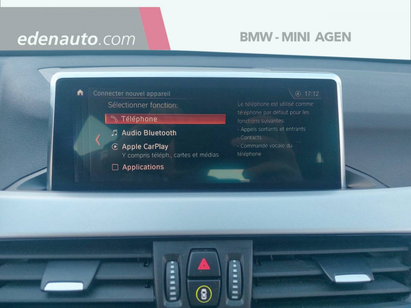 3ème feu stop / 6 haut-parleurs dont 2 caissons de basse sous les sièges avant, amplification 4 x 25w / Accoudoir central AV réglable sur 5 positions avec compartiment de rangement / Active Guard : avertisseur de collision AV avec fonction freinage ainsi que de collision avec protection active des piétons et des cyclistes / Airbags de tête AV et AR avec voile de protection contre les débris de verre / Aluminium Line satiné / Antenne aileron de requin / Attention Assist: Signale la perte de vigilance du conducteur / Autoradio BMW Professional avec écran couleur 6,5", 8 touches de favoris programmables et "Controller" iDrive avec touches de raccourci, compatibilité MP3, double Tuner RDS FM, info-route (TP), 6 HP dont 2 caissons de basse sous les sièges, amplification 4 x 25w / Avertisseur de risque de collision / BMW EfficientDynamics / Boîte à gants verrouillable éclairée / Boîte de vitesses automatique à double embrayage à 7 rapports / Buses de lave-glace chauffantes / Ceintures de sécuritéà 3 points d'ancrage à toutes les places avec limiteur d'effort / Clé radiocommandée à mémorisation automatique des réglages "Personal Profil" / Commande électrique du hayon / Construction allégée intelligente BMW Efficient Dynamics / Contrôle de la transmission / Contrôle Dynamique de Stabilité DSC+ avec fonctionnalités étendues (y compris assistant de démarrage en côte) / Crochets de fixation pour cintre (2 à l'AR) / Designation du modèle / Détecteur de pluie et allumage automatique des projecteurs / Diffuseurs aérodynamiques AV "Air Curtain" / Direction à assistance électrique BMW Efficient Dynamics / Direction Servotronic à assistance variable en fonction de la vitesse / Eclairage de l'habitacle à l'AV, à l'AR et dans le coffre / Ecrous de roues antivol / Eléments extérieurs (poignées de portes) couleur carrosserie / Equipements Fintion Business Design / Feux de stop dynamiques clignotants / Fonction d'arrêt et de redémarrage automatique du moteur BMW Efficient Dynamics / Fonction "Ma BMW à distance" (à vie) / Grilles de calandre cerclées de chrome avec 7 barreaux verticaux noirs / Indicateur de limitation de vitesse / Information Trafic en Temps Réel RTTI (3 ans) / Inserts décoratifs Oxidsilber mat soulignés de noir brillant / Interface Bluetooth avec fonction streaming audio / Jantes en alliage léger 18" (46 cm) style 579 Bicolores à rayons en Y 7.5Jx18" avec pneus 225/50 R18 / Kit de mobilité BMW / Kit de rangement / Lève-vitres AV/AR électriques avec commande par impulsion et sécurité enfants / Limiteur et régulateur de vitesse avec maintien de la vitesse en descente / Mesure individuelle de pression des pneumatiques / Montant B en noir brillant / Navigation multimédia Business / Notice d'utilisation de la voiture intégrée et carnet d'entretien électronique avec BMW Service History / Ordinateur de bord, Check Control et indicateur de température extérieure / Pack SimpliCity / Port USB avec connectivité iPod et prise AUX IN / Rails de toit Aluminium Line satiné / Respect de la norme EU6 BMW Efficient Dynamics / Rétroviseur intérieur électrochrome / Rétroviseurs extérieurs couleur carrosserie à réglages électriques et dégivrants, avec miroir asphérique côté conducteur / Sélecteur de mode de conduite - 3 modes : ECO PRO, Comfort, Sport / Sellerie Tissu Grid / Services Après-vente connectés BMW TeleServices / Seuils de porte avec inscription BMW / Sortie d'échappement simple à gauche, ronde et chromée, diamètre de 90 mm / Système anti-collision à basse vitesse / Système de récuperation de l'énergie au freinage BMW Efficient Dynamics / Tapis de sol en velours / Technologie BMW TwinPower Turbo avec injection directe common rail et turbocompresseur / Teinte de carrosserie métallisée / Touches multifonctions sur le volant / Triangle de présignalisation avec kit de premiers secours / Tuner DAB / Verrouillage automatique des portes dès 15km/h environ