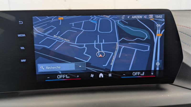 Prise 12 V dans la console centrale / Régulateur de vitesse avec fonction de freinage et limiteur de vitesse / Airbags de tête AV et aux places latérales AR / Alarme antivol / Déverrouillage électrique du coffre via la volet de coffre ou la clé radiocommandée / Détecteur de pluie et allumage automatique des projecteurs / BMW Live Cockpit Navigation Plus / 2 porte-gobelets sur la console centrale / Ciel de pavillon M Anthracite / Système de détection de somnolence / Suspension Adaptive M / Fonction Start&Stop avec système prédictif via la navigation / Système Hi-Fi 6 HP / Mesure individuelle de pression des pneumatiques avec 3 niveaux / Kit de mobilité BMW Bouteille de mastic pour pneumatiques - compresseur électrique 12 V (connexion à une prise 12V) / Shadow Line M brillant Entourage des vitres latérales, les baguettes de bas de glace, les montants centraux ainsi que les pourtours, pieds et triangles des rétroviseurs extérieurs en noir brillant / Rétroviseurs extérieurs couleur carrosserie avec rappels de clignotants intégrés / Accoudoir central AV avec compartiment de rangement / Jantes en alliage léger 18" style 975 M, à rayons doubles, bicolores Midnight Grey 8 J x 18 / pneus 225/45 R18. Montage chaînes à neige impossible. / Sellerie Alcantara / Similicuir Veganza Schwarz avec surpiqûres bleues / BMW "My Modes" (Personal/ Efficient/ Sport) / 2 ports USB Type C dans la console centrale + 2 à l'AR / Parking Assistant - Caméra de recul - Manoeuvres de stationnemment automatique en créneau et en bataille - Freinage automatique (PDC actif) en marche AR - Assistant de marche AR/Auto-reverse / Active Guard - Avertissement de sortie de voie - Avertissement de collision frontale avec intervention sur les freins - Avertissement de virage à gauche (véhicule) avec fonction de freinage - Indicateur de limitation de vitesse - Assistant d'évitement / Driving Assistant - Avertisseur de franchissement de ligne (>70km/h avec vibrations dans le volant) - Avertisseur d'angle mort (>20km/h avec voyant d'alerte) - Avertisseur de risque de collision AV (>15km/h, préconditionnment du freinage >50km/h, assistance au freinage) - Avertisseur de risque de collision AR (déclenchement automatique des warning) - Avertisseur de trafic transversal AR (Avertisseur en cas de circulation transversale détectée derrière la voiture) / Volant M gainé cuir (avec surpiqûres noires) Trois branches. Jante en cuir noir 'Walknappa', inserts chrome perlé et repose-pouce dans le volant. Logo M sur la base du volant / Lève-vitres AV et AR /