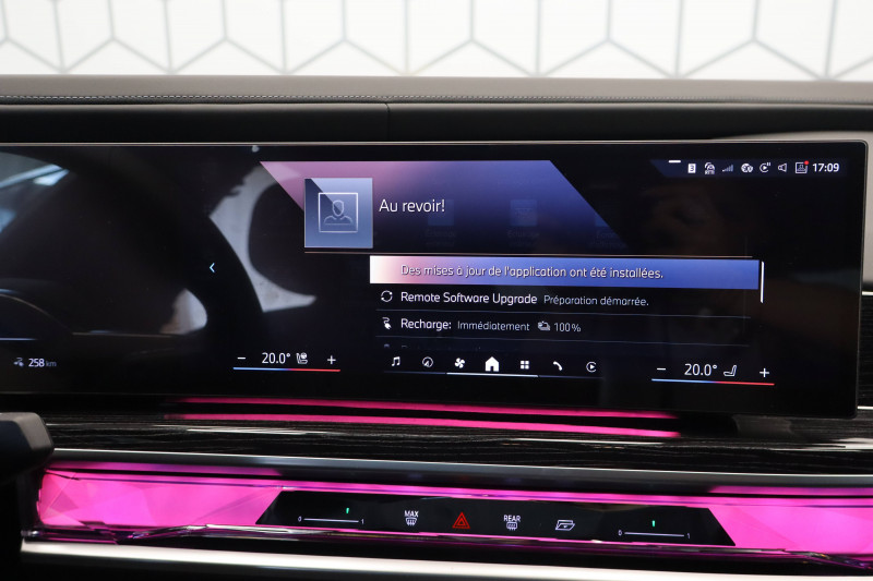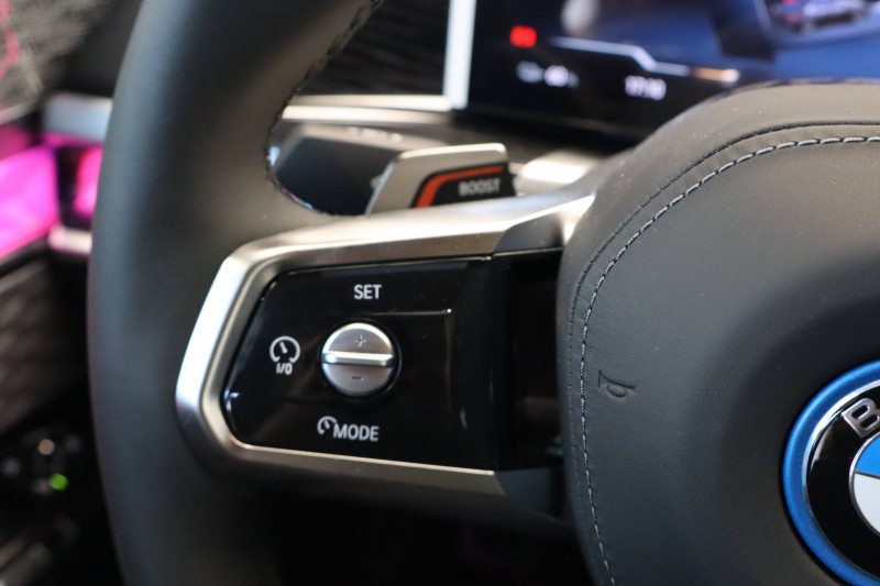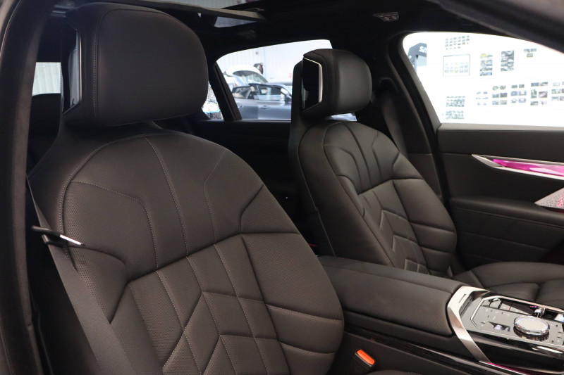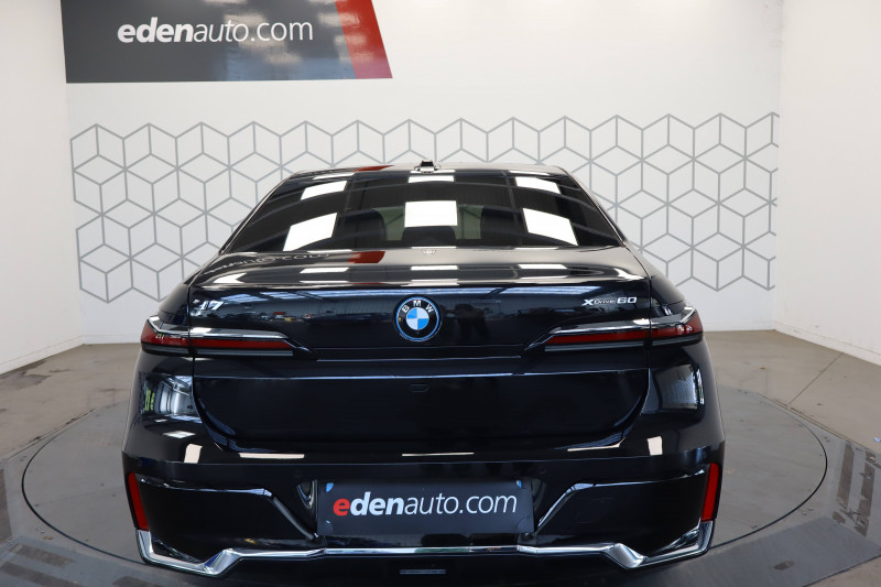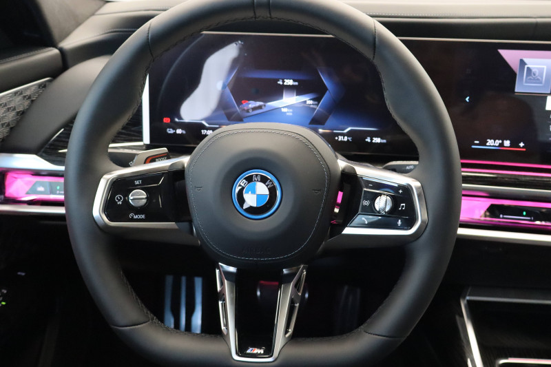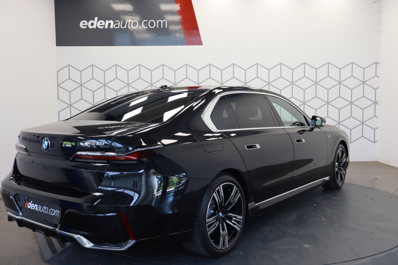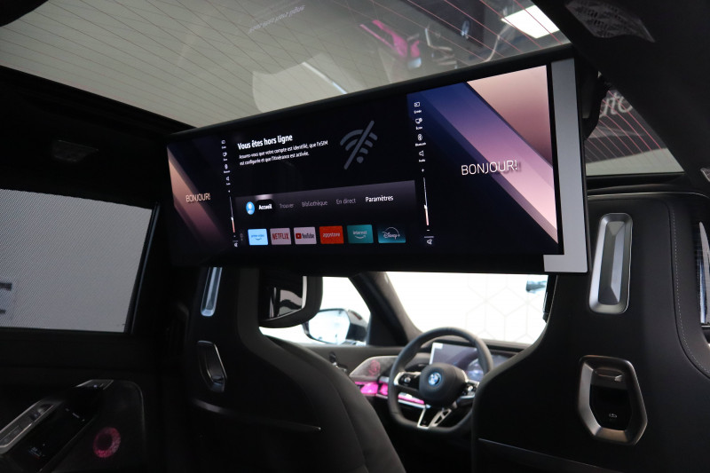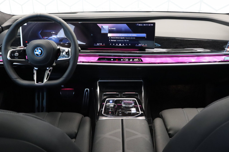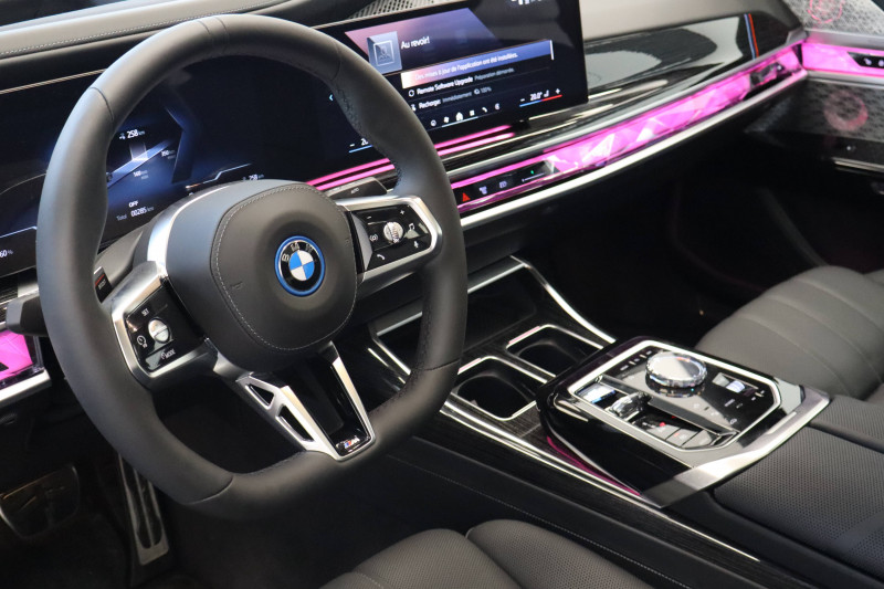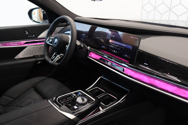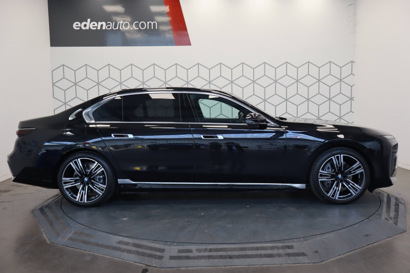3ème feu stop à LED / 5 sièges / ABS (système de freinage antiblocage) y compris assistant de freinage d'urgence en virage / Accès confort Ouverture et fermeture (des 4 portes et du hayon) et démarrage main libre, Mise en scène de bienvenue lors de l'approche du véhicule, Eclairage d'accueil lorsque le conducteur se situe à 2,5 m du véhicule, Déverrouillage automatique à partir de 0,5 m du véhicule, Verrouillage automatique lorsque le conducteur s'éloigne du véhicule, à partir de 3 m, Accès confort pour les deux clés de véhicule physiques. Inclus la BMW Digital Key Plus, Inclus la ''Key Card (carte clé)' / Active Guard Professionnal avec avertisseur de sortie de voie, de collision frontale avec intervention de freinage et affichage des limitations de vitesse (Speed Limit Info) et interdiction de dépassement / Airbag central (siège conducteur) / Airbags de tête (rideaux) pour le 1er et le 2e rang de sièges / Alarme antivol Pour la surveillance des portes, du capot moteur et du hayon, y compris capteur de mouvement intérieur, capteur d'inclinaison et sirène avec une alimentation de secours / Appel d'Urgence Intelligent (durée de vie de la voiture) Appel automatique vers le centre d'assistance BMW en cas d'accident. Touche SOS pour Appel d'Urgence manuel. Les données importantes sont automatiquement transmises aux secours : identification et localisation de la voiture, nombre de passagers à bord, statuts des airbags. Ce service utilise la carte SIM montée d'usine et ne requiert pas l'utilisation du smartphone. / Appui lombaire ajustable pour le conducteur / Assistant d'attention avec analyse du comportement de conduite du conducteur : détection somnolence, recommandation de pause / Avertisseur 2 tons / Avertisseur sonore pour piétons / BMW eDrive (Système de récupération de l'énergie au freinage Brake Energy Regeneration jusqu'au "One Pedal Feeling", Capacité de la batterie haute tension Lithium-ion : 105,7 kWh brute (101,7 kWh nette) / 281 Ah / 376 V, Chargeur embarqué DC sur prise CCS : 195 kW (puissance de recharge maximale), Gestion thermique de la batterie pour une recharge rapide en courant continu, Préconditionnement de la température de la batterie pour charge rapide CC optimisée) / BMW IconicSounds Electric . / BMW ID / BMW iDrive / BMW Interaction Bar en verre à effet cristal, avec rétro-éclairage dynamique en 15 couleurs et effets lumineux / BMW Live Cockpit Navigation Pro (Affichage Tête Haute HUD en couleur et Réalité Augmentée) BMW Curved Display, Affichage tête haute HUD en couleur, Guidage intéractif avec "Réalité Augmentée", Mémorisation des réglages dans les profils conducteur, Profil conducteurOpérations tactiles sur l'écran central, Système d'exploitation BMW Operating System 8, Controller iDrive Touch, BMW Intelligent Personal Assistant, Éléments de commande pour l'affichage des écrans, l'audio et la téléphonie sur le volant multifonction, Nouveau dispositif My Modes, BMW Maps, Interface Bluetooth / BMW Natural Interaction Des gestes simples tels que balayer ou pointer sont reconnus dans la zone de détection au-dessus de la console centrale avant, permettent par exemple d'accepter ou rejeter un appel téléphonique. Le volume peut également être réglé en tournant l'index. / BMW Touch Command : panneaux de commande tactiles intégrés dans les portes AR / Boîte à gants à ouverture électrique / Bouton de démarrage du moteur Start/Stop sans manipulation de la clé / Buses de lave-glace chauffantes intégrées aux balais d'essuie-glace / Câble de recharge Professionnel Mode 3 (T2-T2) pour la recharge publique - 5 mètres Câble de recharge Professionnel de Mode 3 triphasé avec prises Type 2 - Type 2 destinéà la recharge sur bornes publiques ou privées. Peut être utilisé sur une borne de recharge raccordée en courant monophasé ou triphasé avec des puissances de charge maximales : 7,4 kW / 32 A (en monophasé) et de 22 kW / 32 A (en triphasé). Rangement dans le coffret à câbles sous le cache du compartiment à bagages. Couleur Gris basalte. / Calandre illuminée ''BMW Iconic Glow'' Mise en valeur de la calandre BMW avec un éclairage de son contour, Actif lorsque la voiture est à l'arrêt et en roulant, Désactivation possible / Chargeur rapide AC Pro 22kW / Clés radiocommandées à mémorisation automatique des réglages "Personal Profile" (x 2) / Climatisation automatique 4 zones Régulation de la température séparée, Aérateurs invisibles mais très efficaces, Réglage du débit d'air et de la répartition d'air séparément, Mode de fonctionnement intelligent (Aura), Programme automatique, Refroidissement maximum (climatisation MAX AC) pour conducteur et passager AV, Capteur de condensation et capteur solaire, Microfiltre et filtre à charbon actif, Pré-ventilation avec minuterie ou à démarrage immédiat, Filtre à nanoparticules pour air frais et air recyclé dans l'habitacle / Commande électrique du volet de coffre / Compartiment à bagages avec crochets pour sacs, oeillets d'arrimage et éclairage / Connexion USB type C : x 2 dans l'accoudoir central AV (transmission de données + recharge 15W) et x 2 à l'AR (recharge 45W) / Coussin de confort dans le siège multifonction/fauteuil capitaine / Dalle de recharge par induction Chargement sans fil par induction des appareils positionnés dans le plateau, utilisant la norme de charge «Qi», Interface NFC avec le véhicule, Refroidissement actif de l'appareil intégré, 2ème plateau de charge sans fil à l'arrière avec console arrière Executive Lounge. / Désignation du modèle "i7" sur le hayon, à gauche et "eDrive60" à droite, teinte Silver / Détecteur de pluie et allumage automatique des projecteurs / Direction à assistance électrique Servotronic / Direction ActiveDrive à 4 roues directrices / Driving Assistant Avertisseur d'angle mort et de changement de voie, Avertisseur de trafic transversal AR, Avertisseur de risq