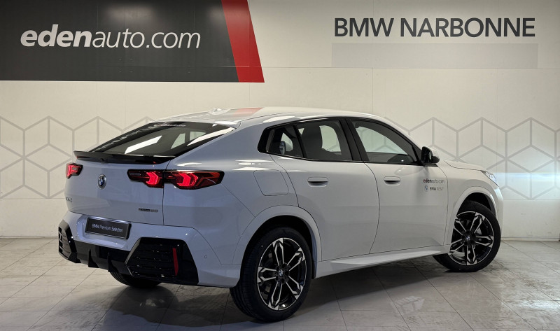 2 porte-gobelets sur la console centrale / 3ème feu stop LED intégré au hayon AR / 5 places / Accoudoir central AV avec panneau de commande intégré / Active Guard Avertissement de franchissement de ligne. Avertisseur de collision frontale. Avertisseur de présence d'un véhicule lors d'un changement de direction vers la gauche. Avertisseur d'intersection. Avertisseur présence piéton/cycliste lors d'un virage en intersection. Assistance de limitation de vitesse. Assistance d'évitement en cas de risque de collision frontale / Aides au stationnement Parking Assistant - Radars de stationnement AV et AR - Caméra de recul - Manoeuvres de stationnemment automatique en créneau et en bataille - Freinage automatique en marche AR - Assistant de marche AR/Auto-reverse / Airbag entre les deux sièges AV en cas de collision latérale / Airbag passager AV désactivable via la clé / Airbags de tête à l'AV et aux places latérales AR / Alarme antivol Surveillance des portes, coffre et capot moteur, protection de l'habitacle, détecteur de soulèvement et sirène. / Appel d'Urgence Intelligent (durée de vie de la voiture) Appel automatique vers le centre d'assistance BMW en cas d'accident. Touche SOS pour Appel d'Urgence manuel. Les données importantes sont automatiquement transmises aux secours : identification et localisation de la voiture, nombre de passagers à bord, statuts des airbags. Ce service utilise la carte SIM montée d'usine et ne requiert pas l'utilisation du smartphone. / Assistant dynamique de motricité (DTC) / BMW Digital (BMW Maps, RTTI sur itinéraire, Apple CarPlay, Android Auto, BMW Intelligent Personal Assistant) / BMW EfficientDynamics Système de récupération de l'énergie au freinage, Fonction d'arrêt et de redémarrage automatique du moteur, Direction à assistance électrique Servotronic (assistance variable selon la vitesse) / BMW Live Cockpit Navigation Plus avec Écran BMW Curved Display / Boîte automate à fonction continue / Buse de lave-glace pour caméra de recul / Câble de recharge Professionnel Mode 3 (T2-T2) pour la recharge publique - 5 mètres / Capteur d'impact (Activation de l'airbag, des feux de détresse, de l'éclairage intérieur, Déverrouillage des portes, Activation de la borne batterie de sécurité) / Carte BMW Charging / Carte SIM 4G LTE pour les Services BMW ConnectedDrive / Ceintures de sécurité 3 points pour toutes les places / Ciel de pavillon M Anthracite / Clés radiocommandées à mémorisation automatique des réglages "Personal Profile" (x 2) / Clignotants LED intégrés aux feux de jour / Commande électrique du hayon / Compartiment à bagages : 2 crochets de sac, filet sur panneau gauche, prise 12V rangement additionel (volume spécifique au modèle) sous plancher amovible / Console centrale avec insert noir brillant / Contrôle de freinage en courbe CBC / Contrôle de stabilité dynamique (DSC) avec dotation élargie / Contrôle dynamique du freinage (DBC) / Désignation du modèle "X2" sur le hayon à gauche et version à droite / Détecteur de pluie et allumage automatique des projecteurs / Eclairage de bienvenue autour du véhicule / Eclairage de plaque d'immatriculation à LED / Ecran BMW Curved Display / Eléments extérieurs M Sport / Eléments intérieurs M Sport / Feux AR à LED intégrant les clignotants / Feux de sortie de porte AV (porte ouverte) / Fixations ISOFIX / i-Size pour les deux sièges AR extérieurs / Fonction cargo : Réglage de l'inclinaison de la banquette AR à 12 degrés (volume de chargement supplémentaire d' environ 85-100 litres) / Fonctionnalité "Follow Me Home" (éclairage d'accompagnement) : les feux de croisement restent allumés quelques instants une fois le contact coupé / Freinage de séchage / Frein de parking électromécanique avec fonction "Automatic Hold" / Grilles de calandre façon Mesh Effect avec contour cerclées de chrome / Inserts décoratifs Aluminium M Hexacube clair / Jantes en alliage léger 19" style 871 M 8 J x 19 / pneus 245/45 R 19 Gris foncé. Bicolore Montage chaînes à neige impossible. / Kit de mobilité Plus - Bouteille avec liquide anti-crevaison - Compresseur avec alimentation autonome via batterie rechargeable - Système se fixant au centre de la jante avec maintient de pression automatique du pneu crevé durant la conduite - Simple d'utilisation et réduction du temps passé sur le lieu de la panne / Kit éclairage : Lampes de courtoisie, Eclairage intérieur de l'accoudoir central AV, Eclairage habitacle AV et AR, éclairage plancher AV et AR, éclairage du miroir de courtoisie , lampes de lecture centrales, éclairage du coffre à bagages sur un côté / Kit rangement - bac de rangement dans les portes AV et AR avec porte-bouteille - compartiment de rangement central - compartiment de rangement avec couvercle rabattable sous l'accoudoir central AV - crochets de vêtements AR / Lève-vitres AV/AR électriques avec commande par impulsion et sécurité enfants / Logo BMW avec cerclage bleu sur le capot et le hayon / Mesure individuelle de pression des pneumatiques / My Modes: 5 modes de conduite (Personnel, Efficient, Sport, Relax, Expressive) / Norme General Safety Regulation 2 (GSR2) / Notice d'utilisation de la voiture intégrée et carnet d'entretien électronique avec BMW Service History / Ordinateur de bord avec Check-Control et indicateur de température extérieure / Performance control : contrôle du moteur et interventions freinage pour améliorer l'agilité et la neutralité en virage / Personal eSIM Personal eSIM est la version électronique, intégrée au véhicule, de la carte SIM traditionnelle. Vous l'utilisez via un abonnement souscrit auprès d'un opérateur téléphonique et transformez ainsi votre BMW en périphérique mobile supplémentaire : - Connectivité en 5G - Meilleure qualité de connexion grâce aux antennes de la voiture - Connexion Hotspot Wi-Fi avec la possibilité de connecter jusqu'à 10 appareils (ex : tablette numé