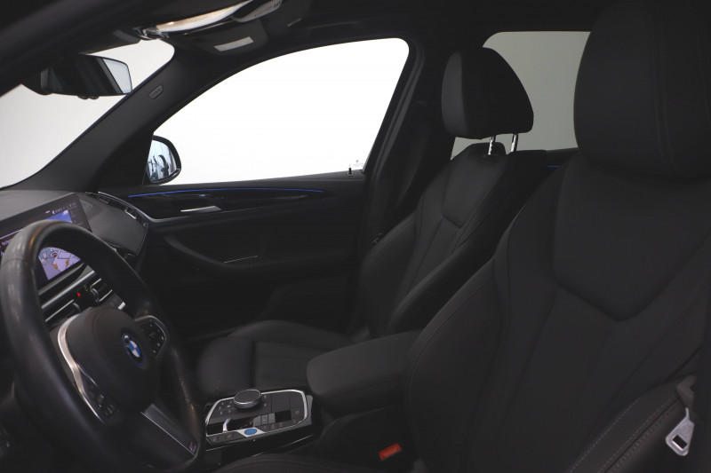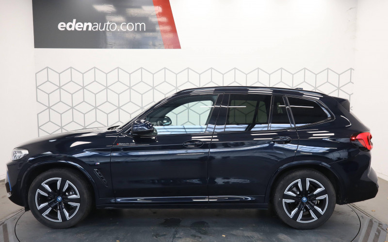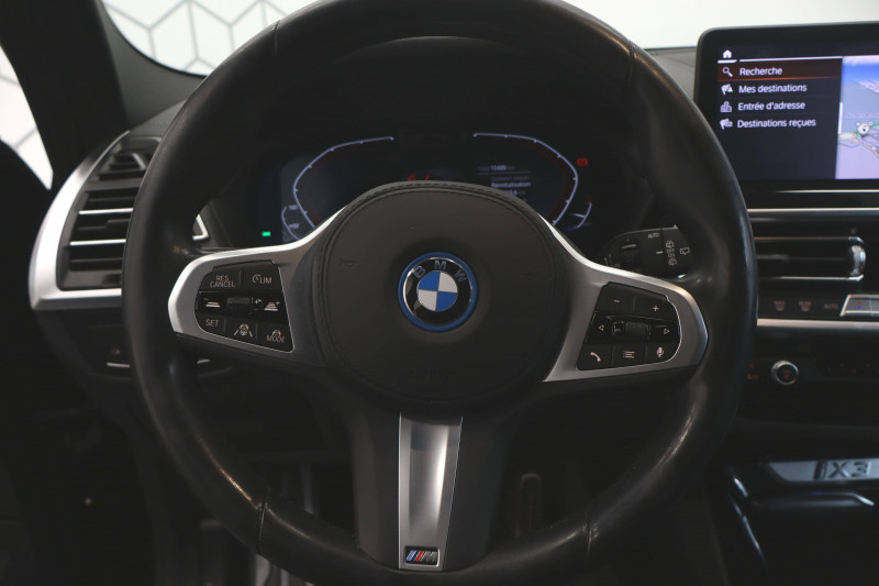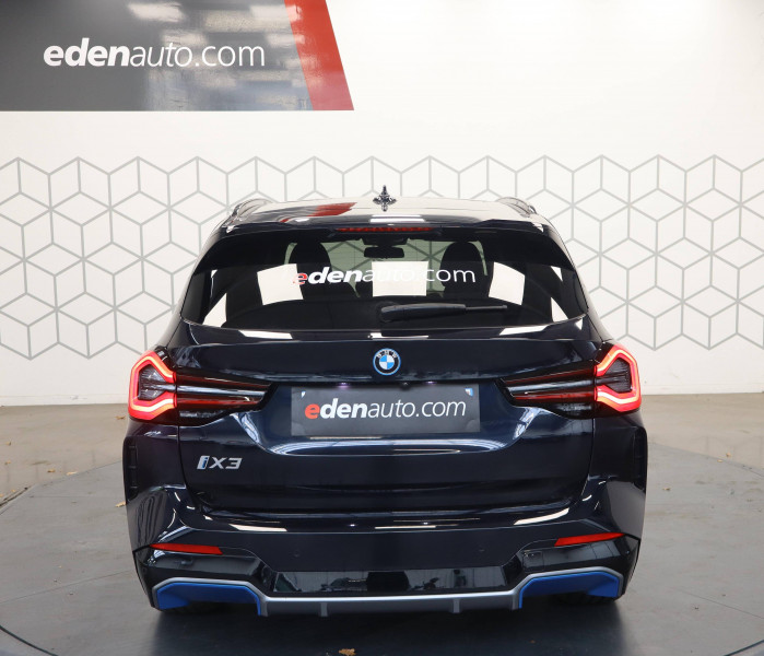 3ème feu stop à LED / 5 sièges / AC charging - DC charging BMW EfficientDynamics / Alarme antivol / Anneau bleu autour des logos BMW / Antenne "aileron de requin" / Appel d'Urgence Intelligent (durée de vie de la voiture) / Application galvanisée / Attention Assist : signale la perte de vigilance du conducteur / Autoradio BMW Professional, 7 touches de favoris programmables et "Controller" iDrive avec touches de raccourci, double Tuner RDS FM, info-route (TP) / Avertisseur sonore pour piétons / Batterie Haute tension lithium-ion BMW EfficientDynamics / BMW Live Cockpit Navigation Pro / Bouclier AV au design spécifique iX3 / Bouton de démarrage Start/Stop sans manipuler la clé / Buses de lave-glace chauffantes / Câble de recharge Professionnel Mode 3 (T2-T2) pour la recharge publique / Calandre au design spécifique iX3 avec apparence fermée / Capteur de collision / Ciel de pavillon M anthracite / Clés radiocommandées à mémorisation automatique des réglages "Personal Profile" / Commande électrique du hayon / Connectivité avancée avec recharge sans fil par induction / Contrôle Dynamique de la Traction (DTC) et Contrôle Dynamique de Stabilité (DSC) / Désignation du modèle / Détecteur de pluie et allumage automatique des projecteurs / Déverrouillage électrique du hayon via la poignée ou la clé radiocommandée / Diffuseur aérodynamique AV "Air breathers" en chrome perlé avec logo BMW i / Diffuseur AR bleu / Direction à assistance électrique Servotronic BMW EfficientDynamics / Driving Assistant Professional / Eclairage d'ambiance / Eclairage de bienvenue / Ecrous de roues antivol / Eléments extérieurs (poignées de portes) couleur carrosserie / Feux de route anti-éblouissement / Feux de stop dynamiques clignotants / Filet de séparation du coffre / Fonctionnalité de pré-conditionnement (Processus manuel dans le système de navigation) / Freins à disques ventilés AV/AR / Hotspot WiFi / Inclinaison des dossiers des sièges AR / Inserts décoratifs brillants "Schwarz" souligné de chrome perlé / Jantes en alliage 19" aerodynamiques style 842 bicolores 8Jx19" pneus 245/50 R19, comprend écrous antivol de roues / Kit de mobilité BMW / Kit rangement / Lève-vitres AV/AR électriques avec commande par impulsion et sécurité enfants / Ligne Inspiring / Limiteur et régulateur de vitesse avec maintien de la vitesse en descente / Machine électrique BMW EfficientDynamics / Mesure individuelle de pression des pneumatiques / Norme GSR 2 (General Safety Regulation) / Notice d'utilisation de la voiture intégrée et carnet d'entretien électronique avec BMW Service History / Pack Advanced Full LED Technologie et design des feux LED avec fonctions d'éclairage étendues pour une visibilité améliorée : - feux de route anti-éblouissement (BMW Selective Beam) - couleur de lumière analogue à la lumière du jour - éclairage optimal homogène de la chaussée / Pack aérodynamique M / Pack Connected Professional Fonctions "Ma BMW à distance" (durée indéfinie) Remote 3D View (Vue 3D à distance) (3 ans) In-Car Experiences (3 ans) Connected Navigation (3 ans) Information Trafic en Temps Réel (RTTI) (3 ans) Smartphone intégration (durée illimitée) Connected Music (3 ans) Amazon Alexa (3 ans) / Pare-chocs déformables / Park Assist / Planche de bord en Similicuir Sensatec, noir / Protection Active des occupant / Protection active des piétons / Protection contre les chocs latéraux / Rails de toit Shadow Line M brillant / Rétroviseur intérieur électrochrome / Rétroviseurs extérieurs couleur carrosserie à réglages électriques et dégivrants, miroir asphérique côté conducteur, rappels de clignotants intégrés / Rétroviseurs extérieurs électrochromes (côté conducteur) et rabattables électriquement Y compris fonction de basculement automatique du rétroviseur ext. droit en marche AR / Sellerie Simili-Cuir Sensatec perforé / Services Après-vente connectés BMW Teleservices (durée de vie de la voiture) / Services ConnectedDrive - Apps véhicule (3 ans) / Shadow Line M brillant / Sièges AV chauffants Chauffage : des assises, des dossiers et des joues de siège. Fonction de chauffage rapide / Sièges AV électriques à mémoires conducteur / Suspension SelectDrive / Système de récupération avec 4 niveaux sélectionnables (adpative, high, medium, low) / Système de récupération de l'énergie au freinage BMW EfficientDynamics / Système Hi-Fi avec 6 HP / Tapis de sol en velours / Teinte de carrosserie métallisée / Toit ouvrant panoramique en verre / Touches multifonctions sur le volant / Trappe de chargement / Triangle de présignalisation avec kit de premiers secours / Tuner DAB / Vitrage avec protection contre la chaleur