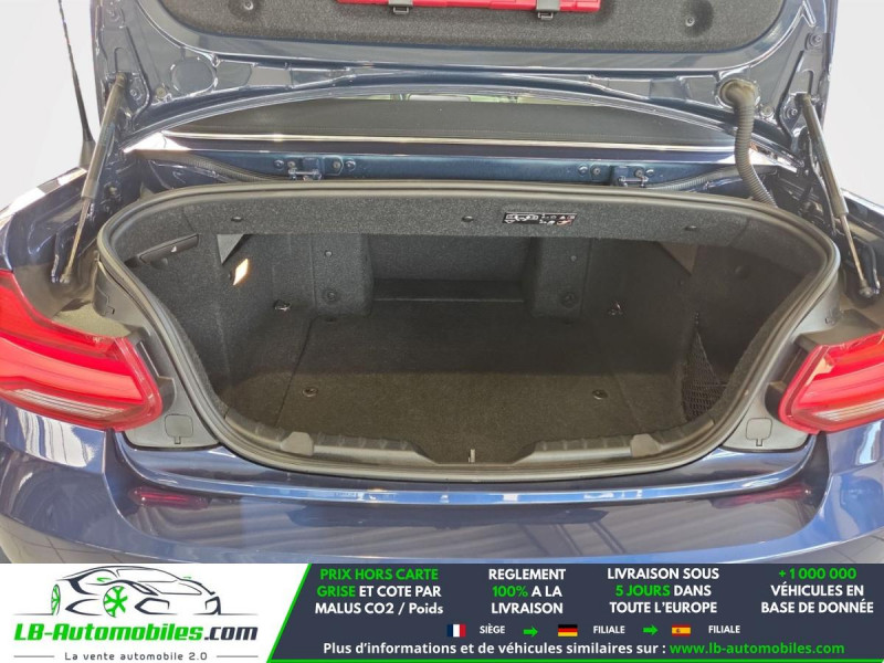 Référence : 1190860 Vos Avantages chez LB-AUTOMOBILES.com / Prix affiché TTC Livré hors carte grise / Livraison sous 10 jours dans toute la France hors 31 / Pas d?avance de frais paiement du véhicule 100% à la livraison par virement. BMW Série 2 Cabriolet Neuf remisée, BMW Série 2 Cabriolet Occasion Toulouse Beaupuy 31850, BMW Série 2 Cabriolet Véhicule sorti de réseau collaborateur, BMW Série 2 Cabriolet import, BMW Série 2 Cabriolet importateur, BMW Série 2 Cabriolet Livraison possible dans toute la France sous 5 jours, BMW Série 2 Cabriolet, BMW Série 2 Cabriolet Location Option Achat, BMW Série 2 Cabriolet LLD, BMW Série 2 Cabriolet Longue Durée, BMW Série 2 Cabriolet TVA récupérable. Possibilité d'extension de garantie 12, 24,36 mois, Pour tout autres voitures import neufs ou occasions collaborateur fortement remisée, Mandataire Audi, Mandataire BMW, Mandataire Volkswagen, Mandataire Mercedes, Mandataire Peugeot Espagne, Mandataire Renault Espagne, Porsche import, Mandataire Citroën Espagne, Mandataire Seat Espagne, n'hésitez pas à nous contacter. « Sous réserve de vente préalable et erreur de saisie » Principaux équipements : - ABS - Accoudoir - Antidémarrage - Assistance de démarrage en côte - Assistant feux de route - Bluetooth - Capteur de lumière - Capteur de pluie - Carnet d'entretien - Contrôle de la pression des pneus - Direction assistée - Éclairage d'ambiance - ESP - Fermeture centralisée - Feux de jour LED - Garantie - GPS - Grille de protection pour coffre - Isofix - Jantes alliage - Kit de préparation pour système de navigation - Kit mains libres - Lecteur CD - Ordinateur de bord - Package hiver - Phare antibrouillard - Phares LED - Pneus été - Port USB - Propulsion - Radio DAB - Régulateur de vitesse - Rétroviseur extérieur électrique - Rétroviseur intérieur anti-éblouissement automatique - Sièges chauffants - Support lombaire - Système antipatinage - Système d'appel d'urgence - Système de limitation de la vitesse - Système de reconnaissance des panneaux de signalisation - Système Stop & Start - Tuner/radio - Véhicule non-fumeur - Verrouillage centralisé sans clé - Vitres électriques - Volant en cuir - Volant multifonction